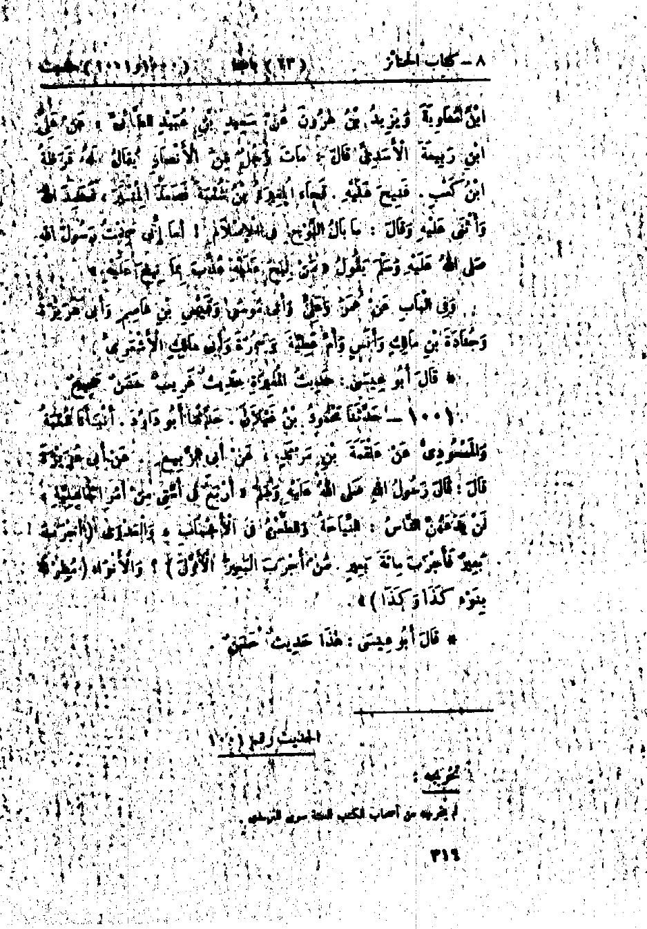 1001 - حَدَّثَنَا مَحْمُودُ بْنُ غَيْلَانَ قَالَ: حَدَّثَنَا أَبُو دَاوُدَ قَالَ: أَخْبَرَنَا شُعْبَةُ، وَالمَسْعُودِيُّ، عَنْ عَلْقَمَةَ بْنِ مَرْثَدٍ، عَنْ أَبِي الرَّبِيعِ، عَنْ أَبِي هُرَيْرَةَ، قَالَ: قَالَ رَسُولُ اللَّهِ صَلَّى اللَّهُ عَلَيْهِ وَسَلَّمَ: " §أَرْبَعٌ فِي أُمَّتِي مِنْ أَمْرِ الجَاهِلِيَّةِ لَنْ يَدَعَهُنَّ النَّاسُ: النِّيَاحَةُ، وَالطَّعْنُ فِي الأَحْسَابِ، وَالعَدْوَى أَجْرَبَ بَعِيرٌ فَأَجْرَبَ مِائَةَ بَعِيرٍ مَنْ أَجْرَبَ البَعِيرَ الأَوَّلَ، وَالأَنْوَاءُ مُطِرْنَا بِنَوْءٍ كَذَا وَكَذَا ": «هَذَا حَدِيثٌ حَسَنٌ»