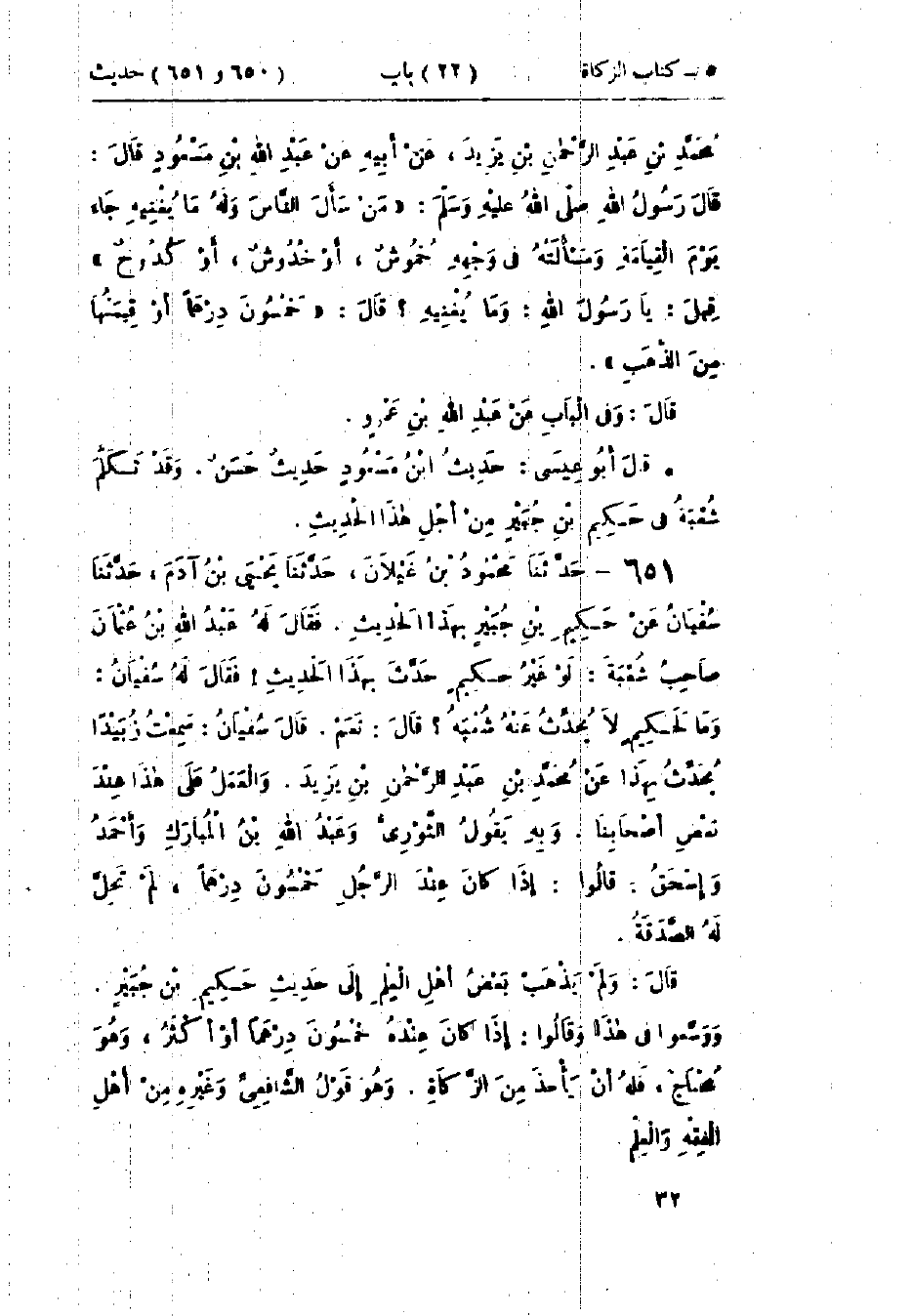 651 - حَدَّثَنَا مَحْمُودُ بْنُ غَيْلَانَ قَالَ: حَدَّثَنَا يَحْيَى بْنُ آدَمَ قَالَ: حَدَّثَنَا سُفْيَانُ، عَنْ حَكِيمِ بْنِ جُبَيْرٍ بِهَذَا الحَدِيثِ، فَقَالَ لَهُ عَبْدُ اللَّهِ بْنُ عُثْمَانَ صَاحِبُ شُعْبَةَ: لَوْ غَيْرُ حَكِيمٍ حَدَّثَ بِهَذَا، فَقَالَ لَهُ سُفْيَانُ: وَمَا لِحَكِيمٍ لَا يُحَدِّثُ عَنْهُ شُعْبَةُ؟ قَالَ: نَعَمْ، قَالَ سُفْيَانُ: سَمِعْتُ زُبَيْدًا يُحَدِّثُ بِهَذَا، عَنْ مُحَمَّدِ بْنِ عَبْدِ الرَّحْمَنِ بْنِ يَزِيدَ، " وَالعَمَلُ عَلَى هَذَا عِنْدَ بَعْضِ أَصْحَابِنَا، وَبِهِ يَقُولُ الثَّوْرِيُّ، وَعَبْدُ اللَّهِ بْنُ المُبَارَكِ، وَأَحْمَدُ، وَإِسْحَاقُ قَالُوا: إِذَا كَانَ عِنْدَ الرَّجُلِ خَمْسُونَ دِرْهَمًا لَمْ تَحِلَّ لَهُ الصَّدَقَةُ «،» وَلَمْ يَذْهَبْ بَعْضُ أَهْلِ العِلْمِ إِلَى حَدِيثِ حَكِيمِ بْنِ جُبَيْرٍ، وَوَسَّعُوا فِي هَذَا، وَقَالُوا: إِذَا كَانَ عِنْدَهُ خَمْسُونَ دِرْهَمًا، أَوْ أَكْثَرُ وَهُوَ مُحْتَاجٌ، فَلَهُ أَنْ يَأْخُذَ مِنَ الزَّكَاةِ، وَهُوَ قَوْلُ الشَّافِعِيِّ، وَغَيْرِهِ مِنْ أَهْلِ الفِقْهِ وَالعِلْمِ "