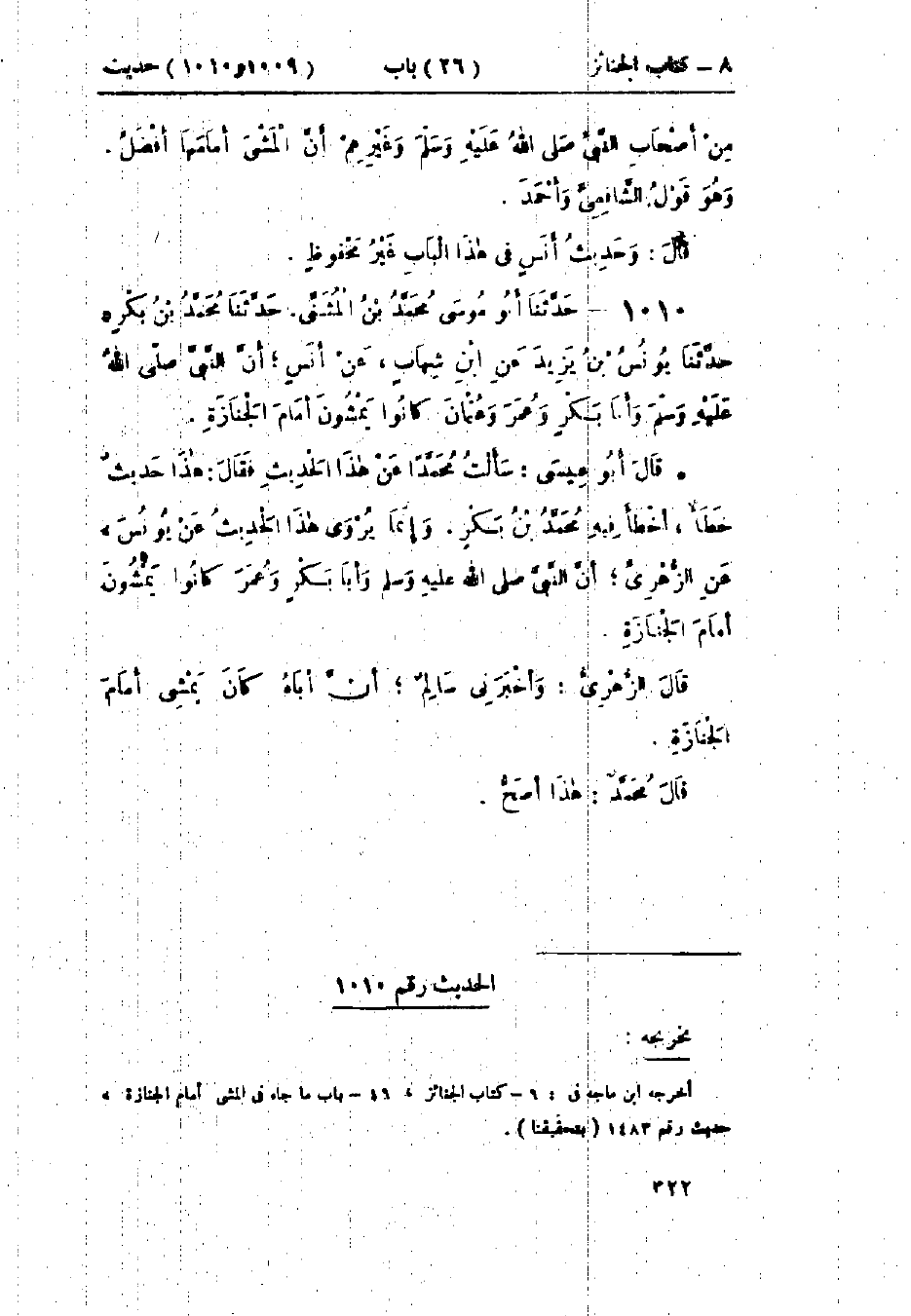 1010 - حَدَّثَنَا أَبُو مُوسَى مُحَمَّدُ بْنُ المُثَنَّى قَالَ: حَدَّثَنَا مُحَمَّدُ بْنُ بَكْرٍ قَالَ: حَدَّثَنَا يُونُسُ بْنُ يَزِيدَ، عَنْ ابْنِ شِهَابٍ، عَنْ أَنَسٍ، «أَنَّ النَّبِيَّ صَلَّى اللَّهُ عَلَيْهِ وَسَلَّمَ، وَأَبَا بَكْرٍ، وَعُمَرَ، وَعُثْمَانَ، كَانُوا §يَمْشُونَ أَمَامَ الجَنَازَةِ».: سَأَلْتُ مُحَمَّدًا عَنْ هَذَا الحَدِيثِ، فَقَالَ: هَذَا حَدِيثٌ خَطَأٌ أَخْطَأَ فِيهِ مُحَمَّدُ بْنُ بَكْرٍ، وَإِنَّمَا يُرْوَى هَذَا الحَدِيثُ عَنْ يُونُسَ، عَنِ الزُّهْرِيِّ «أَنَّ النَّبِيَّ صَلَّى اللَّهُ عَلَيْهِ وَسَلَّمَ، وَأَبَا بَكْرٍ، وَعُمَرَ، كَانُوا يَمْشُونَ أَمَامَ الجَنَازَةِ». قَالَ الزُّهْرِيُّ: وَأَخْبَرَنِي سَالِمٌ: أَنَّ أَبَاهُ كَانَ يَمْشِي أَمَامَ الجَنَازَةِ. قَالَ مُحَمَّدٌ: «هَذَا أَصَحُّ»