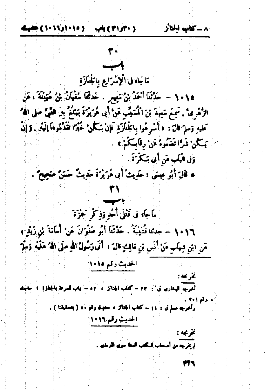 1016 - حَدَّثَنَا قُتَيْبَةُ قَالَ: حَدَّثَنَا أَبُو صَفْوَانَ، عَنْ أُسَامَةَ بْنِ زَيْدٍ، عَنْ ابْنِ شِهَابٍ، عَنْ أَنَسِ بْنِ مَالِكٍ قَالَ: أَتَى رَسُولُ اللَّهِ صَلَّى اللَّهُ عَلَيْهِ وَسَلَّمَ -[327]- عَلَى حَمْزَةَ يَوْمَ أُحُدٍ، فَوَقَفَ عَلَيْهِ فَرَآهُ قَدْ مُثِّلَ بِهِ، فَقَالَ: «§لَوْلَا أَنْ تَجِدَ صَفِيَّةُ فِي نَفْسِهَا، لَتَرَكْتُهُ حَتَّى تَأْكُلَهُ العَافِيَةُ، حَتَّى يُحْشَرَ يَوْمَ القِيَامَةِ مِنْ بُطُونِهَا»، قَالَ: ثُمَّ دَعَا بِنَمِرَةٍ، فَكَفَّنَهُ فِيهَا، فَكَانَتْ إِذَا مُدَّتْ عَلَى رَأْسِهِ بَدَتْ رِجْلَاهُ، وَإِذَا مُدَّتْ عَلَى رِجْلَيْهِ بَدَا رَأْسُهُ، قَالَ: فَكَثُرَ القَتْلَى، وَقَلَّتِ الثِّيَابُ، قَالَ: فَكُفِّنَ الرَّجُلُ وَالرَّجُلَانِ وَالثَّلَاثَةُ فِي الثَّوْبِ الوَاحِدِ، ثُمَّ يُدْفَنُونَ فِي قَبْرٍ وَاحِدٍ، فَجَعَلَ رَسُولُ اللَّهِ صَلَّى اللَّهُ عَلَيْهِ وَسَلَّمَ يَسْأَلُ عَنْهُمْ: «أَيُّهُمْ أَكْثَرُ قُرْآنًا»، فَيُقَدِّمُهُ إِلَى القِبْلَةِ، قَالَ: فَدَفَنَهُمْ رَسُولُ اللَّهِ صَلَّى اللَّهُ عَلَيْهِ وَسَلَّمَ وَلَمْ يُصَلِّ عَلَيْهِمْ: «حَدِيثُ أَنَسٍ حَدِيثٌ غَرِيبٌ لَا نَعْرِفُهُ مِنْ حَدِيثِ أَنَسٍ إِلَّا مِنْ هَذَا الوَجْهِ»، " النَّمِرَةُ: الكِسَاءُ الخَلَقُ "، وَقَدْ خُولِفَ أُسَامَةُ بْنُ زَيْدٍ فِي رِوَايَةِ هَذَا الحَدِيثِ، فَرَوَى اللَّيْثُ بْنُ سَعْدٍ، عَنْ ابْنِ شِهَابٍ، عَنْ عَبْدِ الرَّحْمَنِ بْنِ كَعْبِ بْنِ مَالِكٍ، عَنْ جَابِرِ بْنِ عَبْدِ اللَّهِ بْنِ زَيْدٍ، وَرَوَى مَعْمَرٌ، عَنِ الزُّهْرِيِّ، عَنْ عَبْدِ اللَّهِ بْنِ ثَعْلَبَةَ، عَنْ جَابِرٍ، وَلَا نَعْلَمُ أَحَدًا ذَكَرَهُ، عَنِ الزُّهْرِيِّ، عَنْ أَنَسٍ إِلَّا أُسَامَةَ بْنَ زَيْدٍ، وَسَأَلْتُ مُحَمَّدًا عَنْ هَذَا الحَدِيثِ، فَقَالَ: «حَدِيثُ اللَّيْثِ، عَنْ ابْنِ شِهَابٍ، عَنْ عَبْدِ الرَّحْمَنِ بْنِ كَعْبِ بْنِ مَالِكٍ، عَنْ جَابِرٍ أَصَحُّ»