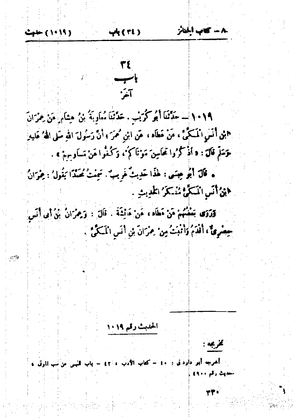 1019 - حَدَّثَنَا أَبُو كُرَيْبٍ قَالَ: حَدَّثَنَا مُعَاوِيَةُ بْنُ هِشَامٍ، عَنْ عِمْرَانَ بْنِ أَنَسٍ المَكِّيِّ، عَنْ عَطَاءٍ، عَنْ ابْنِ عُمَرَ، أَنَّ رَسُولَ اللَّهِ صَلَّى اللَّهُ عَلَيْهِ وَسَلَّمَ قَالَ: «§اذْكُرُوا مَحَاسِنَ مَوْتَاكُمْ، وَكُفُّوا عَنْ مَسَاوِئِهِمْ»: «هَذَا حَدِيثٌ غَرِيبٌ». سَمِعْتُ مُحَمَّدًا يَقُولُ: «عِمْرَانُ بْنُ أَنَسٍ المَكِّيُّ مُنْكَرُ الحَدِيثِ»، وَرَوَى بَعْضُهُمْ، عَنْ عَطَاءٍ، عَنْ عَائِشَةَ. وَعِمْرَانُ بْنُ أَبِي أَنَسٍ مِصْرِيٌّ أَقْدَمُ وَأَثْبَتُ مِنْ عِمْرَانَ بْنِ أَنَسٍ المَكِّيِّ
