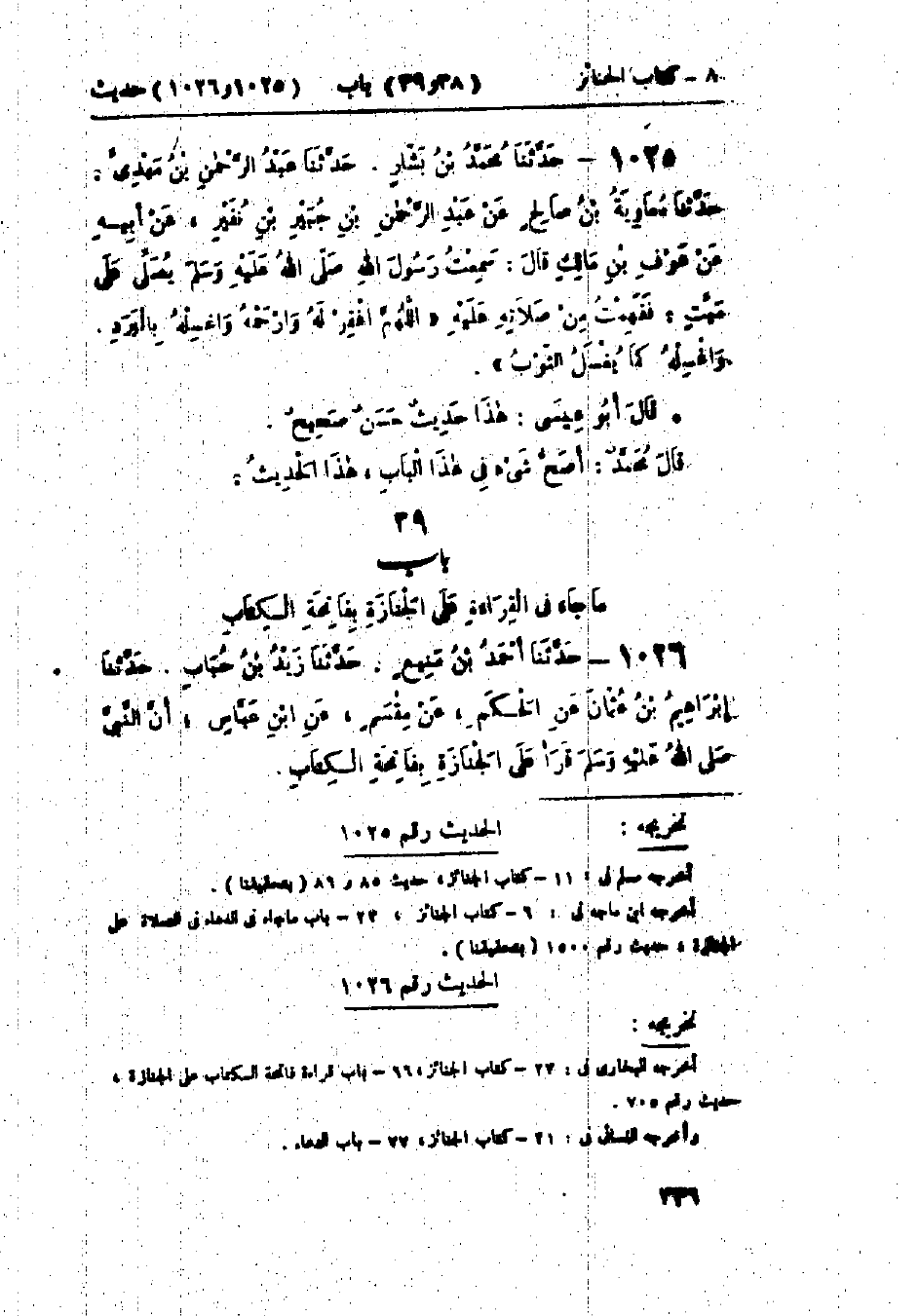 1025 - حَدَّثَنَا مُحَمَّدُ بْنُ بَشَّارٍ قَالَ: حَدَّثَنَا عَبْدُ الرَّحْمَنِ بْنُ مَهْدِيٍّ قَالَ: حَدَّثَنَا مُعَاوِيَةُ بْنُ صَالِحٍ، عَنْ عَبْدِ الرَّحْمَنِ بْنِ جُبَيْرِ بْنِ نُفَيْرٍ، عَنْ أَبِيهِ، عَنْ عَوْفِ بْنِ مَالِكٍ قَالَ: سَمِعْتُ رَسُولَ اللَّهِ صَلَّى اللَّهُ عَلَيْهِ وَسَلَّمَ يُصَلِّي عَلَى مَيِّتٍ، فَفَهِمْتُ مِنْ صَلَاتِهِ عَلَيْهِ: «§اللَّهُمَّ اغْفِرْ لَهُ، وَارْحَمْهُ، وَاغْسِلْهُ بِالبَرَدِ، وَاغْسِلْهُ كَمَا يُغْسَلُ الثَّوْبُ»: «هَذَا حَدِيثٌ حَسَنٌ صَحِيحٌ». قَالَ مُحَمَّدٌ: «أَصَحُّ شَيْءٍ فِي هَذَا البَابِ هَذَا الحَدِيثُ»