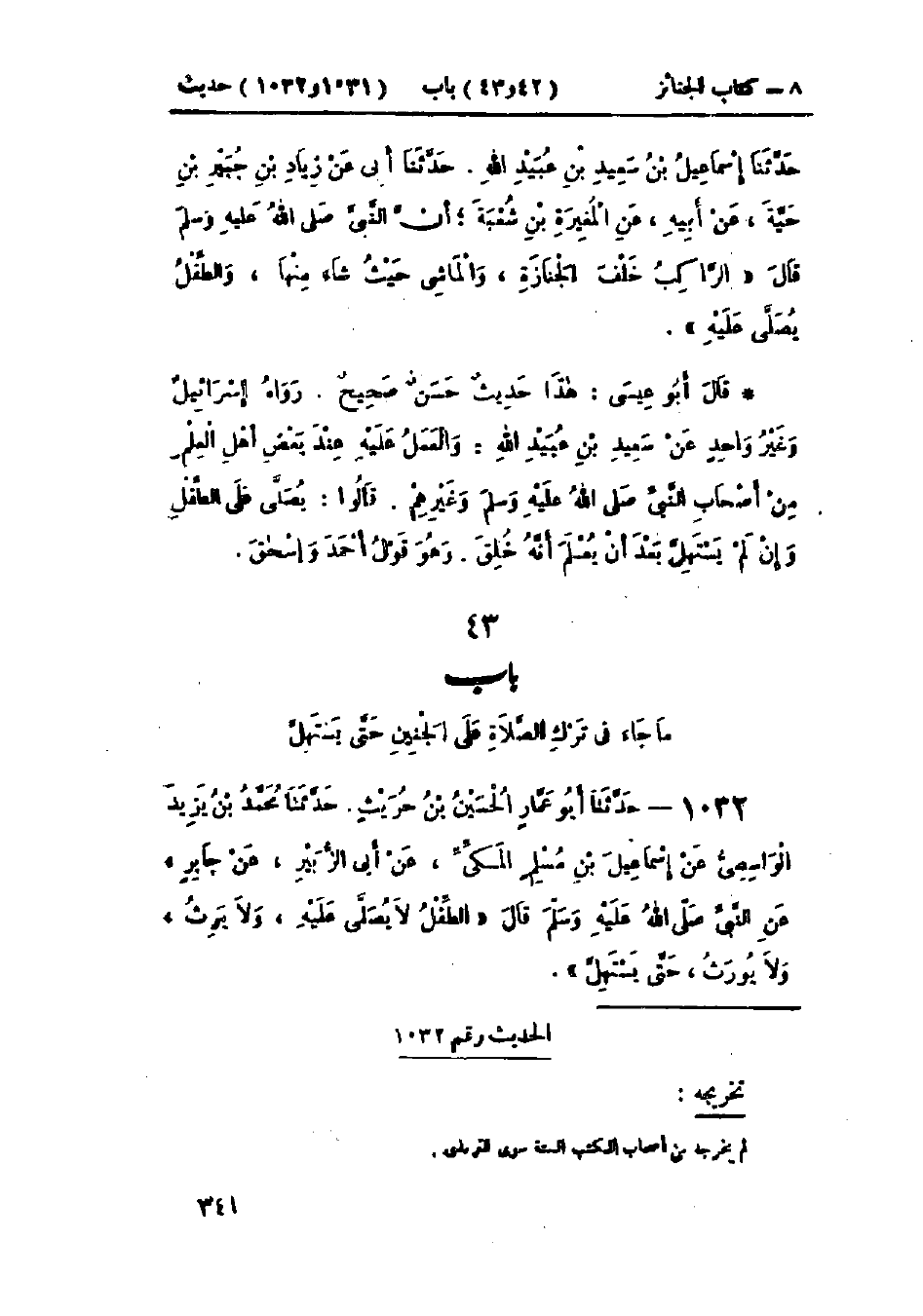 1032 - حَدَّثَنَا أَبُو عَمَّارٍ الحُسَيْنُ بْنُ حُرَيْثٍ قَالَ: حَدَّثَنَا مُحَمَّدُ بْنُ يَزِيدَ الوَاسِطِيُّ، عَنْ إِسْمَاعِيلَ بْنِ مُسْلِمٍ المَكِّيِّ، عَنْ أَبِي الزُّبَيْرِ، عَنْ جَابِرٍ، عَنِ النَّبِيِّ صَلَّى اللَّهُ عَلَيْهِ وَسَلَّمَ قَالَ: «§الطِّفْلُ لَا يُصَلَّى عَلَيْهِ، وَلَا يَرِثُ، وَلَا يُورَثُ حَتَّى يَسْتَهِلَّ»: -[342]- «هَذَا حَدِيثٌ قَدْ اضْطَرَبَ النَّاسُ فِيهِ» فَرَوَاهُ بَعْضُهُمْ، عَنْ أَبِي الزُّبَيْرِ، عَنْ جَابِرٍ، عَنِ النَّبِيِّ صَلَّى اللَّهُ عَلَيْهِ وَسَلَّمَ مَرْفُوعًا، وَرَوَى أَشْعَثُ بْنُ سَوَّارٍ، وَغَيْرُ وَاحِدٍ، عَنْ أَبِي الزُّبَيْرِ، عَنْ جَابِرٍ مَوْقُوفًا، وَرَوَى مُحَمَّدُ بْنُ إِسْحَاقَ، عَنْ عَطَاءِ بْنِ أَبِي رَبَاحٍ، عَنْ جَابِرٍ مَوْقُوفًا، وَكَأَنَّ هَذَا أَصَحُّ مِنَ الحَدِيثِ المَرْفُوعِ، " وَقَدْ ذَهَبَ بَعْضُ أَهْلِ العِلْمِ إِلَى هَذَا، قَالُوا: لَا يُصَلَّى عَلَى الطِّفْلِ حَتَّى يَسْتَهِلَّ، وَهُوَ قَوْلُ سُفْيَانَ الثَّوْرِيِّ، وَالشَّافِعِيِّ "