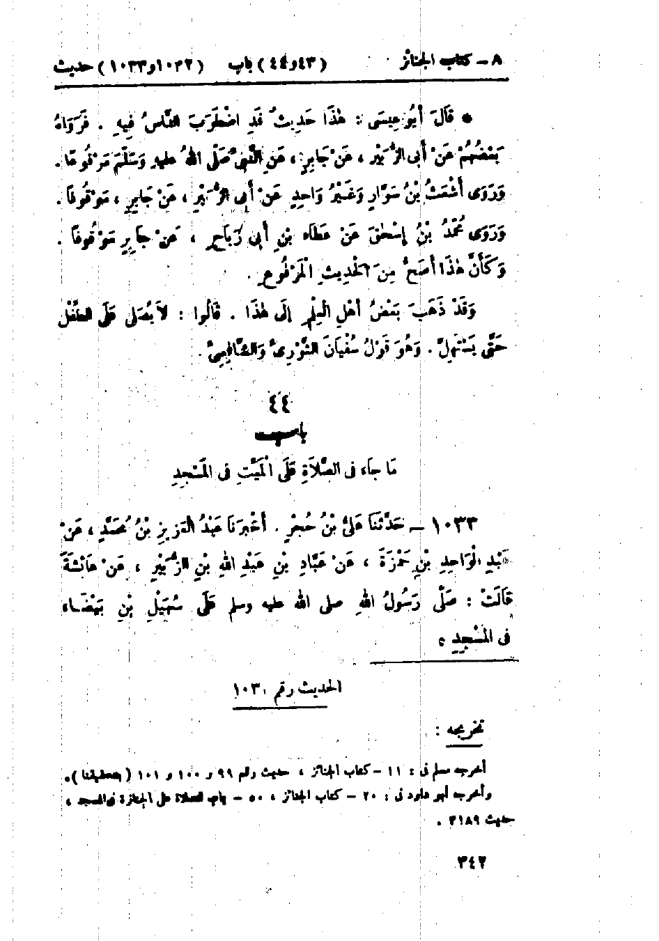 1033 - حَدَّثَنَا عَلِيُّ بْنُ حُجْرٍ قَالَ: أَخْبَرَنَا عَبْدُ العَزِيزِ بْنُ مُحَمَّدٍ، عَنْ عَبْدِ الوَاحِدِ بْنِ حَمْزَةَ، عَنْ عَبَّادِ بْنِ عَبْدِ اللَّهِ بْنِ الزُّبَيْرِ، عَنْ عَائِشَةَ قَالَتْ: «§صَلَّى رَسُولُ اللَّهِ صَلَّى اللَّهُ عَلَيْهِ وَسَلَّمَ عَلَى سُهَيْلِ ابْنِ بَيْضَاءَ فِي المَسْجِدِ»:: -[343]- «هَذَا حَدِيثٌ حَسَنٌ، وَالعَمَلُ عَلَى هَذَا عِنْدَ بَعْضِ أَهْلِ العِلْمِ». قَالَ الشَّافِعِيُّ: قَالَ مَالِكٌ: «لَا يُصَلَّى عَلَى المَيِّتِ فِي المَسْجِدِ»، وقَالَ الشَّافِعِيُّ: «يُصَلَّى عَلَى المَيِّتِ فِي المَسْجِدِ وَاحْتَجَّ بِهَذَا الحَدِيثِ»