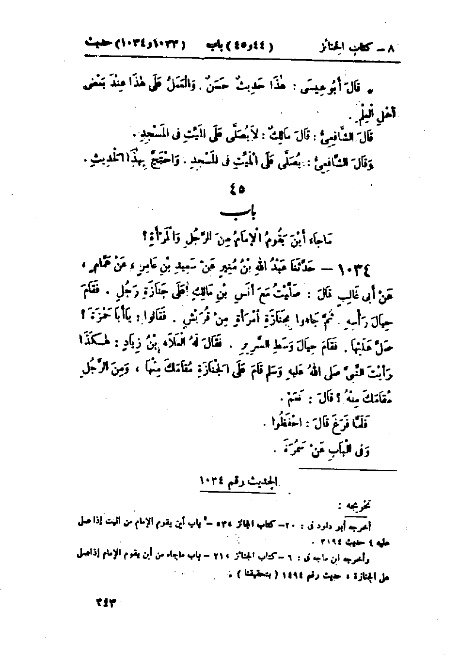 1034 - حَدَّثَنَا عَبْدُ اللَّهِ بْنُ مُنِيرٍ، عَنْ سَعِيدِ بْنِ عَامِرٍ، عَنْ هَمَّامٍ، عَنْ أَبِي غَالِبٍ، قَالَ: صَلَّيْتُ مَعَ أَنَسِ بْنِ مَالِكٍ عَلَى جَنَازَةِ رَجُلٍ، §فَقَامَ حِيَالَ رَأْسِهِ، ثُمَّ جَاءُوا بِجَنَازَةِ امْرَأَةٍ مِنْ قُرَيْشٍ، فَقَالُوا: يَا أَبَا حَمْزَةَ صَلِّ عَلَيْهَا، فَقَامَ حِيَالَ وَسَطِ السَّرِيرِ، فَقَالَ لَهُ العَلَاءُ بْنُ زِيَادٍ: هَكَذَا رَأَيْتَ النَّبِيَّ صَلَّى اللَّهُ عَلَيْهِ وَسَلَّمَ قَامَ عَلَى الجَنَازَةِ مُقَامَكَ مِنْهَا وَمِنَ الرَّجُلِ مُقَامَكَ مِنْهُ؟ قَالَ: «نَعَمْ». فَلَمَّا فَرَغَ قَالَ: احْفَظُوا وَفِي البَاب عَنْ سَمُرَةَ.: -[344]- «حَدِيثُ أَنَسٍ هَذَا حَدِيثٌ حَسَنٌ»، وَقَدْ رَوَى غَيْرُ وَاحِدٍ عَنْ هَمَّامٍ، مِثْلَ هَذَا وَرَوَى وَكِيعٌ هَذَا الحَدِيثَ، عَنْ هَمَّامٍ فَوَهِمَ فِيهِ، فَقَالَ: عَنْ غَالِبٍ، عَنْ أَنَسٍ، وَالصَّحِيحُ عَنْ أَبِي غَالِبٍ، وَقَدْ رَوَى هَذَا الحَدِيثَ عَبْدُ الوَارِثِ بْنُ سَعِيدٍ وَغَيْرُ وَاحِدٍ عَنْ أَبِي غَالِبٍ، مِثْلَ رِوَايَةِ هَمَّامٍ " وَاخْتَلَفُوا فِي اسْمِ أَبِي غَالِبٍ هَذَا فَقَالَ بَعْضُهُمْ: يُقَالُ: اسْمُهُ نَافِعٌ وَيُقَالُ رَافِعٌ وَقَدْ ذَهَبَ بَعْضُ أَهْلِ العِلْمِ إِلَى هَذَا، وَهُوَ قَوْلُ أَحْمَدَ وَإِسْحَاقَ "