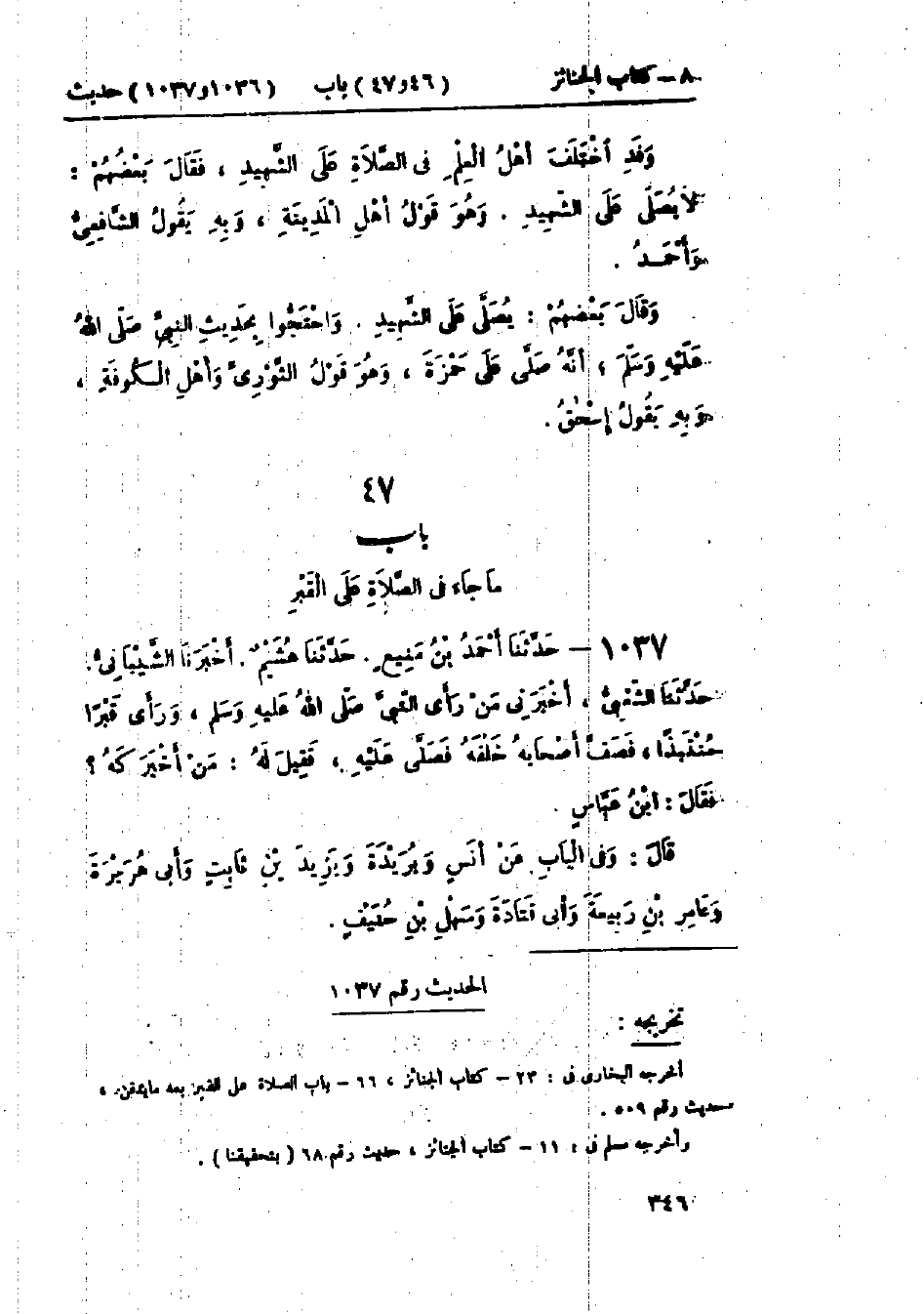 1037 - حَدَّثَنَا أَحْمَدُ بْنُ مَنِيعٍ قَالَ: حَدَّثَنَا هُشَيْمٌ قَالَ: أَخْبَرَنَا الشَّيْبَانِيُّ قَالَ: حَدَّثَنَا الشَّعْبِيُّ قَالَ: أَخْبَرَنِي مَنْ رَأَى النَّبِيَّ صَلَّى اللَّهُ عَلَيْهِ وَسَلَّمَ، «§وَرَأَى قَبْرًا مُنْتَبِذًا فَصَفَّ أَصْحَابَهُ خَلْفَهُ، فَصَلَّى عَلَيْهِ»، فَقِيلَ لَهُ: مَنْ أَخْبَرَكَهُ؟ فَقَالَ: ابْنُ عَبَّاسٍ، وَفِي البَاب عَنْ أَنَسٍ، وَبُرَيْدَةَ وَيَزِيدَ بْنِ ثَابِتٍ، وَأَبِي هُرَيْرَةَ، وَعَامِرِ بْنِ رَبِيعَةَ، وَأَبِي قَتَادَةَ، وَسَهْلِ بْنِ حُنَيْفٍ.: -[347]- «حَدِيثُ ابْنِ عَبَّاسٍ حَدِيثٌ حَسَنٌ صَحِيحٌ»، «وَالعَمَلُ عَلَى هَذَا عِنْدَ أَكْثَرِ أَهْلِ العِلْمِ مِنْ أَصْحَابِ النَّبِيِّ صَلَّى اللَّهُ عَلَيْهِ وَسَلَّمَ وَغَيْرِهِمْ وَهُوَ قَوْلُ الشَّافِعِيِّ وَأَحْمَدَ وَإِسْحَاقَ»، " وقَالَ بَعْضُ أَهْلِ العِلْمِ: لَا يُصَلَّى عَلَى القَبْرِ , وَهُوَ قَوْلُ مَالِكِ بْنِ أَنَسٍ، وقَالَ عَبْدُ اللَّهِ بْنُ المُبَارَكِ: " إِذَا دُفِنَ المَيِّتُ وَلَمْ يُصَلَّ عَلَيْهِ، صُلِّيَ عَلَى القَبْرِ وَرَأَى ابْنُ المُبَارَكِ الصَّلَاةَ عَلَى القَبْرِ، وقَالَ أَحْمَدُ، وَإِسْحَاقُ: يُصَلَّى عَلَى القَبْرِ إِلَى شَهْرٍ، وَقَالَا أَكْثَرُ مَا سَمِعْنَا عَنْ ابْنِ المُسَيِّبِ «أَنَّ النَّبِيَّ صَلَّى اللَّهُ عَلَيْهِ وَسَلَّمَ صَلَّى عَلَى قَبْرِ أُمِّ سَعْدِ بْنِ عُبَادَةَ بَعْدَ شَهْرٍ»