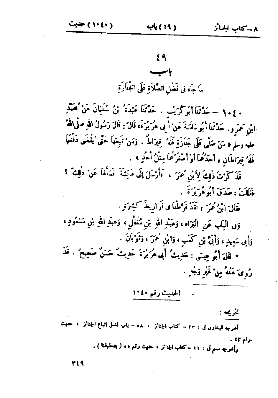 1040 - حَدَّثَنَا أَبُو كُرَيْبٍ قَالَ: حَدَّثَنَا عَبْدَةُ بْنُ سُلَيْمَانَ، عَنْ مُحَمَّدِ بْنِ عَمْرٍو قَالَ: حَدَّثَنَا أَبُو سَلَمَةَ، عَنْ أَبِي هُرَيْرَةَ قَالَ: قَالَ رَسُولُ اللَّهِ صَلَّى اللَّهُ عَلَيْهِ وَسَلَّمَ: «§مَنْ صَلَّى عَلَى جَنَازَةٍ فَلَهُ قِيرَاطٌ، وَمَنْ تَبِعَهَا حَتَّى يُقْضَى دَفْنُهَا فَلَهُ قِيرَاطَانِ، أَحَدُهُمَا أَوْ أَصْغَرُهُمَا مِثْلُ أُحُدٍ»، فَذَكَرْتُ ذَلِكَ لِابْنِ عُمَرَ، فَأَرْسَلَ إِلَى عَائِشَةَ، فَسَأَلَهَا عَنْ ذَلِكَ؟ فَقَالَتْ: صَدَقَ أَبُو هُرَيْرَةَ، فَقَالَ ابْنُ عُمَرَ: «لَقَدْ فَرَّطْنَا فِي قَرَارِيطَ كَثِيرَةٍ». وَفِي البَاب عَنْ البَرَاءِ، وَعَبْدِ اللَّهِ بْنِ مُغَفَّلٍ، وَعَبْدِ اللَّهِ بْنِ مَسْعُودٍ، وَأَبِي سَعِيدٍ، وَأُبَيِّ بْنِ كَعْبٍ، وَابْنِ عُمَرَ، وَثَوْبَانَ.: «حَدِيثُ أَبِي هُرَيْرَةَ حَدِيثٌ حَسَنٌ صَحِيحٌ، قَدْ رُوِيَ عَنْهُ مِنْ غَيْرِ وَجْهٍ»