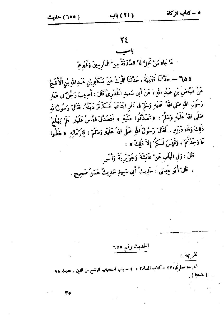 655 - حَدَّثَنَا قُتَيْبَةُ قَالَ: حَدَّثَنَا اللَّيْثُ، عَنْ بُكَيْرِ بْنِ عَبْدِ اللَّهِ بْنِ الأَشَجِّ، عَنْ عِيَاضِ بْنِ عَبْدِ اللَّهِ، عَنْ أَبِي سَعِيدٍ الخُدْرِيِّ قَالَ: أُصِيبَ رَجُلٌ فِي عَهْدِ رَسُولِ اللَّهِ صَلَّى اللَّهُ عَلَيْهِ وَسَلَّمَ فِي ثِمَارٍ ابْتَاعَهَا، فَكَثُرَ دَيْنُهُ، فَقَالَ رَسُولُ اللَّهِ صَلَّى اللَّهُ عَلَيْهِ وَسَلَّمَ: «§تَصَدَّقُوا عَلَيْهِ»، فَتَصَدَّقَ النَّاسُ عَلَيْهِ، فَلَمْ يَبْلُغْ ذَلِكَ وَفَاءَ دَيْنِهِ، فَقَالَ رَسُولُ اللَّهِ صَلَّى اللَّهُ عَلَيْهِ وَسَلَّمَ لِغُرَمَائِهِ: «خُذُوا مَا وَجَدْتُمْ، وَلَيْسَ لَكُمْ إِلَّا ذَلِكَ» وَفِي البَابِ عَنْ عَائِشَةَ، وَجُوَيْرِيَةَ، وَأَنَسٍ.: «حَدِيثُ أَبِي سَعِيدٍ حَدِيثٌ حَسَنٌ صَحِيحٌ»