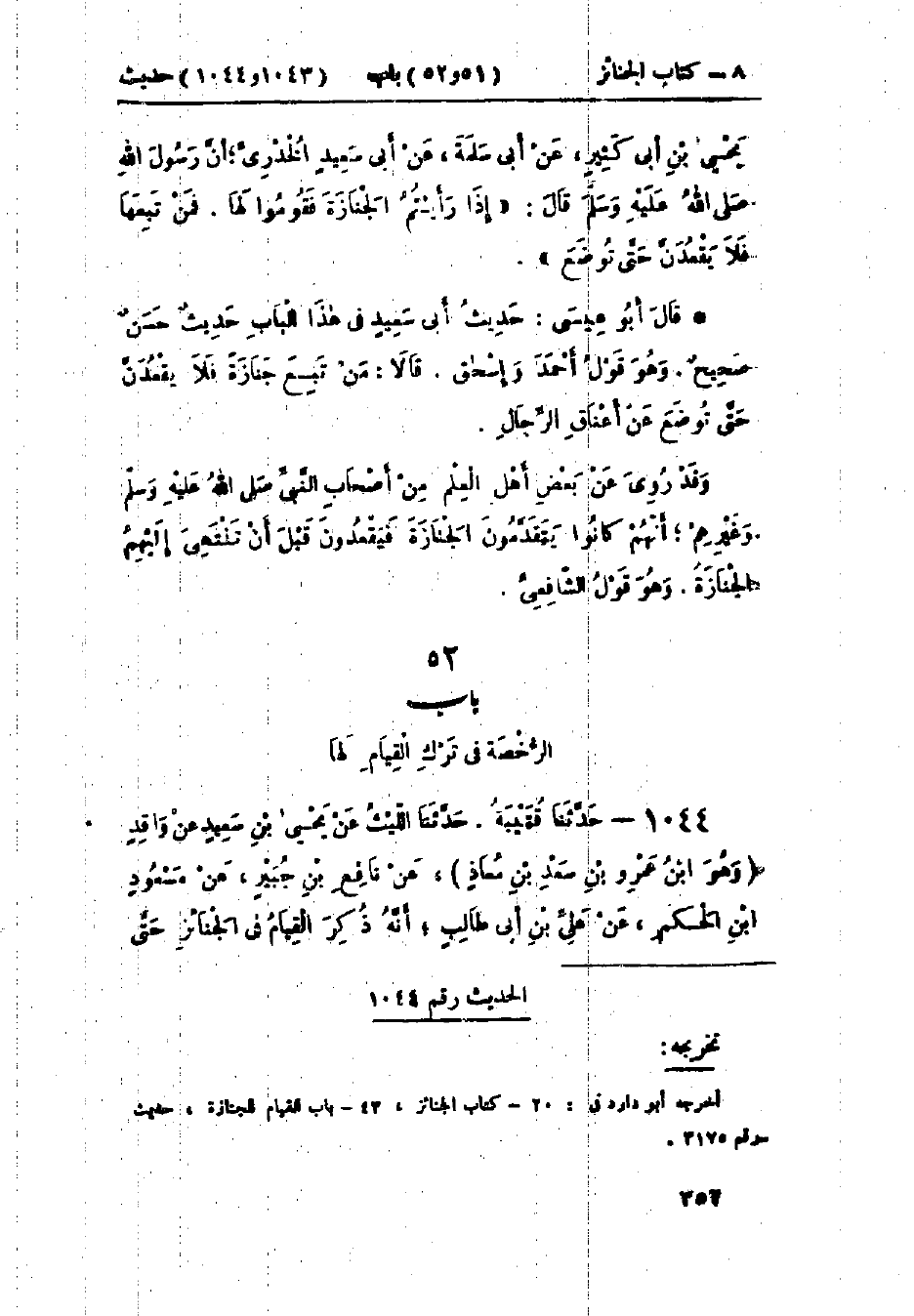 1044 - حَدَّثَنَا قُتَيْبَةُ قَالَ: حَدَّثَنَا اللَّيْثُ، عَنْ يَحْيَى بْنِ سَعِيدٍ، عَنْ وَاقِدٍ وَهُوَ ابْنُ عَمْرِو بْنِ سَعْدِ بْنِ مُعَاذٍ، عَنْ نَافِعِ بْنِ جُبَيْرٍ، عَنْ مَسْعُودِ بْنِ الحَكَمِ، عَنْ عَلِيِّ بْنِ أَبِي طَالِبٍ، أَنَّهُ ذُكِرَ القِيَامُ فِي الجَنَائِزِ حَتَّى -[353]- تُوضَعَ، فَقَالَ عَلِيٌّ: «§قَامَ رَسُولُ اللَّهِ صَلَّى اللَّهُ عَلَيْهِ وَسَلَّمَ، ثُمَّ قَعَدَ» وَفِي البَاب عَنْ الحَسَنِ بْنِ عَلِيٍّ، وَابْنِ عَبَّاسٍ.: «حَدِيثُ عَلِيٍّ حَدِيثٌ حَسَنٌ صَحِيحٌ، وَفِيهِ رِوَايَةُ أَرْبَعَةٍ مِنَ التَّابِعِينَ بَعْضُهُمْ عَنْ بَعْضٍ، وَالعَمَلُ عَلَى هَذَا عِنْدَ بَعْضِ أَهْلِ العِلْمِ». قَالَ الشَّافِعِيُّ: «وَهَذَا أَصَحُّ شَيْءٍ فِي هَذَا البَابِ، وَهَذَا الحَدِيثُ نَاسِخٌ لِلأَوَّلِ إِذَا رَأَيْتُمُ الجَنَازَةَ فَقُومُوا»، وقَالَ أَحْمَدُ: إِنْ شَاءَ قَامَ، وَإِنْ شَاءَ لَمْ يَقُمْ، وَاحْتَجَّ بِأَنَّ «النَّبِيَّ صَلَّى اللَّهُ عَلَيْهِ وَسَلَّمَ قَدْ رُوِيَ عَنْهُ أَنَّهُ قَامَ ثُمَّ قَعَدَ»، وَهَكَذَا قَالَ إِسْحَاقُ بْنُ إِبْرَاهِيمَ.: مَعْنَى قَوْلِ عَلِيٍّ: «قَامَ رَسُولُ اللَّهِ صَلَّى اللَّهُ عَلَيْهِ وَسَلَّمَ فِي الجَنَازَةِ ثُمَّ قَعَدَ»، يَقُولُ: كَانَ رَسُولُ اللَّهِ صَلَّى اللَّهُ عَلَيْهِ وَسَلَّمَ إِذَا رَأَى الجَنَازَةَ قَامَ، ثُمَّ تَرَكَ ذَلِكَ بَعْدُ، فَكَانَ لَا يَقُومُ إِذَا رَأَى الجَنَازَةَ