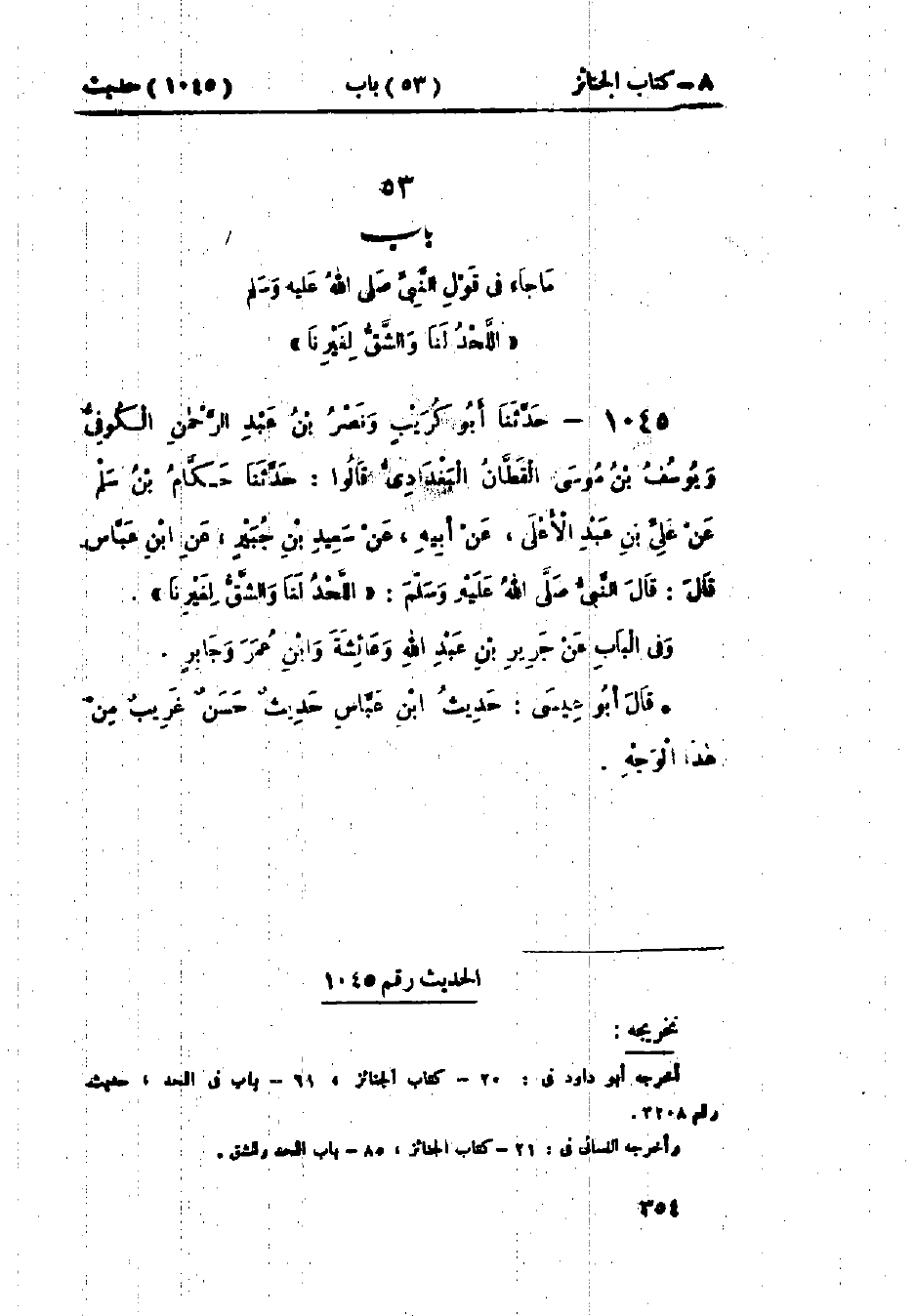 1045 - حَدَّثَنَا أَبُو كُرَيْبٍ، وَنَصْرُ بْنُ عَبْدِ الرَّحْمَنِ الكُوفِيُّ، وَيُوسُفُ بْنُ مُوسَى القَطَّانُ البَغْدَادِيُّ، قَالُوا: حَدَّثَنَا حَكَّامُ بْنُ سَلْمٍ، عَنْ عَلِيِّ بْنِ عَبْدِ الأَعْلَى، عَنْ أَبِيهِ، عَنْ سَعِيدِ بْنِ جُبَيْرٍ، عَنْ ابْنِ عَبَّاسٍ قَالَ: قَالَ النَّبِيُّ صَلَّى اللَّهُ عَلَيْهِ وَسَلَّمَ: «§اللَّحْدُ لَنَا، وَالشَّقُّ لِغَيْرِنَا» وَفِي البَاب عَنْ جَرِيرِ بْنِ عَبْدِ اللَّهِ، وَعَائِشَةَ، وَابْنِ عُمَرَ، وَجَابِرٍ.: «حَدِيثُ ابْنِ عَبَّاسٍ حَدِيثٌ غَرِيبٌ مِنْ هَذَا الوَجْهِ»