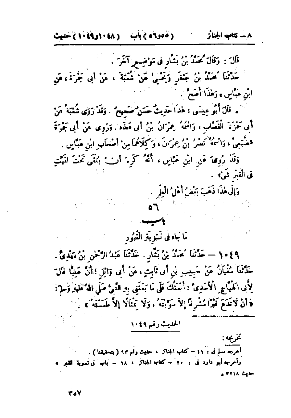 1049 - حَدَّثَنَا مُحَمَّدُ بْنُ بَشَّارٍ قَالَ: حَدَّثَنَا عَبْدُ الرَّحْمَنِ بْنُ مَهْدِيٍّ قَالَ: حَدَّثَنَا سُفْيَانُ، عَنْ حَبِيبِ بْنِ أَبِي ثَابِتٍ، عَنْ أَبِي وَائِلٍ، أَنَّ عَلِيًّا قَالَ لِأَبِي الهَيَّاجِ الأَسَدِيِّ: أَبْعَثُكَ عَلَى مَا بَعَثَنِي بِهِ النَّبِيُّ صَلَّى اللَّهُ عَلَيْهِ وَسَلَّمَ «أَنْ §لَا تَدَعَ قَبْرًا مُشْرِفًا إِلَّا سَوَّيْتَهُ، وَلَا تِمْثَالًا إِلَّا طَمَسْتَهُ -[358]-» وَفِي البَاب عَنْ جَابِرٍ.: «حَدِيثُ عَلِيٍّ حَدِيثٌ حَسَنٌ»، «وَالعَمَلُ عَلَى هَذَا عِنْدَ بَعْضِ أَهْلِ العِلْمِ يَكْرَهُونَ أَنْ يُرْفَعَ القَبْرُ فَوْقَ الأَرْضِ». قَالَ الشَّافِعِيُّ: «أَكْرَهُ أَنْ يُرْفَعَ القَبْرُ إِلَّا بِقَدْرِ مَا يُعْرَفُ أَنَّهُ قَبْرٌ لِكَيْلَا يُوطَأَ وَلَا يُجْلَسَ عَلَيْهِ»