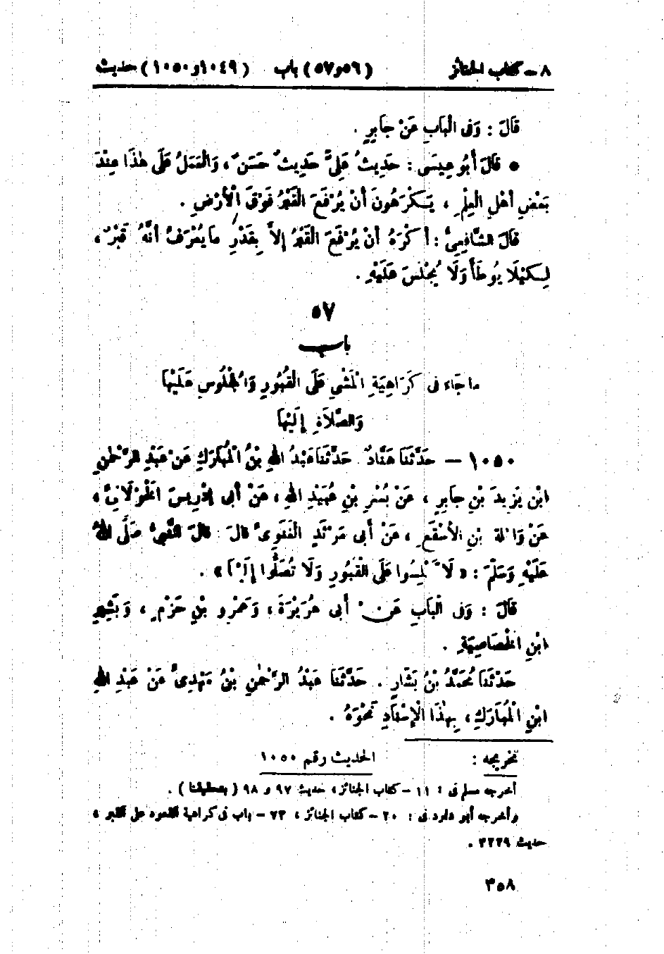 1050 - حَدَّثَنَا هَنَّادٌ قَالَ: حَدَّثَنَا عَبْدُ اللَّهِ بْنُ المُبَارَكِ، عَنْ عَبْدِ الرَّحْمَنِ بْنِ يَزِيدَ بْنِ جَابِرٍ، عَنْ بُسْرِ بْنِ عُبَيْدِ اللَّهِ، عَنْ أَبِي إِدْرِيسَ الخَوْلَانِيِّ، عَنْ وَاثِلَةَ بْنِ الأَسْقَعِ، عَنْ أَبِي مَرْثَدٍ الغَنَوِيِّ قَالَ: قَالَ النَّبِيُّ صَلَّى اللَّهُ عَلَيْهِ وَسَلَّمَ: «§لَا تَجْلِسُوا عَلَى القُبُورِ، وَلَا تُصَلُّوا إِلَيْهَا» وَفِي البَاب عَنْ أَبِي هُرَيْرَةَ، وَعَمْرِو بْنِ حَزْمٍ، وَبَشِيرِ ابْنِ الخَصَاصِيَةِ. حَدَّثَنَا مُحَمَّدُ بْنُ بَشَّارٍ قَالَ: حَدَّثَنَا عَبْدُ الرَّحْمَنِ بْنُ مَهْدِيٍّ، عَنْ عَبْدِ اللَّهِ بْنِ المُبَارَكِ بِهَذَا الإِسْنَادِ نَحْوَهُ.