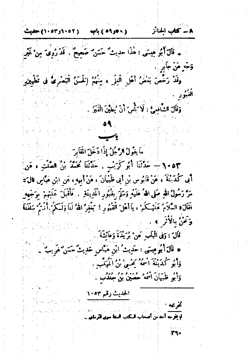 1053 - حَدَّثَنَا أَبُو كُرَيْبٍ قَالَ: حَدَّثَنَا مُحَمَّدُ بْنُ الصَّلْتِ، عَنْ أَبِي كُدَيْنَةَ، عَنْ قَابُوسَ بْنِ أَبِي ظَبْيَانَ، عَنْ أَبِيهِ، عَنْ ابْنِ عَبَّاسٍ قَالَ: مَرَّ رَسُولُ اللَّهِ صَلَّى اللَّهُ عَلَيْهِ وَسَلَّمَ بِقُبُورِ المَدِينَةِ فَأَقْبَلَ عَلَيْهِمْ بِوَجْهِهِ، فَقَالَ: «§السَّلَامُ عَلَيْكُمْ يَا أَهْلَ القُبُورِ، يَغْفِرُ اللَّهُ لَنَا وَلَكُمْ، أَنْتُمْ سَلَفُنَا، وَنَحْنُ بِالأَثَرِ» وَفِي البَاب عَنْ بُرَيْدَةَ، وَعَائِشَةَ.: «حَدِيثُ ابْنِ عَبَّاسٍ حَدِيثٌ غَرِيبٌ» وَأَبُو كُدَيْنَةَ: اسْمُهُ يَحْيَى بْنُ المُهَلَّبِ، وَأَبُو ظَبْيَانَ: اسْمُهُ حُصَيْنُ بْنُ جُنْدُبٍ