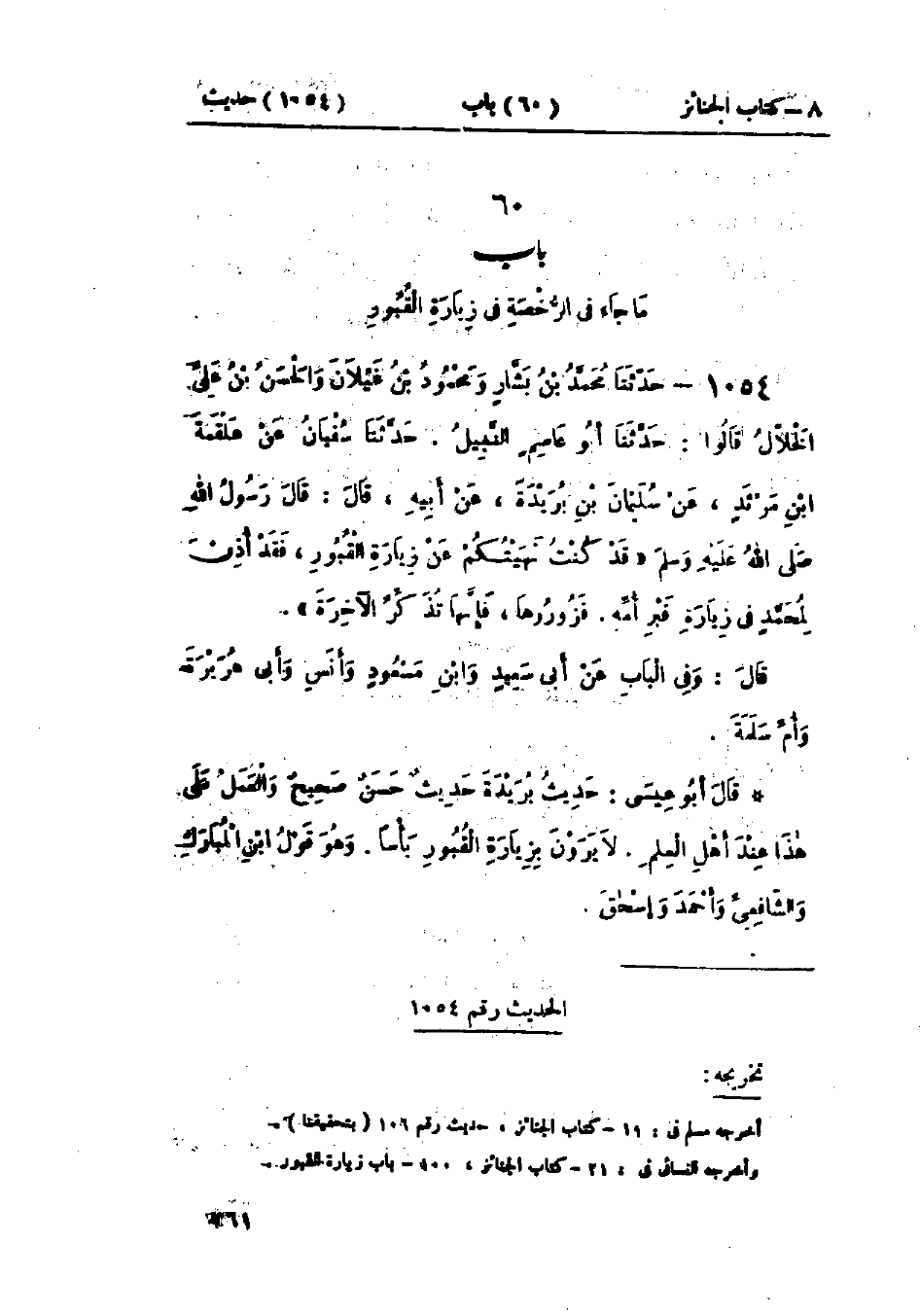 1054 - حَدَّثَنَا مُحَمَّدُ بْنُ بَشَّارٍ، وَمَحْمُودُ بْنُ غَيْلَانَ، وَالحَسَنُ بْنُ عَلِيٍّ الخَلَّالُ، قَالُوا: حَدَّثَنَا أَبُو عَاصِمِ النَّبِيلُ قَالَ: حَدَّثَنَا سُفْيَانُ، عَنْ عَلْقَمَةَ بْنِ مَرْثَدٍ، عَنْ سُلَيْمَانَ بْنِ بُرَيْدَةَ، عَنْ أَبِيهِ قَالَ: قَالَ رَسُولُ اللَّهِ صَلَّى اللَّهُ عَلَيْهِ وَسَلَّمَ: «§قَدْ كُنْتُ نَهَيْتُكُمْ عَنْ زِيَارَةِ القُبُورِ، فَقَدْ أُذِنَ لِمُحَمَّدٍ فِي زِيَارَةِ قَبْرِ أُمِّهِ، فَزُورُوهَا فَإِنَّهَا تُذَكِّرُ الآخِرَةَ» وَفِي البَاب عَنْ أَبِي سَعِيدٍ، وَابْنِ مَسْعُودٍ، وَأَنَسٍ، وَأَبِي هُرَيْرَةَ، وَأُمِّ سَلَمَةَ.: «حَدِيثُ بُرَيْدَةَ حَدِيثٌ حَسَنٌ صَحِيحٌ»، " وَالعَمَلُ عَلَى هَذَا عِنْدَ أَهْلِ العِلْمِ: لَا يَرَوْنَ بِزِيَارَةِ القُبُورِ بَأْسًا، وَهُوَ قَوْلُ ابْنِ المُبَارَكِ، وَالشَّافِعِيِّ، وَأَحْمَدَ، وَإِسْحَاقَ "