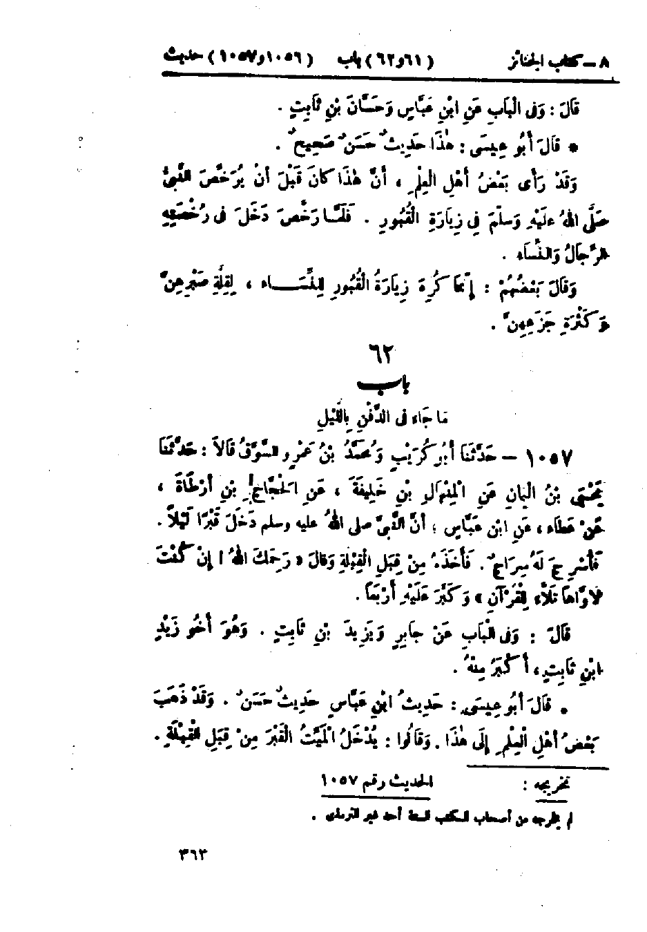 1057 - حَدَّثَنَا أَبُو كُرَيْبٍ، وَمُحَمَّدُ بْنُ عَمْرٍو السَّوَّاقُ، قَالَا: حَدَّثَنَا يَحْيَى بْنُ اليَمَانِ، عَنْ المِنْهَالِ بْنِ خَلِيفَةَ، عَنْ الحَجَّاجِ بْنِ أَرْطَاةَ، عَنْ عَطَاءٍ، عَنْ ابْنِ عَبَّاسٍ، أَنَّ النَّبِيَّ صَلَّى اللَّهُ عَلَيْهِ وَسَلَّمَ دَخَلَ قَبْرًا لَيْلًا، فَأُسْرِجَ لَهُ سِرَاجٌ، فَأَخَذَهُ مِنْ قِبَلِ القِبْلَةِ، وَقَالَ: «§رَحِمَكَ اللَّهُ، إِنْ كُنْتَ لَأَوَّاهًا تَلَّاءً لِلْقُرْآنِ»، وَكَبَّرَ عَلَيْهِ أَرْبَعًا وَفِي البَاب عَنْ جَابِرٍ، وَيَزِيدَ بْنِ ثَابِتٍ، وَهُوَ أَخُو زَيْدِ بْنِ ثَابِتٍ أَكْبَرُ مِنْهُ.: «حَدِيثُ ابْنِ عَبَّاسٍ حَدِيثٌ حَسَنٌ»، " وَقَدْ ذَهَبَ بَعْضُ أَهْلِ العِلْمِ إِلَى هَذَا، وَقَالُوا: يُدْخَلُ المَيِّتُ القَبْرَ مِنْ قِبَلِ القِبْلَةِ، -[364]- وقَالَ بَعْضُهُمْ: يُسَلُّ سَلًّا، وَرَخَّصَ أَكْثَرُ أَهْلِ العِلْمِ فِي الدَّفْنِ بِاللَّيْلِ "