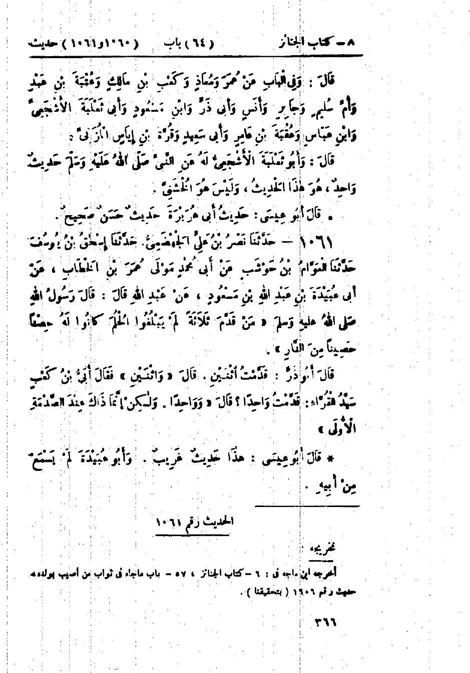 1060 - حَدَّثَنَا قُتَيْبَةُ، عَنْ مَالِكِ بْنِ أَنَسٍ، ح وحَدَّثَنَا الأَنْصَارِيُّ قَالَ: حَدَّثَنَا مَعْنٌ، حَدَّثَنَا مَالِكُ بْنُ أَنَسٍ، عَنْ ابْنِ شِهَابٍ، عَنْ سَعِيدِ بْنِ المُسَيِّبِ، عَنْ أَبِي هُرَيْرَةَ، أَنَّ رَسُولَ اللَّهِ صَلَّى اللَّهُ عَلَيْهِ وَسَلَّمَ قَالَ: «§لَا يَمُوتُ لِأَحَدٍ مِنَ المُسْلِمِينَ ثَلَاثَةٌ مِنَ الوَلَدِ فَتَمَسَّهُ النَّارُ إِلَّا تَحِلَّةَ القَسَمِ» -[367]- وَفِي البَاب عَنْ عُمَرَ، وَمُعَاذٍ، وَكَعْبِ بْنِ مَالِكٍ، وَعُتْبَةَ بْنِ عَبْدٍ، وَأُمِّ سُلَيْمٍ، وَجَابِرٍ، وَأَنَسٍ، وَأَبِي ذَرٍّ، وَابْنِ مَسْعُودٍ، وَأَبِي ثَعْلَبَةَ الأَشْجَعِيِّ، وَابْنِ عَبَّاسٍ، وَعُقْبَةَ بْنِ عَامِرٍ، وَأَبِي سَعِيدٍ، وَقُرَّةَ بْنِ إِيَاسٍ المُزَنِيِّ. «وَأَبُو ثَعْلَبَةَ الأَشْجَعِيُّ لَهُ عَنِ النَّبِيِّ صَلَّى اللَّهُ عَلَيْهِ وَسَلَّمَ حَدِيثٌ وَاحِدٌ هُوَ هَذَا الحَدِيثُ، وَلَيْسَ هُوَ الخُشَنِيُّ»: «حَدِيثُ أَبِي هُرَيْرَةَ حَدِيثٌ حَسَنٌ صَحِيحٌ»