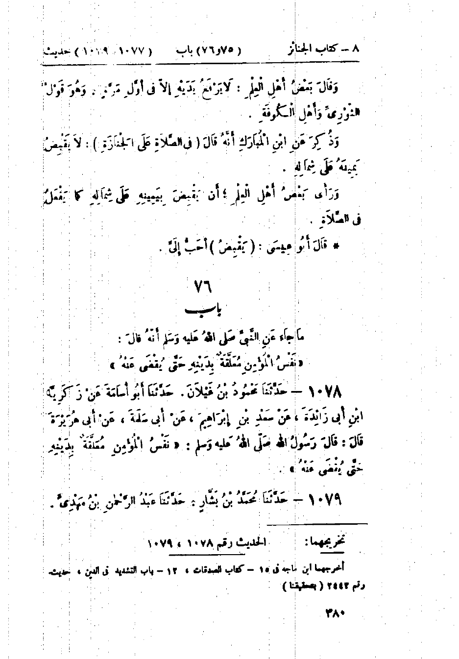 1077 - حَدَّثَنَا القَاسِمُ بْنُ دِينَارٍ الكُوفِيُّ قَالَ: حَدَّثَنَا إِسْمَاعِيلُ بْنُ أَبَانَ الوَرَّاقُ، عَنْ يَحْيَى بْنِ يَعْلَى، عَنْ أَبِي فَرْوَةَ يَزِيدَ بْنِ سِنَانٍ، عَنْ زَيْدٍ وَهُوَ ابْنُ أَبِي أُنَيْسَةَ، عَنْ الزُّهْرِيِّ، عَنْ سَعِيدِ بْنِ المُسَيِّبِ، عَنْ أَبِي هُرَيْرَةَ، أَنَّ رَسُولَ اللَّهِ صَلَّى اللَّهُ عَلَيْهِ وَسَلَّمَ: «§كَبَّرَ عَلَى جَنَازَةٍ، فَرَفَعَ يَدَيْهِ فِي أَوَّلِ تَكْبِيرَةٍ، وَوَضَعَ اليُمْنَى عَلَى اليُسْرَى». هَذَا حَدِيثٌ غَرِيبٌ لَا نَعْرِفُهُ إِلَّا مِنْ هَذَا الوَجْهِ، وَاخْتَلَفَ أَهْلُ العِلْمِ فِي هَذَا، فَرَأَى أَكْثَرُ أَهْلِ العِلْمِ مِنْ أَصْحَابِ النَّبِيِّ صَلَّى اللَّهُ عَلَيْهِ وَسَلَّمَ وَغَيْرِهِمْ: أَنْ يَرْفَعَ الرَّجُلُ يَدَيْهِ فِي كُلِّ تَكْبِيرَةٍ عَلَى الجَنَازَةِ، وَهُوَ قَوْلُ ابْنِ المُبَارَكِ، وَالشَّافِعِيِّ، وَأَحْمَدَ، وَإِسْحَاقَ، -[381]- وَقَالَ بَعْضُ أَهْلِ العِلْمِ: لَا يَرْفَعُ يَدَيْهِ إِلَّا فِي أَوَّلِ مَرَّةٍ، وَهُوَ قَوْلُ الثَّوْرِيِّ، وَأَهْلِ الكُوفَةِ، وَذُكِرَ عَنْ ابْنِ المُبَارَكِ أَنَّهُ قَالَ فِي الصَّلَاةِ عَلَى الجَنَازَةِ: لَا يَقْبِضُ يَمِينَهُ عَلَى شِمَالِهِ، وَرَأَى بَعْضُ أَهْلِ العِلْمِ: أَنْ يَقْبِضَ بِيَمِينِهِ عَلَى شِمَالِهِ كَمَا يَفْعَلُ فِي الصَّلَاةِ. يَقْبِضُ أَحَبُّ إِلَيَّ