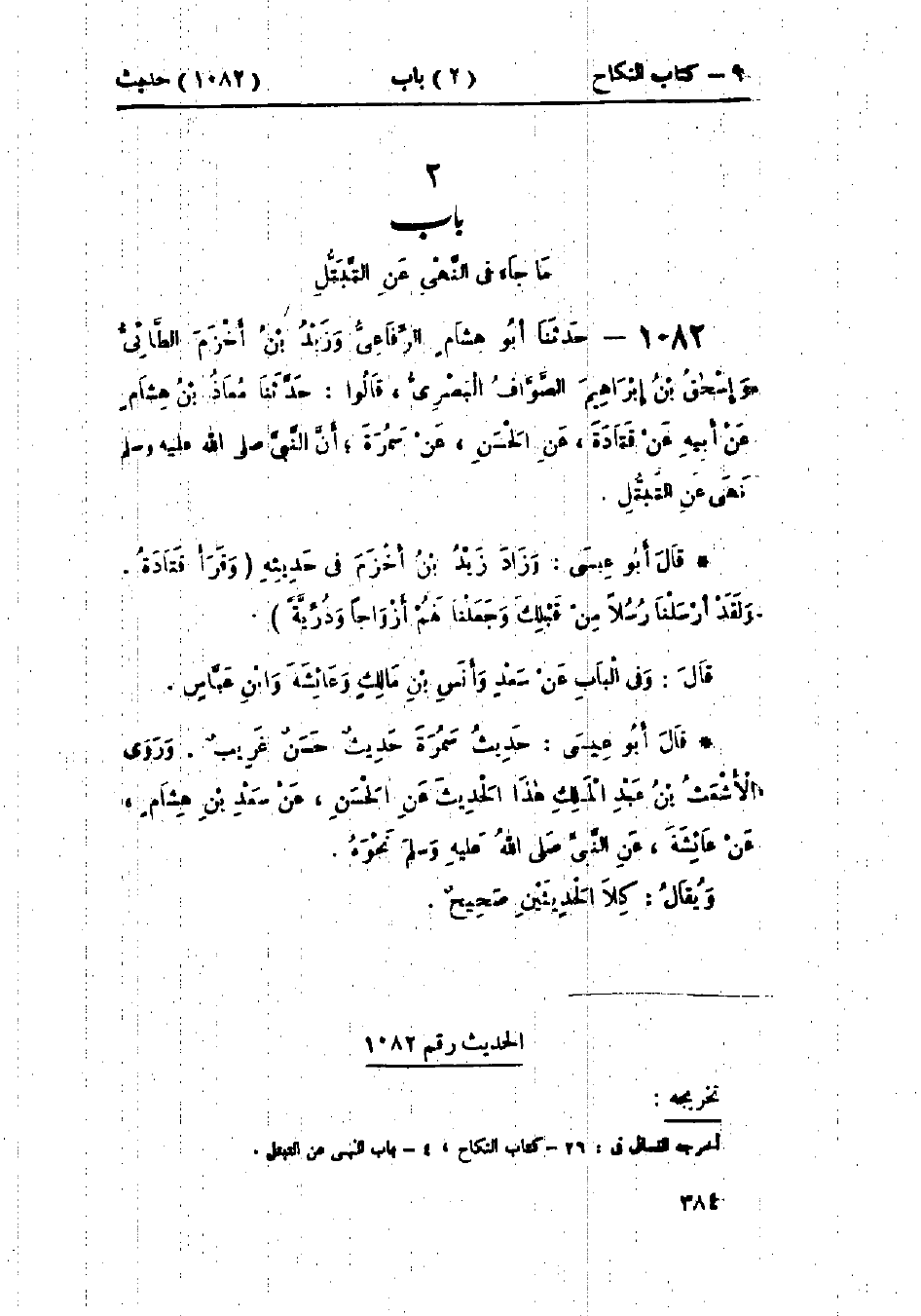 1081 - حَدَّثَنَا مَحْمُودُ بْنُ غَيْلَانَ قَالَ: حَدَّثَنَا أَبُو أَحْمَدَ الزُّبَيْرِيُّ قَالَ: حَدَّثَنَا سُفْيَانُ، عَنْ الأَعْمَشِ، عَنْ عُمَارَةَ بْنِ عُمَيْرٍ، عَنْ عَبْدِ الرَّحْمَنِ بْنِ يَزِيدَ، عَنْ عَبْدِ اللَّهِ بْنِ مَسْعُودٍ قَالَ: خَرَجْنَا مَعَ النَّبِيِّ صَلَّى اللَّهُ عَلَيْهِ وَسَلَّمَ، وَنَحْنُ شَبَابٌ لَا نَقْدِرُ عَلَى شَيْءٍ، فَقَالَ: «يَا مَعْشَرَ الشَّبَابِ، §عَلَيْكُمْ بِالبَاءَةِ، فَإِنَّهُ أَغَضُّ لِلْبَصَرِ، وَأَحْصَنُ لِلْفَرْجِ، فَمَنْ لَمْ يَسْتَطِعْ مِنْكُمُ البَاءَةَ فَعَلَيْهِ بِالصَّوْمِ، فَإِنَّ الصَّوْمَ لَهُ وِجَاءٌ»: «هَذَا حَدِيثٌ حَسَنٌ صَحِيحٌ». حَدَّثَنَا الحَسَنُ بْنُ عَلِيٍّ الخَلَّالُ قَالَ: حَدَّثَنَا عَبْدُ اللَّهِ بْنُ نُمَيْرٍ قَالَ: حَدَّثَنَا الأَعْمَشُ، عَنْ عُمَارَةَ نَحْوَهُ.: وَقَدْ رَوَى غَيْرُ وَاحِدٍ، عَنِ الأَعْمَشِ بِهَذَا الإِسْنَادِ مِثْلَ هَذَا، وَرَوَى أَبُو مُعَاوِيَةَ، وَالمُحَارِبِيُّ، عَنِ الأَعْمَشِ، عَنْ إِبْرَاهِيمَ، عَنْ عَلْقَمَةَ، عَنْ عَبْدِ اللَّهِ، عَنِ النَّبِيِّ صَلَّى اللَّهُ عَلَيْهِ وَسَلَّمَ نَحْوَهُ.: «كِلَاهُمَا صَحِيحٌ»