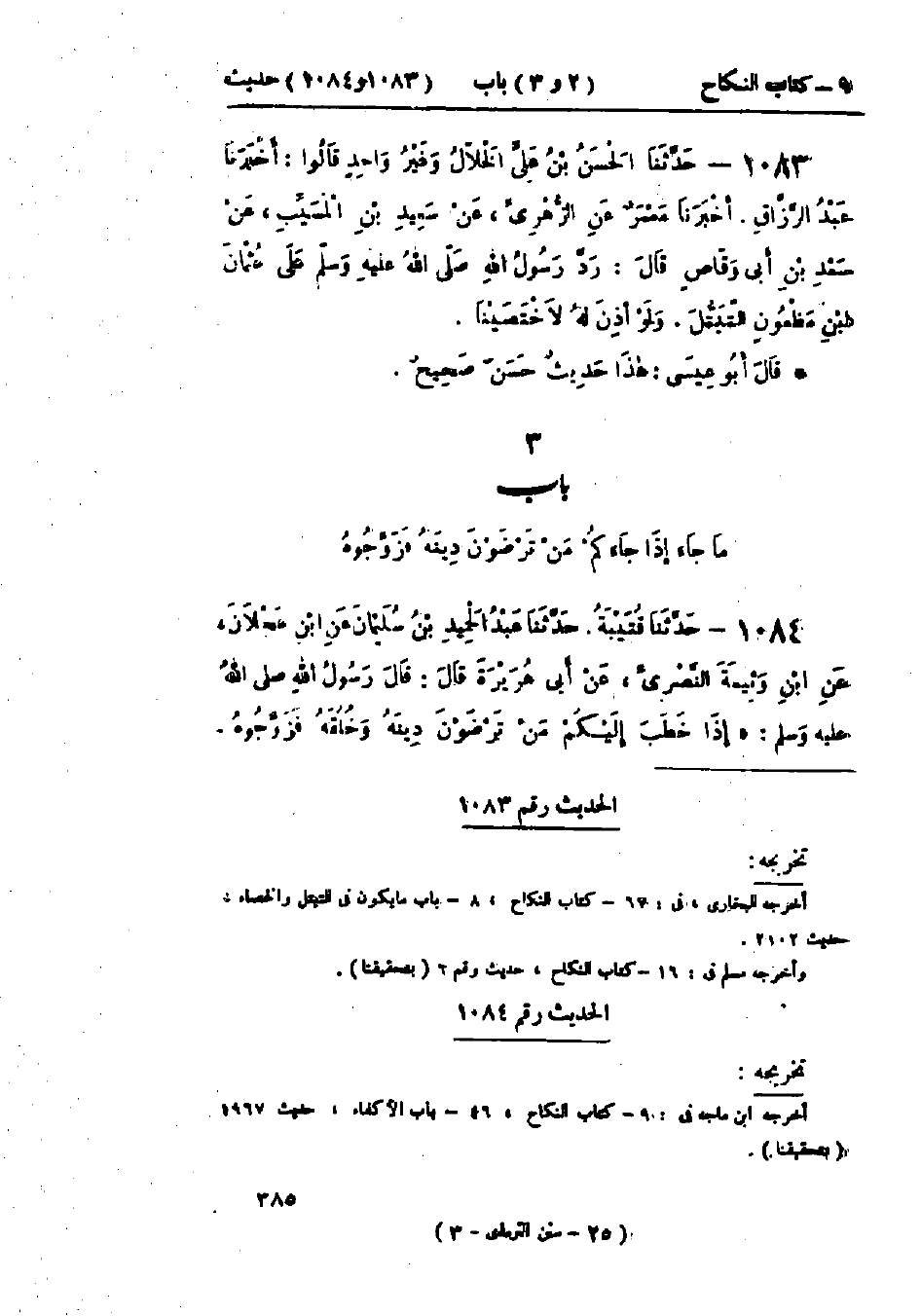 1082 - حَدَّثَنَا أَبُو هِشَامٍ الرِّفَاعِيُّ، وَزَيْدُ بْنُ أَخْزَمَ الطَّائِيُّ، وَإِسْحَاقُ بْنُ إِبْرَاهِيمَ الصَّوَّافُ البَصْرِيُّ، قَالُوا: حَدَّثَنَا مُعَاذُ بْنُ هِشَامٍ، عَنْ أَبِيهِ، عَنْ قَتَادَةَ، عَنْ الحَسَنِ، عَنْ سَمُرَةَ، «أَنَّ النَّبِيَّ صَلَّى اللَّهُ عَلَيْهِ وَسَلَّمَ §نَهَى عَنِ التَّبَتُّلِ»: وَزَادَ زَيْدُ بْنُ أَخْزَمَ فِي حَدِيثِهِ، وَقَرَأَ قَتَادَةُ: {وَلَقَدْ أَرْسَلْنَا رُسُلًا مِنْ قَبْلِكَ وَجَعَلْنَا لَهُمْ أَزْوَاجًا وَذُرِّيَّةً} [الرعد: 38] وَفِي البَاب عَنْ سَعْدٍ، وَأَنَسِ بْنِ مَالِكٍ، وَعَائِشَةَ، وَابْنِ عَبَّاسٍ.: «حَدِيثُ سَمُرَةَ حَدِيثٌ حَسَنٌ غَرِيبٌ»، وَرَوَى الأَشْعَثُ بْنُ عَبْدِ المَلِكِ هَذَا الحَدِيثَ، عَنِ الحَسَنِ، عَنْ سَعْدِ بْنِ هِشَامٍ، عَنْ عَائِشَةَ، عَنِ النَّبِيِّ صَلَّى اللَّهُ عَلَيْهِ وَسَلَّمَ نَحْوَهُ، وَيُقَالُ: «كِلَا الحَدِيثَيْنِ صَحِيحٌ»