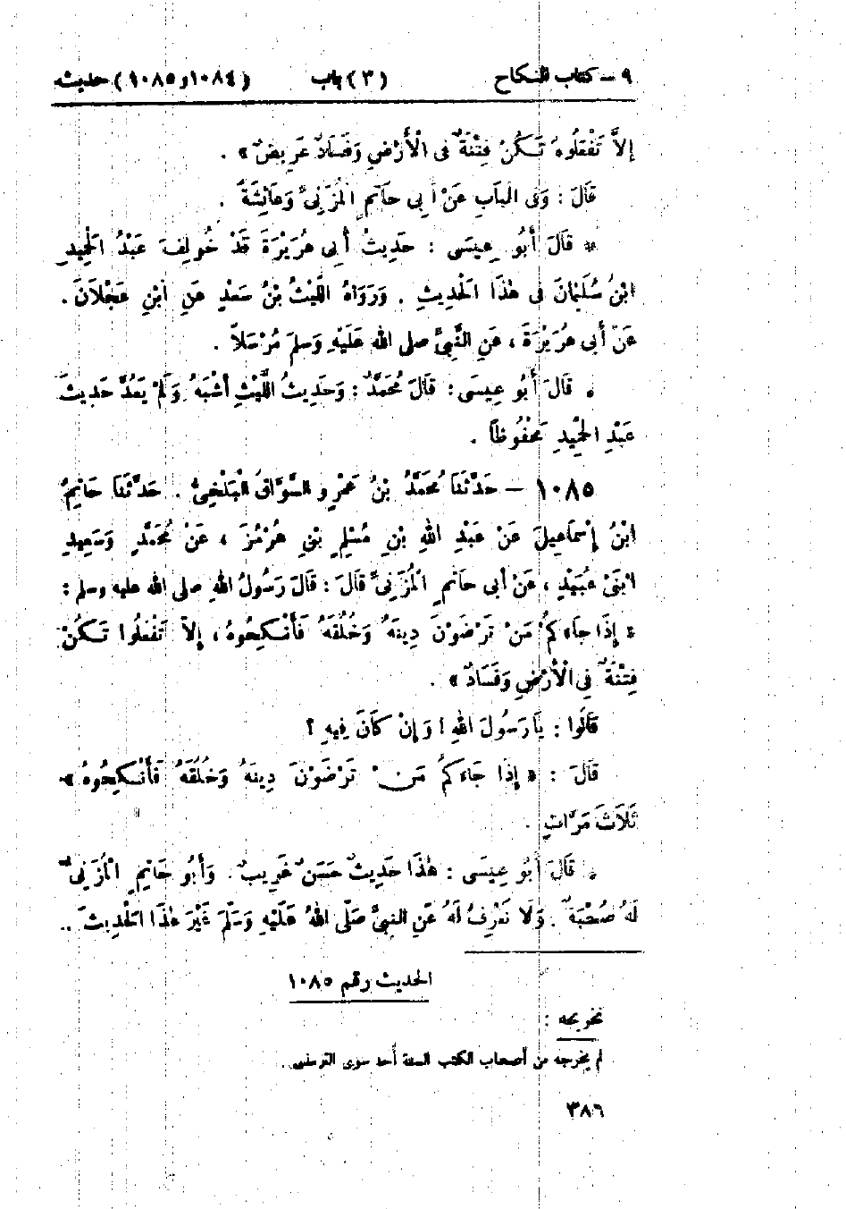 1084 - حَدَّثَنَا قُتَيْبَةُ قَالَ: حَدَّثَنَا عَبْدُ الحَمِيدِ بْنُ سُلَيْمَانَ، عَنْ ابْنِ عَجْلَانَ، عَنْ ابْنِ وَثِيمَةَ النَّصْرِيِّ، عَنْ أَبِي هُرَيْرَةَ قَالَ: قَالَ رَسُولُ اللَّهِ صَلَّى اللَّهُ عَلَيْهِ وَسَلَّمَ: «§إِذَا خَطَبَ إِلَيْكُمْ مَنْ تَرْضَوْنَ دِينَهُ وَخُلُقَهُ فَزَوِّجُوهُ، -[387]- إِلَّا تَفْعَلُوا تَكُنْ فِتْنَةٌ فِي الأَرْضِ، وَفَسَادٌ عَرِيضٌ» وَفِي البَاب عَنْ أَبِي حَاتِمٍ المُزَنِيِّ، وَعَائِشَةَ.: «حَدِيثُ أَبِي هُرَيْرَةَ قَدْ خُولِفَ عَبْدُ الحَمِيدِ بْنُ سُلَيْمَانَ فِي هَذَا الحَدِيثِ» وَرَوَاهُ اللَّيْثُ بْنُ سَعْدٍ، عَنْ ابْنِ عَجْلَانَ، عَنْ أَبِي هُرَيْرَةَ، عَنِ النَّبِيِّ صَلَّى اللَّهُ عَلَيْهِ وَسَلَّمَ مُرْسَلًا.: قَالَ مُحَمَّدٌ: «وَحَدِيثُ اللَّيْثِ أَشْبَهُ وَلَمْ يَعُدَّ حَدِيثَ عَبْدِ الحَمِيدِ مَحْفُوظًا»