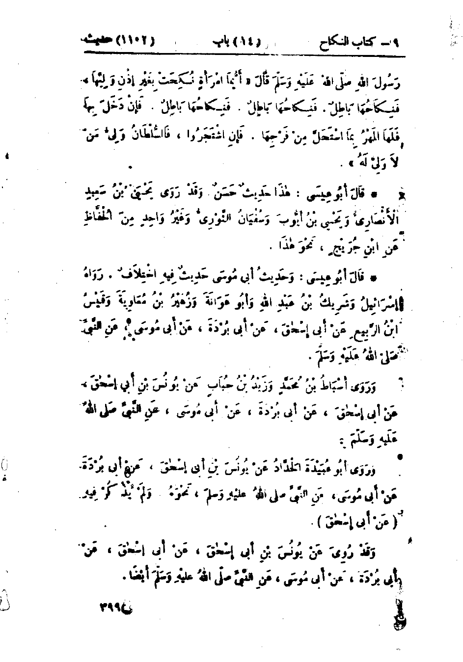 1102 - حَدَّثَنَا ابْنُ أَبِي عُمَرَ قَالَ: حَدَّثَنَا سُفْيَانُ بْنُ عُيَيْنَةَ، عَنْ ابْنِ جُرَيْجٍ، عَنْ سُلَيْمَانَ بْنِ مُوسَى، عَنْ الزُّهْرِيِّ، عَنْ عُرْوَةَ، عَنْ عَائِشَةَ، أَنَّ -[400]- رَسُولَ اللَّهِ صَلَّى اللَّهُ عَلَيْهِ وَسَلَّمَ قَالَ: «§أَيُّمَا امْرَأَةٍ نَكَحَتْ بِغَيْرِ إِذْنِ وَلِيِّهَا فَنِكَاحُهَا بَاطِلٌ، فَنِكَاحُهَا بَاطِلٌ، فَنِكَاحُهَا بَاطِلٌ، فَإِنْ دَخَلَ بِهَا فَلَهَا المَهْرُ بِمَا اسْتَحَلَّ مِنْ فَرْجِهَا، فَإِنْ اشْتَجَرُوا فَالسُّلْطَانُ وَلِيُّ مَنْ لَا وَلِيَّ لَهُ»: «هَذَا حَدِيثٌ حَسَنٌ»، وَقَدْ رَوَى يَحْيَى بْنُ سَعِيدٍ الأَنْصَارِيُّ، وَيَحْيَى بْنُ أَيُّوبَ، وَسُفْيَانُ الثَّوْرِيُّ، وَغَيْرُ وَاحِدٍ مِنَ الحُفَّاظِ، عَنْ ابْنِ جُرَيْجٍ نَحْوَ هَذَا.: «وَحَدِيثُ أَبِي مُوسَى حَدِيثٌ فِيهِ اخْتِلَافٌ». رَوَاهُ إِسْرَائِيلُ، وَشَرِيكُ بْنُ عَبْدِ اللَّهِ، وَأَبُو عَوَانَةَ، وَزُهَيْرُ بْنُ مُعَاوِيَةَ، وَقَيْسُ بْنُ الرَّبِيعِ، عَنْ أَبِي إِسْحَاقَ، عَنْ أَبِي بُرْدَةَ، عَنْ أَبِي مُوسَى، عَنِ النَّبِيِّ صَلَّى اللَّهُ عَلَيْهِ وَسَلَّمَ، وَرَوَى أَسْبَاطُ بْنُ مُحَمَّدٍ، وَزَيْدُ بْنُ حُبَابٍ، عَنْ يُونُسَ بْنِ أَبِي إِسْحَاقَ، عَنْ أَبِي إِسْحَاقَ، عَنْ أَبِي بُرْدَةَ، عَنْ أَبِي مُوسَى، عَنِ النَّبِيِّ صَلَّى اللَّهُ عَلَيْهِ وَسَلَّمَ، وَرَوَى أَبُو عُبَيْدَةَ الحَدَّادُ، عَنْ يُونُسَ بْنِ أَبِي إِسْحَاقَ، عَنْ أَبِي بُرْدَةَ، عَنْ أَبِي مُوسَى، عَنِ النَّبِيِّ صَلَّى اللَّهُ عَلَيْهِ وَسَلَّمَ نَحْوَهُ، وَلَمْ يَذْكُرْ فِيهِ عَنْ أَبِي إِسْحَاقَ، وَقَدْ رُوِيَ عَنْ يُونُسَ بْنِ أَبِي إِسْحَاقَ، عَنْ أَبِي بُرْدَةَ، عَنِ النَّبِيِّ صَلَّى اللَّهُ عَلَيْهِ وَسَلَّمَ أَيْضًا، -[401]- وَرَوَى شُعْبَةُ، وَالثَّوْرِيُّ، عَنْ أَبِي إِسْحَاقَ، عَنْ أَبِي بُرْدَةَ، عَنِ النَّبِيِّ صَلَّى اللَّهُ عَلَيْهِ وَسَلَّمَ «لَا نِكَاحَ إِلَّا بِوَلِيٍّ»، وَقَدْ ذَكَرَ بَعْضُ أَصْحَابِ سُفْيَانَ، عَنْ سُفْيَانَ، عَنْ أَبِي إِسْحَاقَ، عَنْ أَبِي بُرْدَةَ، عَنْ أَبِي مُوسَى وَلَا يَصِحُّ، وَرِوَايَةُ هَؤُلَاءِ الَّذِينَ رَوَوْا عَنْ أَبِي إِسْحَاقَ، عَنْ أَبِي بُرْدَةَ، عَنْ أَبِي مُوسَى، عَنِ النَّبِيِّ صَلَّى اللَّهُ عَلَيْهِ وَسَلَّمَ: «لَا نِكَاحَ إِلَّا بِوَلِيٍّ»، عِنْدِي أَصَحُّ، لِأَنَّ سَمَاعَهُمْ مِنْ أَبِي إِسْحَاقَ فِي أَوْقَاتٍ مُخْتَلِفَةٍ، وَإِنْ كَانَ شُعْبَةُ، وَالثَّوْرِيُّ أَحْفَظَ وَأَثْبَتَ مِنْ جَمِيعِ هَؤُلَاءِ الَّذِينَ رَوَوْا عَنْ أَبِي إِسْحَاقَ هَذَا الحَدِيثَ، فَإِنَّ رِوَايَةَ هَؤُلَاءِ عِنْدِي أَشْبَهُ لِأَنَّ شُعْبَةَ وَالثَّوْرِيَّ سَمِعَا هَذَا الحَدِيثَ مِنْ أَبِي إِسْحَاقَ فِي مَجْلِسٍ وَاحِدٍ، وَمِمَّا يَدُلُّ عَلَى ذَلِكَ: حَدَّثَنَا مَحْمُودُ بْنُ غَيْلَانَ قَالَ: حَدَّثَنَا أَبُو دَاوُدَ قَالَ: أَنْبَأَنَا شُعْبَةُ قَالَ: سَمِعْتُ سُفْيَانَ الثَّوْرِيَّ يَسْأَلُ أَبَا إِسْحَاقَ: أَسَمِعْتَ أَبَا بُرْدَةَ يَقُولُ: قَالَ رَسُولُ اللَّهِ صَلَّى اللَّهُ عَلَيْهِ وَسَلَّمَ «لَا نِكَاحَ إِلَّا بِوَلِيٍّ»؟ فَقَالَ: نَعَمْ، فَدَلَّ هَذَا الحَدِيثُ عَلَى أَنَّ سَمَاعَ شُعْبَةَ وَالثَّوْرِيِّ هَذَا الحَدِيثَ فِي وَقْتٍ وَاحِدٍ. وَإِسْرَائِيلُ هُوَ ثَبْتٌ فِي أَبِي إِسْحَاقَ. سَمِعْتُ مُحَمَّدَ بْنَ المُثَنَّى يَقُولُ: سَمِعْتُ عَبْدَ الرَّحْمَنِ بْنَ مَهْدِيٍّ يَقُولُ: «مَا فَاتَنِي مِنْ حَدِيثِ الثَّوْرِيِّ عَنْ أَبِي إِسْحَاقَ الَّذِي فَاتَنِي إِلَّا لَمَّا اتَّكَلْتُ بِهِ عَلَى إِسْرَائِيلَ لِأَنَّهُ كَانَ يَأْتِي بِهِ أَتَمَّ»، وَحَدِيثُ عَائِشَةَ فِي هَذَا البَابِ عَنِ النَّبِيِّ صَلَّى اللَّهُ 