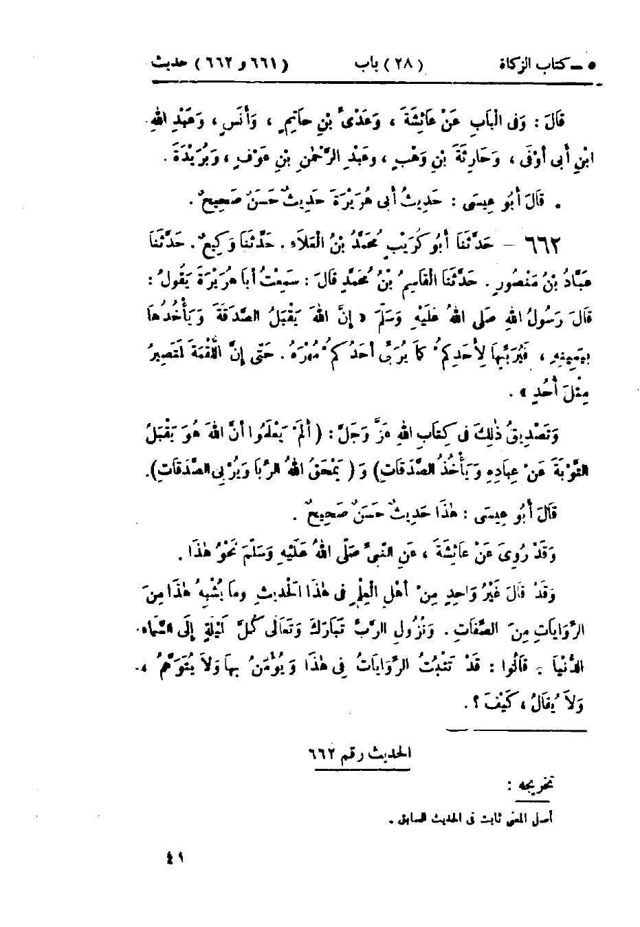 662 - حَدَّثَنَا أَبُو كُرَيْبٍ مُحَمَّدُ بْنُ العَلَاءِ قَالَ: حَدَّثَنَا وَكِيعٌ قَالَ: حَدَّثَنَا عَبَّادُ بْنُ مَنْصُورٍ قَالَ: حَدَّثَنَا القَاسِمُ بْنُ مُحَمَّدٍ، قَالَ: سَمِعْتُ أَبَا هُرَيْرَةَ يَقُولُ: قَالَ رَسُولُ اللَّهِ صَلَّى اللَّهُ عَلَيْهِ وَسَلَّمَ: " إِنَّ §اللَّهَ يَقْبَلُ الصَّدَقَةَ وَيَأْخُذُهَا بِيَمِينِهِ فَيُرَبِّيهَا لِأَحَدِكُمْ كَمَا يُرَبِّي أَحَدُكُمْ مُهْرَهُ، حَتَّى إِنَّ اللُّقْمَةَ لَتَصِيرُ مِثْلَ أُحُدٍ، وَتَصْدِيقُ ذَلِكَ فِي كِتَابِ اللَّهِ عَزَّ وَجَلَّ: {هُوَ يَقْبَلُ التَّوْبَةَ عَنْ عِبَادِهِ وَيَأْخُذُ الصَّدَقَاتِ} [التوبة: 104]، وَ {يَمْحَقُ اللَّهُ الرِّبَا وَيُرْبِي الصَّدَقَاتِ} [البقرة: 276] ": «هَذَا حَدِيثٌ حَسَنٌ صَحِيحٌ» وَقَدْ رُوِيَ عَنْ عَائِشَةَ، عَنِ النَّبِيِّ صَلَّى اللَّهُ عَلَيْهِ وَسَلَّمَ نَحْوَ هَذَا، " وَقَدْ قَالَ غَيْرُ وَاحِدٍ مِنْ أَهْلِ العِلْمِ فِي هَذَا الحَدِيثِ وَمَا يُشْبِهُ هَذَا مِنَ الرِّوَايَاتِ مِنَ الصِّفَاتِ: وَنُزُولِ الرَّبِّ تَبَارَكَ وَتَعَالَى كُلَّ لَيْلَةٍ إِلَى السَّمَاءِ الدُّنْيَا، قَالُوا: قَدْ تَثْبُتُ الرِّوَايَاتُ فِي هَذَا وَيُؤْمَنُ بِهَا وَلَا يُتَوَهَّمُ وَلَا يُقَالُ: كَيْفَ -[42]- هَكَذَا رُوِيَ عَنْ مَالِكٍ، وَسُفْيَانَ بْنِ عُيَيْنَةَ، وَعَبْدِ اللَّهِ بْنِ المُبَارَكِ أَنَّهُمْ قَالُوا فِي هَذِهِ الأَحَادِيثِ: أَمِرُّوهَا بِلَا كَيْفٍ "، وَهَكَذَا قَوْلُ أَهْلِ العِلْمِ مِنْ أَهْلِ السُّنَّةِ وَالجَمَاعَةِ، وَأَمَّا الجَهْمِيَّةُ فَأَنْكَرَتْ هَذِهِ الرِّوَايَاتِ وَقَالُوا: هَذَا تَشْبِيهٌ، وَقَدْ ذَكَرَ اللَّهُ عَزَّ وَجَلَّ فِي غَيْرِ مَوْضِعٍ مِنْ كِتَابهِ اليَدَ وَالسَّمْعَ وَالبَصَرَ، فَتَأَوَّلَتِ الجَهْمِيَّةُ هَذِهِ الآيَاتِ فَفَسَّرُوهَا عَلَى غَيْرِ مَا فَسَّرَ أَهْلُ العِلْمِ، وَقَالُوا: إِنَّ اللَّهَ لَمْ يَخْلُقْ آدَمَ بِيَدِهِ، وَقَالُوا: إِنَّ مَعْنَى اليَدِ هَاهُنَا القُوَّةُ "، وقَالَ إِسْحَاقُ بْنُ إِبْرَاهِيمَ: " إِنَّمَا يَكُونُ التَّشْبِيهُ إِذَا قَالَ: يَدٌ كَيَدٍ، أَوْ مِثْلُ يَدٍ، أَوْ سَمْعٌ كَسَمْعٍ، أَوْ مِثْلُ سَمْعٍ، فَإِذَا قَالَ: سَمْعٌ كَسَمْعٍ، أَوْ مِثْلُ سَمْعٍ، فَهَذَا التَّشْبِيهُ، وَأَمَّا إِذَا قَالَ كَمَا قَالَ اللَّهُ تَعَالَى يَدٌ، وَسَمْعٌ، وَبَصَرٌ، وَلَا يَقُولُ كَيْفَ، وَلَا يَقُولُ مِثْلُ سَمْعٍ، وَلَا كَسَمْعٍ، فَهَذَا لَا يَكُونُ تَشْبِيهًا، وَهُوَ كَمَا قَالَ اللَّهُ تَعَالَى فِي كِتَابهِ: {لَيْسَ كَمِثْلِهِ شَيْءٌ وَهُوَ السَّمِيعُ البَصِيرُ} [الشورى: 11] "