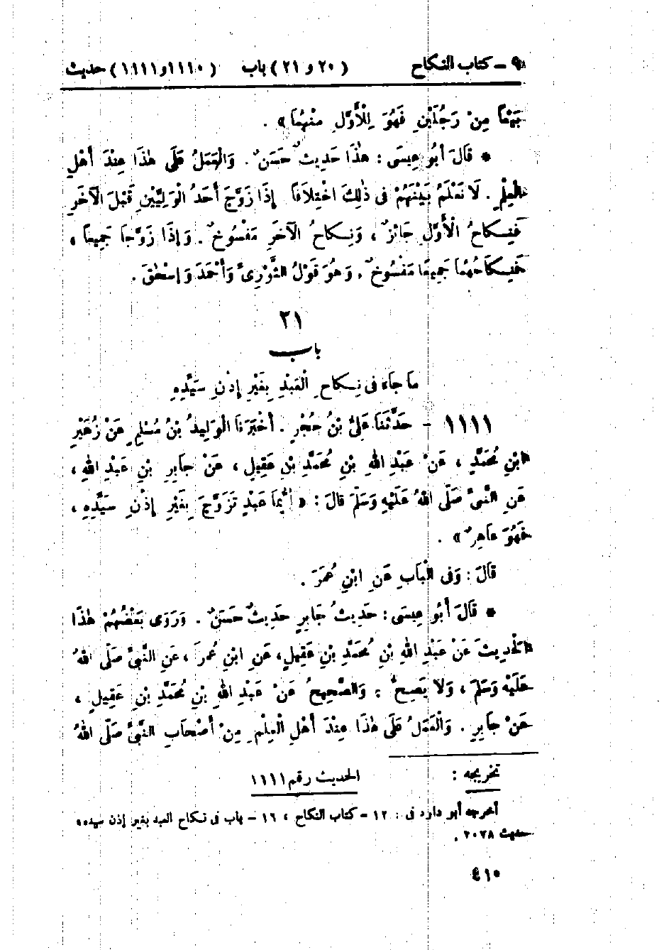 1110 - حَدَّثَنَا قُتَيْبَةُ قَالَ: حَدَّثَنَا غُنْدَرٌ قَالَ: حَدَّثَنَا سَعِيدُ بْنُ أَبِي عَرُوبَةَ، عَنْ قَتَادَةَ، عَنْ الحَسَنِ، عَنْ سَمُرَةَ بْنِ جُنْدَبٍ، أَنَّ رَسُولَ اللَّهِ صَلَّى اللَّهُ عَلَيْهِ وَسَلَّمَ قَالَ: «§أَيُّمَا امْرَأَةٍ زَوَّجَهَا وَلِيَّانِ فَهِيَ لِلأَوَّلِ مِنْهُمَا، وَمَنْ بَاعَ -[411]- بَيْعًا مِنْ رَجُلَيْنِ فَهُوَ لِلأَوَّلِ مِنْهُمَا»: «هَذَا حَدِيثٌ حَسَنٌ»، " وَالعَمَلُ عَلَى هَذَا عِنْدَ أَهْلِ العِلْمِ لَا نَعْلَمُ بَيْنَهُمْ فِي ذَلِكَ اخْتِلَافًا: إِذَا زَوَّجَ أَحَدُ الوَلِيَّيْنِ قَبْلَ الآخَرِ فَنِكَاحُ الأَوَّلِ جَائِزٌ، وَنِكَاحُ الآخَرِ مَفْسُوخٌ، وَإِذَا زَوَّجَا جَمِيعًا فَنِكَاحُهُمَا جَمِيعًا مَفْسُوخٌ، وَهُوَ قَوْلُ الثَّوْرِيِّ، وَأَحْمَدَ، وَإِسْحَاقَ "