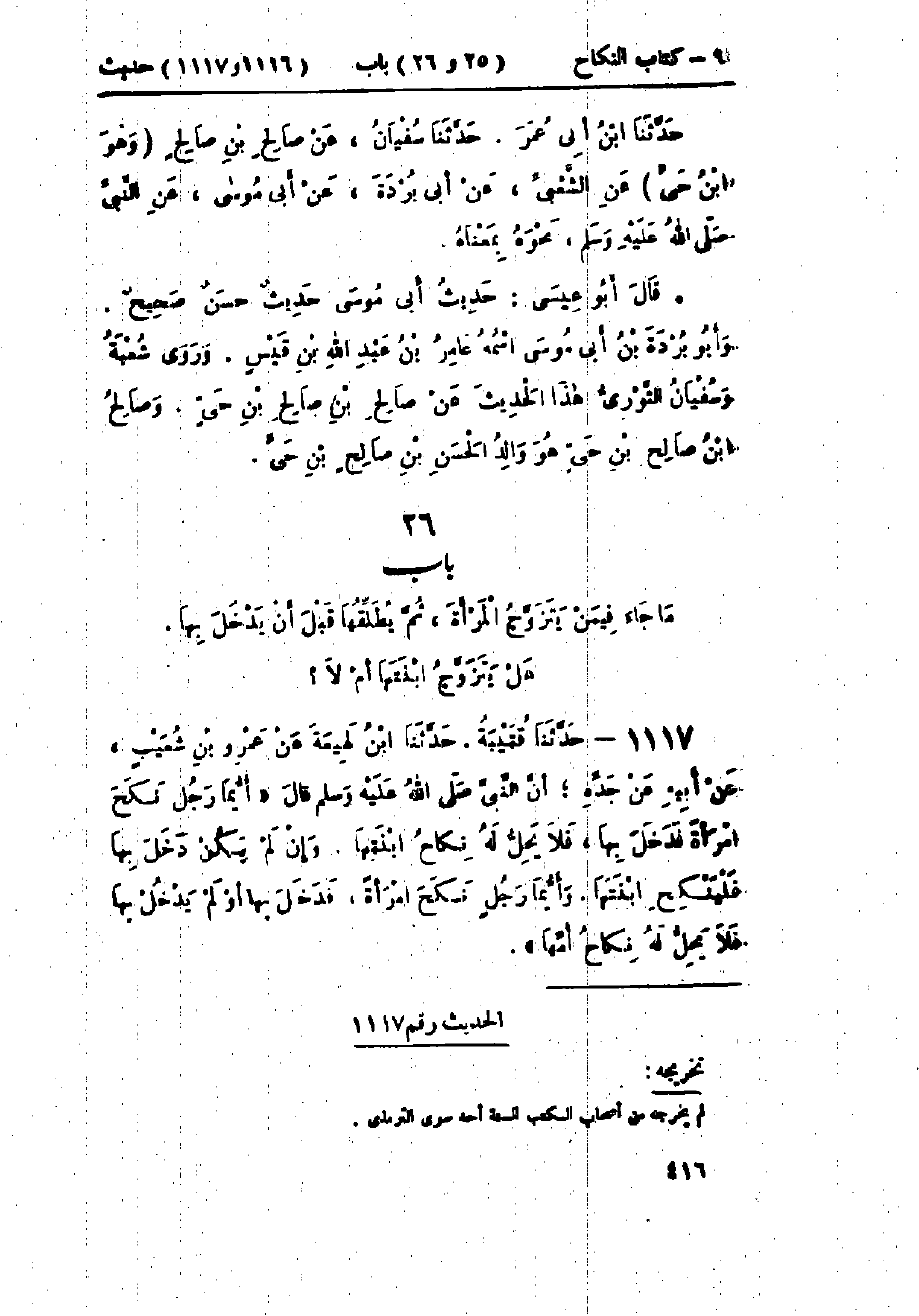 1116 - حَدَّثَنَا هَنَّادٌ قَالَ: حَدَّثَنَا عَلِيُّ بْنُ مُسْهِرٍ، عَنْ الفَضْلِ بْنِ يَزِيدَ، عَنْ الشَّعْبِيِّ، عَنْ أَبِي بُرْدَةَ بْنِ أَبِي مُوسَى، عَنْ أَبِيهِ، قَالَ: قَالَ رَسُولُ اللَّهِ صَلَّى اللَّهُ عَلَيْهِ وَسَلَّمَ: " §ثَلَاثَةٌ يُؤْتَوْنَ أَجْرَهُمْ مَرَّتَيْنِ: عَبْدٌ أَدَّى حَقَّ اللَّهِ وَحَقَّ مَوَالِيهِ، فَذَاكَ يُؤْتَى أَجْرَهُ مَرَّتَيْنِ، وَرَجُلٌ كَانَتْ عِنْدَهُ جَارِيَةٌ وَضِيئَةٌ فَأَدَّبَهَا، فَأَحْسَنَ أَدَبَهَا، ثُمَّ أَعْتَقَهَا، ثُمَّ تَزَوَّجَهَا يَبْتَغِي بِذَلِكَ وَجْهَ اللَّهِ، فَذَلِكَ يُؤْتَى أَجْرَهُ مَرَّتَيْنِ، وَرَجُلٌ آمَنَ بِالكِتَابِ الأَوَّلِ، ثُمَّ جَاءَ الكِتَابُ الآخَرُ فَآمَنَ بِهِ، فَذَلِكَ يُؤْتَى أَجْرَهُ مَرَّتَيْنِ " -[417]- حَدَّثَنَا ابْنُ أَبِي عُمَرَ قَالَ: حَدَّثَنَا سُفْيَانُ، عَنْ صَالِحِ بْنِ صَالِحٍ، وَهُوَ ابْنُ حَيٍّ، عَنِ الشَّعْبِيِّ، عَنْ أَبِي بُرْدَةَ، عَنْ أَبِي مُوسَى، عَنِ النَّبِيِّ صَلَّى اللَّهُ عَلَيْهِ وَسَلَّمَ نَحْوَهُ بِمَعْنَاهُ.: «حَدِيثُ أَبِي مُوسَى حَدِيثٌ حَسَنٌ صَحِيحٌ»، " وَأَبُو بُرْدَةَ بْنُ أَبِي مُوسَى: اسْمُهُ عَامِرُ بْنُ عَبْدِ اللَّهِ بْنِ قَيْسٍ "، وَرَوَى شُعْبَةُ، وَسُفْيَانُ الثَّوْرِيُّ هَذَا الحَدِيثَ، عَنْ صَالِحِ بْنِ صَالِحِ بْنِ حَيٍّ، وَصَالِحُ بْنُ صَالِحِ بْنِ حَيٍّ هُوَ وَالِدُ الحَسَنِ بْنِ صَالِحِ بْنِ حَيٍّ
