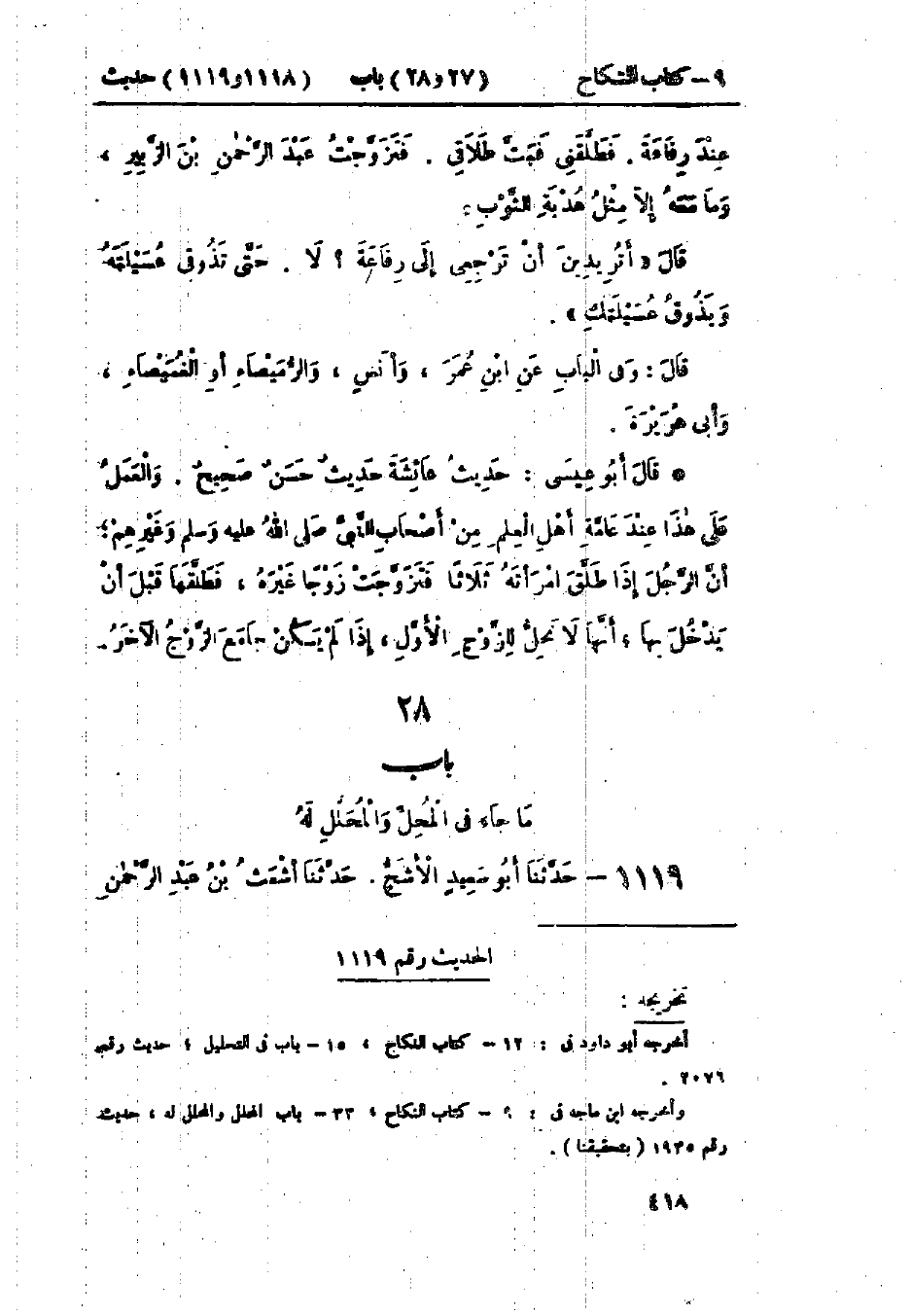 1118 - حَدَّثَنَا ابْنُ أَبِي عُمَرَ، وَإِسْحَاقُ بْنُ مَنْصُورٍ، قَالَا: حَدَّثَنَا سُفْيَانُ بْنُ عُيَيْنَةَ، عَنْ الزُّهْرِيِّ، عَنْ عُرْوَةَ، عَنْ عَائِشَةَ قَالَتْ: جَاءَتْ امْرَأَةُ رِفَاعَةَ القُرَظِيِّ إِلَى رَسُولِ اللَّهِ صَلَّى اللَّهُ عَلَيْهِ وَسَلَّمَ، فَقَالَتْ: إِنِّي كُنْتُ -[419]- عِنْدَ رِفَاعَةَ فَطَلَّقَنِي، فَبَتَّ طَلَاقِي، فَتَزَوَّجْتُ عَبْدَ الرَّحْمَنِ بْنَ الزَّبِيرِ وَمَا مَعَهُ إِلَّا مِثْلُ هُدْبَةِ الثَّوْبِ، فَقَالَ: «أَتُرِيدِينَ أَنْ تَرْجِعِي إِلَى رِفَاعَةَ؟ لَا، §حَتَّى تَذُوقِي عُسَيْلَتَهُ وَيَذُوقَ عُسَيْلَتَكِ» وَفِي البَاب عَنْ ابْنِ عُمَرَ، وَأَنَسٍ، وَالرُّمَيْصَاءِ أَوْ الغُمَيْصَاءِ، وَأَبِي هُرَيْرَةَ.: «حَدِيثُ عَائِشَةَ حَدِيثٌ حَسَنٌ صَحِيحٌ»، " وَالعَمَلُ عَلَى هَذَا عِنْدَ عَامَّةِ أَهْلِ العِلْمِ مِنْ أَصْحَابِ النَّبِيِّ صَلَّى اللَّهُ عَلَيْهِ وَسَلَّمَ وَغَيْرِهِمْ: أَنَّ الرَّجُلَ إِذَا طَلَّقَ امْرَأَتَهُ ثَلَاثًا فَتَزَوَّجَتْ زَوْجًا غَيْرَهُ فَطَلَّقَهَا قَبْلَ أَنْ يَدْخُلَ بِهَا أَنَّهَا لَا تَحِلُّ لِلزَّوْجِ الأَوَّلِ إِذَا لَمْ يَكُنْ جَامَعَ الزَّوْجُ الآخَرُ "