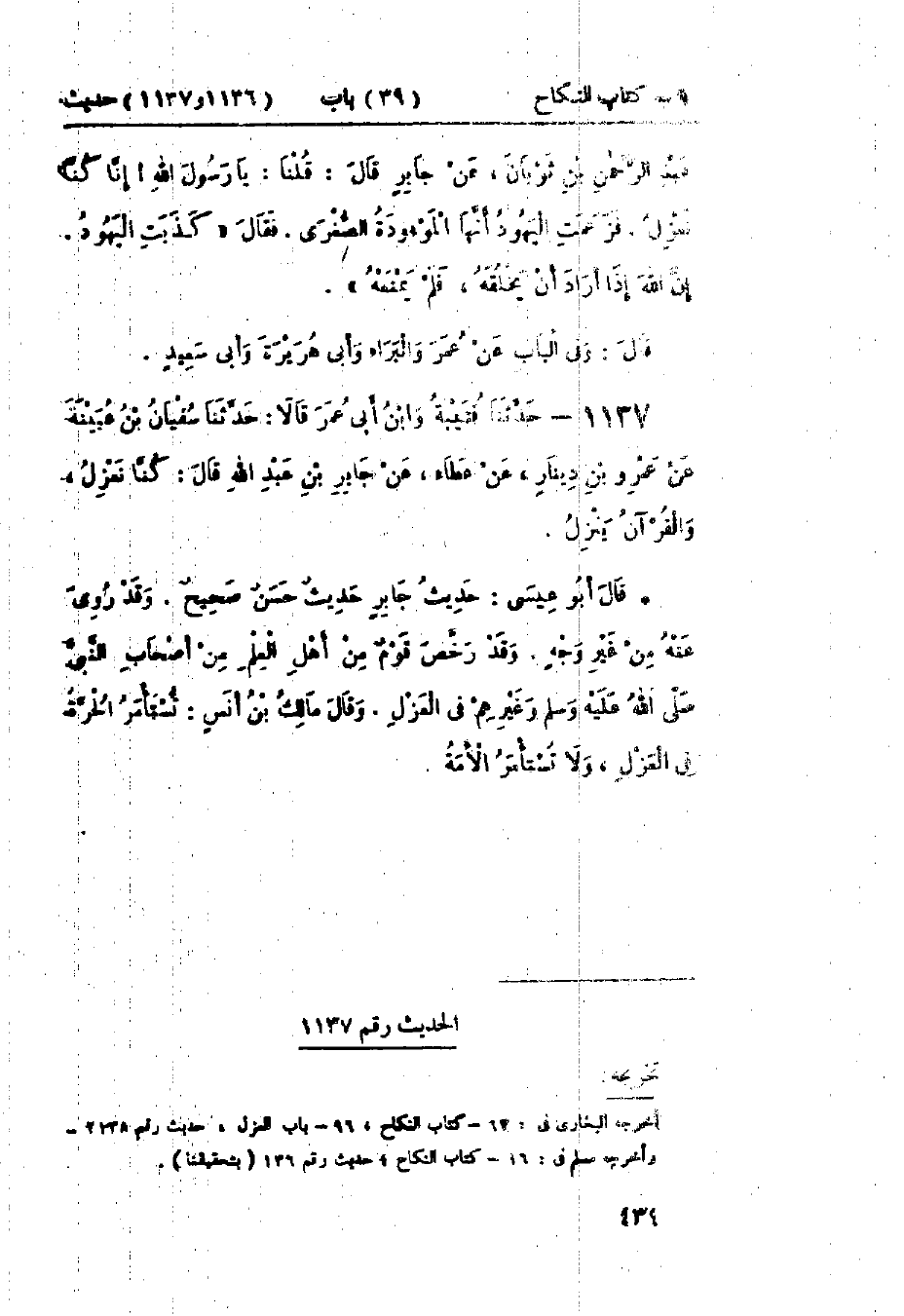 1136 - حَدَّثَنَا مُحَمَّدُ بْنُ عَبْدِ المَلِكِ بْنِ أَبِي الشَّوَارِبِ قَالَ: حَدَّثَنَا يَزِيدُ بْنُ زُرَيْعٍ قَالَ: حَدَّثَنَا مَعْمَرٌ، عَنْ يَحْيَى بْنِ أَبِي كَثِيرٍ، عَنْ مُحَمَّدِ بْنِ -[435]- عَبْدِ الرَّحْمَنِ بْنِ ثَوْبَانَ، عَنْ جَابِرٍ قَالَ: قُلْنَا: يَا رَسُولَ اللَّهِ، إِنَّا كُنَّا نَعْزِلُ، فَزَعَمَتِ اليَهُودُ أَنَّهَا المَوْءُودَةُ الصُّغْرَى، فَقَالَ: «§كَذَبَتِ اليَهُودُ، إِنَّ اللَّهَ إِذَا أَرَادَ أَنْ يَخْلُقَهُ فَلَمْ يَمْنَعْهُ» وَفِي البَاب عَنْ عُمَرَ، وَالبَرَاءِ، وَأَبِي هُرَيْرَةَ، وَأَبِي سَعِيدٍ