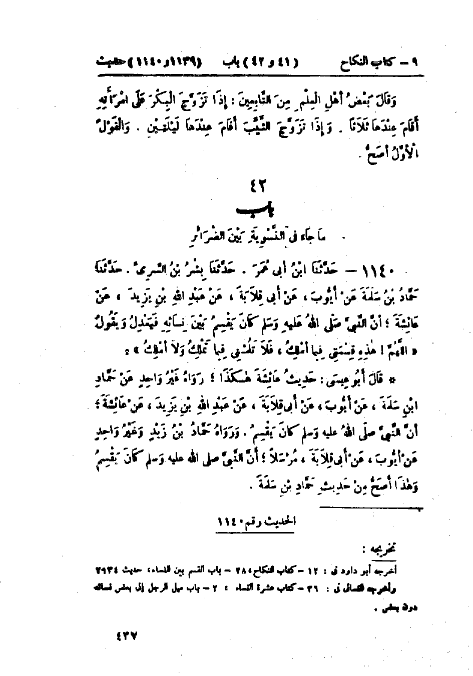 1139 - حَدَّثَنَا أَبُو سَلَمَةَ يَحْيَى بْنُ خَلَفٍ قَالَ: حَدَّثَنَا بِشْرُ بْنُ المُفَضَّلِ، عَنْ خَالِدٍ الحَذَّاءِ، عَنْ أَبِي قِلَابَةَ، عَنْ أَنَسِ بْنِ مَالِكٍ قَالَ: لَوْ شِئْتُ أَنْ أَقُولَ قَالَ رَسُولُ اللَّهِ صَلَّى اللَّهُ عَلَيْهِ وَسَلَّمَ، وَلَكِنَّهُ قَالَ: «§السُّنَّةُ إِذَا تَزَوَّجَ الرَّجُلُ البِكْرَ عَلَى امْرَأَتِهِ أَقَامَ عِنْدَهَا سَبْعًا، وَإِذَا تَزَوَّجَ الثَّيِّبَ عَلَى امْرَأَتِهِ أَقَامَ عِنْدَهَا ثَلَاثًا» وَفِي البَاب عَنْ أُمِّ سَلَمَةَ.: «حَدِيثُ أَنَسٍ حَدِيثٌ حَسَنٌ صَحِيحٌ» وَقَدْ رَفَعَهُ مُحَمَّدُ بْنُ إِسْحَاقَ، عَنْ أَيُّوبَ، عَنْ أَبِي قِلَابَةَ، عَنْ أَنَسٍ وَلَمْ يَرْفَعْهُ بَعْضُهُمْ. وَالعَمَلُ عَلَى هَذَا عِنْدَ بَعْضِ أَهْلِ العِلْمِ قَالُوا: إِذَا تَزَوَّجَ الرَّجُلُ امْرَأَةً بِكْرًا عَلَى امْرَأَتِهِ أَقَامَ عِنْدَهَا سَبْعًا، ثُمَّ قَسَمَ بَيْنَهُمَا بَعْدُ بِالعَدْلِ، وَإِذَا تَزَوَّجَ الثَّيِّبَ عَلَى امْرَأَتِهِ أَقَامَ عِنْدَهَا ثَلَاثًا، وَهُوَ قَوْلُ مَالِكٍ، وَالشَّافِعِيِّ، وَأَحْمَدَ، وَإِسْحَاقَ. -[438]- وَقَالَ بَعْضُ أَهْلِ العِلْمِ مِنَ التَّابِعِينَ: إِذَا تَزَوَّجَ البِكْرَ عَلَى امْرَأَتِهِ أَقَامَ عِنْدَهَا ثَلَاثًا، وَإِذَا تَزَوَّجَ الثَّيِّبَ أَقَامَ عِنْدَهَا لَيْلَتَيْنِ وَالقَوْلُ الأَوَّلُ أَصَحُّ