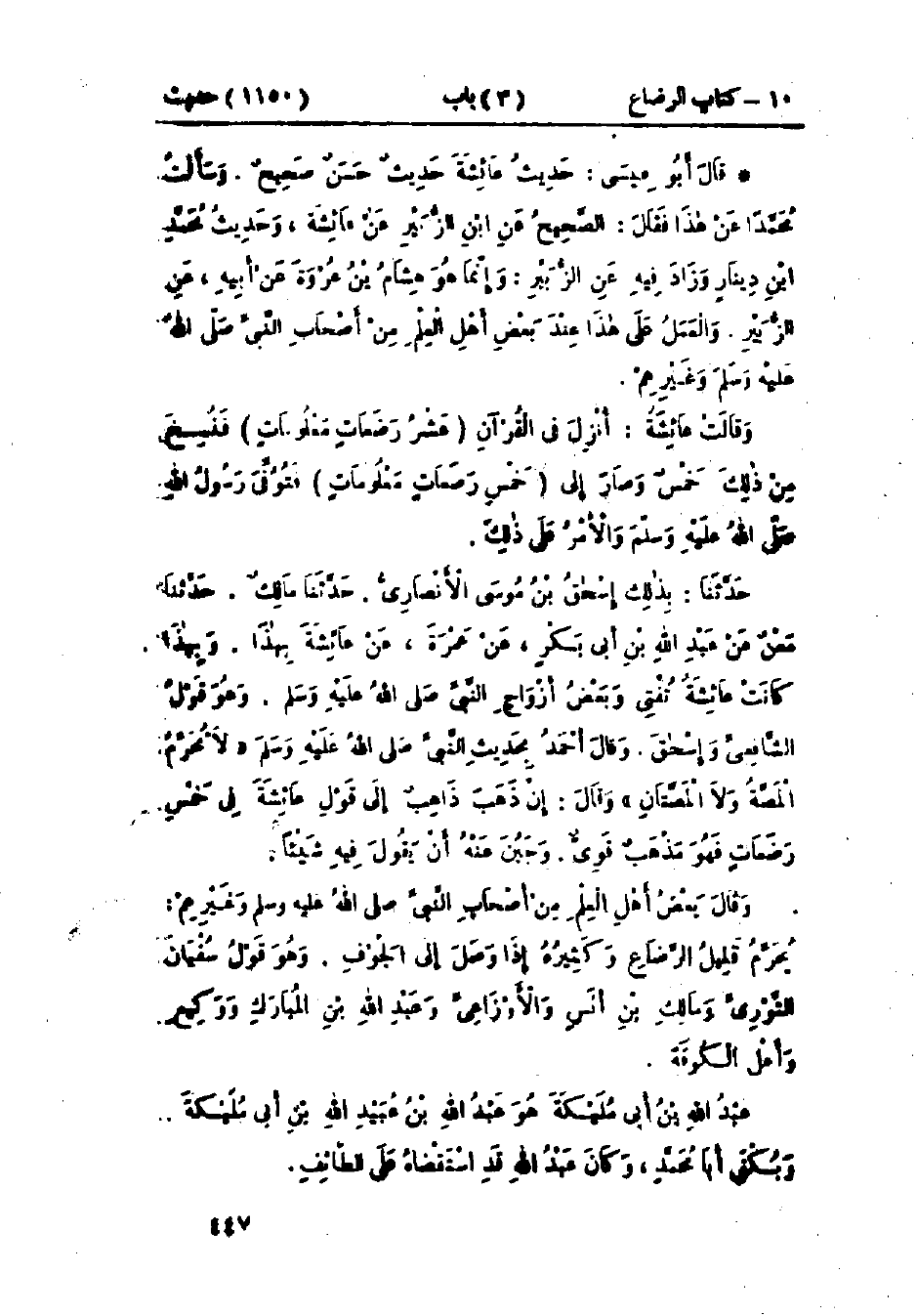 1150 - حَدَّثَنَا مُحَمَّدُ بْنُ عَبْدِ الأَعْلَى الصَّنْعَانِيُّ، قَالَ: حَدَّثَنَا المُعْتَمِرُ بْنُ سُلَيْمَانَ، قَالَ: سَمِعْتُ أَيُّوبَ يُحَدِّثُ، عَنْ عَبْدِ اللَّهِ بْنِ أَبِي مُلَيْكَةَ، عَنْ عَبْدِ اللَّهِ بْنِ الزُّبَيْرِ، عَنْ عَائِشَةَ، عَنْ النَّبِيِّ صَلَّى اللَّهُ عَلَيْهِ وَسَلَّمَ قَالَ: «§لَا تُحَرِّمُ المَصَّةُ وَلَا المَصَّتَانِ» وَفِي البَاب عَنْ أُمِّ الفَضْلِ، وَأَبِي هُرَيْرَةَ، وَالزُّبَيْرِ بْنِ العَوَّامِ، وَابْنِ الزُّبَيْرِ. وَرَوَى غَيْرُ وَاحِدٍ هَذَا الحَدِيثَ، عَنْ هِشَامِ بْنِ عُرْوَةَ، عَنْ أَبِيهِ، عَنْ عَبْدِ اللَّهِ بْنِ الزُّبَيْرِ، عَنِ النَّبِيِّ صَلَّى اللَّهُ عَلَيْهِ وَسَلَّمَ قَالَ: «لَا تُحَرِّمُ المَصَّةُ وَلَا المَصَّتَانِ»، وَرَوَى مُحَمَّدُ بْنُ دِينَارٍ، عَنْ هِشَامِ بْنِ عُرْوَةَ، عَنْ أَبِيهِ، عَنْ عَبْدِ اللَّهِ بْنِ الزُّبَيْرِ، عَنِ الزُّبَيْرِ، عَنِ النَّبِيِّ صَلَّى اللَّهُ عَلَيْهِ وَسَلَّمَ، وَزَادَ فِيهِ مُحَمَّدُ بْنُ دِينَارٍ البَصْرِيُّ، عَنِ الزُّبَيْرِ، عَنِ النَّبِيِّ صَلَّى اللَّهُ عَلَيْهِ وَسَلَّمَ، وَهُوَ غَيْرُ مَحْفُوظٍ، وَالصَّحِيحُ عِنْدَ أَهْلِ الحَدِيثِ حَدِيثُ ابْنِ أَبِي مُلَيْكَةَ، عَنْ عَبْدِ اللَّهِ بْنِ الزُّبَيْرِ، عَنْ عَائِشَةَ، عَنِ النَّبِيِّ صَلَّى اللَّهُ عَلَيْهِ وَسَلَّمَ: -[448]- «حَدِيثُ عَائِشَةَ حَدِيثٌ حَسَنٌ صَحِيحٌ»، وَسَأَلْتُ مُحَمَّدًا عَنْ هَذَا، فَقَالَ: «الصَّحِيحُ عَنْ ابْنِ الزُّبَيْرِ، عَنْ عَائِشَةَ، وَحَدِيثُ مُحَمَّدِ بْنِ دِينَارٍ وَزَادَ فِيهِ، عَنِ الزُّبَيْرِ، وَإِنَّمَا هُوَ هِشَامُ بْنُ عُرْوَةَ، عَنْ أَبِيهِ، عَنِ الزُّبَيْرِ» وَالعَمَلُ عَلَى هَذَا عِنْدَ بَعْضِ أَهْلِ العِلْمِ مِنْ أَصْحَابِ النَّبِيِّ صَلَّى اللَّهُ عَلَيْهِ وَسَلَّمَ وَغَيْرِهِمْ "