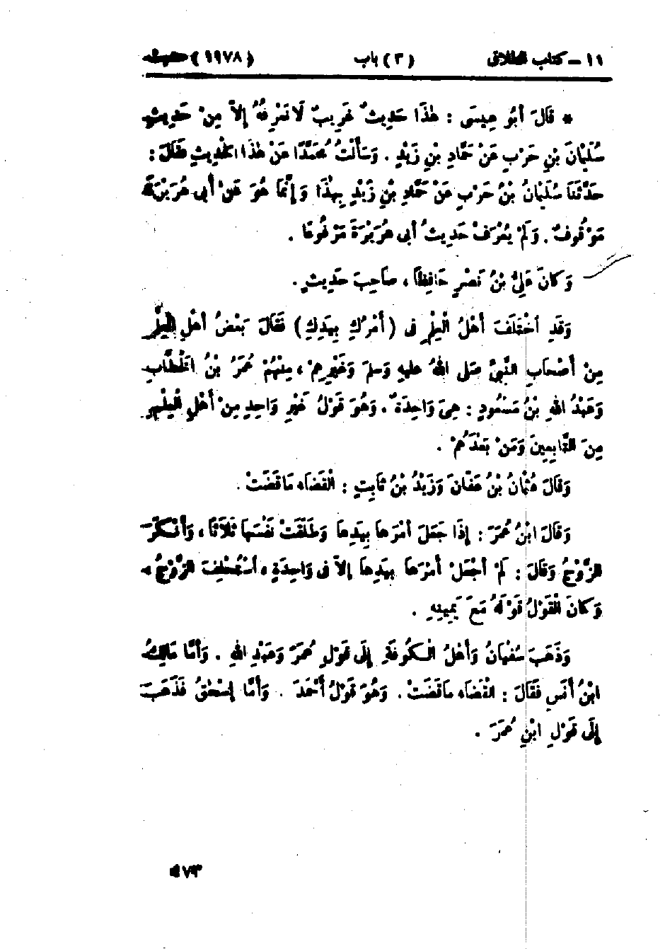 1178 - حَدَّثَنَا عَلِيُّ بْنُ نَصْرِ بْنِ عَلِيٍّ قَالَ: حَدَّثَنَا سُلَيْمَانُ بْنُ حَرْبٍ قَالَ: حَدَّثَنَا حَمَّادُ بْنُ زَيْدٍ، قَالَ: قُلْتُ لِأَيُّوبَ: هَلْ عَلِمْتَ أَنَّ أَحَدًا قَالَ فِي أَمْرُكِ بِيَدِكِ إِنَّهَا ثَلَاثٌ إِلَّا الحَسَنَ؟، فَقَالَ: لَا، إِلَّا الحَسَنَ، ثُمَّ قَالَ: اللَّهُمَّ غَفْرًا إِلَّا مَا حَدَّثَنِي قَتَادَةُ عَنْ كَثِيرٍ، مَوْلَى بَنِي سَمُرَةَ، عَنْ أَبِي سَلَمَةَ، عَنْ أَبِي هُرَيْرَةَ، عَنِ النَّبِيِّ صَلَّى اللَّهُ عَلَيْهِ وَسَلَّمَ قَالَ: «§ثَلَاثٌ»، قَالَ أَيُّوبُ: فَلَقِيتُ كَثِيرًا مَوْلَى بَنِي سَمُرَةَ فَسَأَلْتُهُ: فَلَمْ يَعْرِفْهُ، فَرَجَعْتُ إِلَى قَتَادَةَ فَأَخْبَرْتُهُ، فَقَالَ: نَسِيَ. -[474]- هَذَا حَدِيثٌ لَا نَعْرِفُهُ إِلَّا مِنْ حَدِيثِ سُلَيْمَانَ بْنِ حَرْبٍ عَنْ حَمَّادِ بْنِ زَيْدٍ، وَسَأَلْتُ مُحَمَّدًا عَنْ هَذَا الحَدِيثِ فَقَالَ: حَدَّثَنَا سُلَيْمَانُ بْنُ حَرْبٍ، عَنْ حَمَّادِ بْنِ زَيْدٍ بِهَذَا، وَإِنَّمَا هُوَ عَنْ أَبِي هُرَيْرَةَ مَوْقُوفٌ، وَلَمْ يَعْرِفْ مَحَمَّدٌ حَدِيثُ أَبِي هُرَيْرَةَ مَرْفُوعًا. وَكَانَ عَلِيُّ بْنُ نَصْرٍ حَافِظًا صَاحِبَ حَدِيثٍ، وَقَدْ اخْتَلَفَ أَهْلُ العِلْمِ فِي أَمْرُكِ بِيَدِكِ، فَقَالَ بَعْضُ أَهْلِ العِلْمِ مِنْ أَصْحَابِ النَّبِيِّ صَلَّى اللَّهُ عَلَيْهِ وَسَلَّمَ وَغَيْرِهِمْ مِنْهُمْ عُمَرُ بْنُ الخَطَّابِ وَعَبْدُ اللَّهِ بْنُ مَسْعُودٍ: هِيَ وَاحِدَةٌ، وَهُوَ قَوْلُ غَيْرِ وَاحِدٍ مِنْ أَهْلِ العِلْمِ مِنَ التَّابِعِينَ وَمَنْ بَعْدَهُمْ، وقَالَ عُثْمَانُ بْنُ عَفَّانَ، وَزَيْدُ بْنُ ثَابِتٍ: «القَضَاءُ مَا قَضَتْ»، وقَالَ ابْنُ عُمَرَ: " إِذَا جَعَلَ أَمْرَهَا بِيَدِهَا، وَطَلَّقَتْ نَفْسَهَا ثَلَاثًا، وَأَنْكَرَ الزَّوْجُ وَقَالَ: لَمْ أَجْعَلْ أَمْرَهَا بِيَدِهَا إِلَّا فِي وَاحِدَةٍ اسْتُحْلِفَ الزَّوْجُ، وَكَانَ القَوْلُ قَوْلَهُ مَعَ يَمِينِهِ "، وَذَهَبَ سُفْيَانُ وَأَهْلُ الكُوفَةِ إِلَى قَوْلِ عُمَرَ وَعَبْدِ اللَّهِ، وَأَمَّا مَالِكُ بْنُ أَنَسٍ، فَقَالَ: «القَضَاءُ مَا قَضَتْ»، وَهُوَ قَوْلُ أَحْمَدَ، وَأَمَّا إِسْحَاقُ فَذَهَبَ إِلَى قَوْلِ ابْنِ عُمَرَ