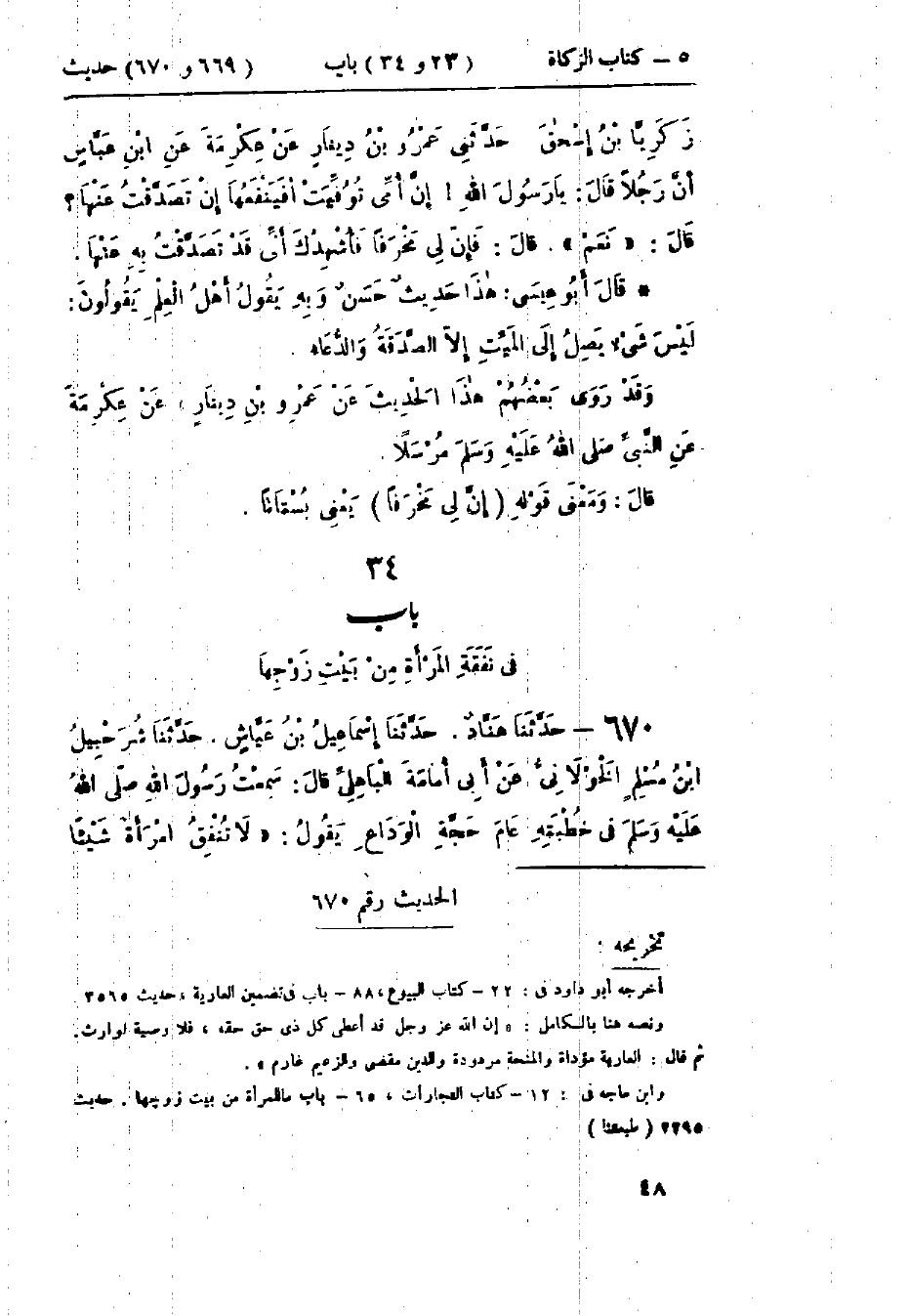 670 - حَدَّثَنَا هَنَّادٌ قَالَ: حَدَّثَنَا إِسْمَاعِيلُ بْنُ عَيَّاشٍ قَالَ: حَدَّثَنَا شُرَحْبِيلُ بْنُ مُسْلِمٍ الخَوْلَانِيُّ، عَنْ أَبِي أُمَامَةَ البَاهِلِيِّ قَالَ: سَمِعْتُ رَسُولَ اللَّهِ صَلَّى اللَّهُ عَلَيْهِ وَسَلَّمَ فِي خُطْبَتِهِ عَامَ حَجَّةِ الوَدَاعِ يَقُولُ: «§لَا تُنْفِقُ امْرَأَةٌ شَيْئًا -[49]- مِنْ بَيْتِ زَوْجِهَا إِلَّا بِإِذْنِ زَوْجِهَا»، قِيلَ: يَا رَسُولَ اللَّهِ، وَلَا الطَّعَامُ، قَالَ: «ذَاكَ أَفْضَلُ أَمْوَالِنَا» وَفِي البَابِ عَنْ سَعْدِ بْنِ أَبِي وَقَّاصٍ، وَأَسْمَاءَ بِنْتِ أَبِي بَكْرٍ، وَأَبِي هُرَيْرَةَ، وَعَبْدِ اللَّهِ بْنِ عَمْرٍو، وَعَائِشَةَ.: «حَدِيثُ أَبِي أُمَامَةَ حَدِيثٌ حَسَنٌ»