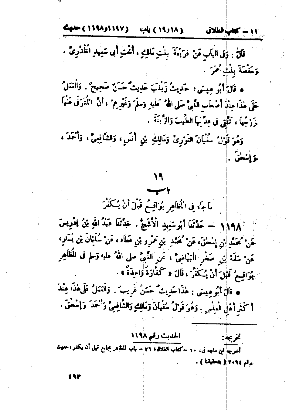1197 - قَالَتْ زَيْنَبُ: وَسَمِعْتُ أُمِّي أُمَّ سَلَمَةَ، تَقُولُ: جَاءَتْ امْرَأَةٌ إِلَى رَسُولِ اللَّهِ صَلَّى اللَّهُ عَلَيْهِ وَسَلَّمَ، فَقَالَتْ: يَا رَسُولَ اللَّهِ، إِنَّ ابْنَتِي تُوُفِّيَ عَنْهَا زَوْجُهَا، وَقَدْ اشْتَكَتْ عَيْنَيْهَا، أَفَنَكْحَلُهَا؟ فَقَالَ رَسُولُ اللَّهِ صَلَّى اللَّهُ عَلَيْهِ وَسَلَّمَ: «لَا» مَرَّتَيْنِ، أَوْ ثَلَاثَ مَرَّاتٍ كُلُّ ذَلِكَ يَقُولُ «لَا»، ثُمَّ قَالَ: «§إِنَّمَا هِيَ أَرْبَعَةَ أَشْهُرٍ وَعَشْرًا، وَقَدْ كَانَتْ إِحْدَاكُنَّ فِي الجَاهِلِيَّةِ تَرْمِي بِالبَعْرَةِ عَلَى رَأْسِ الحَوْلِ» -[494]- وَفِي البَاب عَنْ فُرَيْعَةَ بِنْتِ مَالِكٍ أُخْتِ أَبِي سَعِيدٍ الخُدْرِيِّ، وَحَفْصَةَ بِنْتِ عُمَرَ.: «حَدِيثُ زَيْنَبَ حَدِيثٌ حَسَنٌ صَحِيحٌ» وَالعَمَلُ عَلَى هَذَا عِنْدَ أَصْحَابِ النَّبِيِّ صَلَّى اللَّهُ عَلَيْهِ وَسَلَّمَ وَغَيْرِهِمْ: أَنَّ المُتَوَفَّى عَنْهَا زَوْجُهَا تَتَّقِي فِي عِدَّتِهَا الطِّيبَ وَالزِّينَةَ، وَهُوَ قَوْلُ سُفْيَانَ الثَّوْرِيِّ، وَمَالِكِ بْنِ أَنَسٍ، وَالشَّافِعِيِّ، وَأَحْمَدَ، وَإِسْحَاقَ "