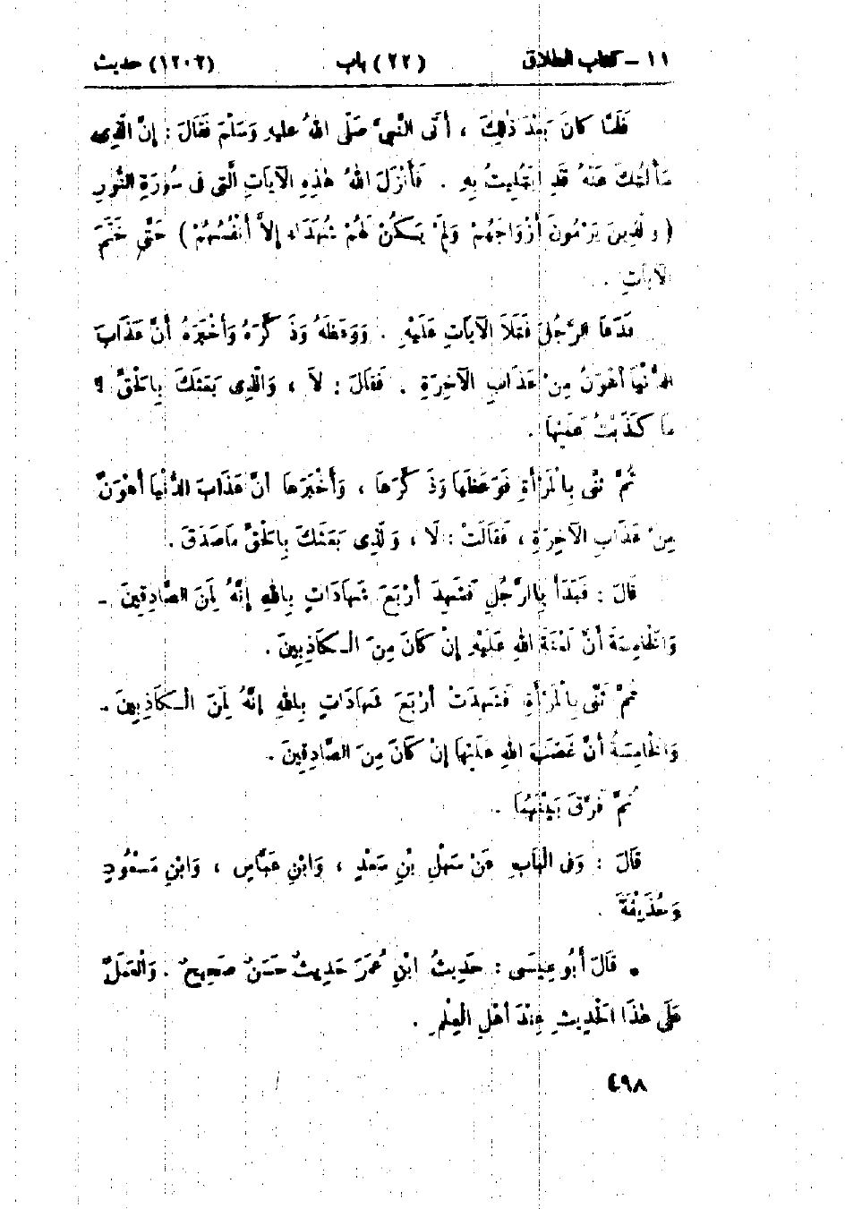 1202 - حَدَّثَنَا هَنَّادٌ قَالَ: حَدَّثَنَا عَبْدَةُ بْنُ سُلَيْمَانَ، عَنْ عَبْدِ المَلِكِ بْنِ أَبِي سُلَيْمَانَ، عَنْ سَعِيدِ بْنِ جُبَيْرٍ، قَالَ: سُئِلْتُ عَنِ المُتَلَاعِنَيْنِ فِي إِمَارَةِ مُصْعَبِ بْنِ الزُّبَيْرِ، أَيُفَرَّقُ بَيْنَهُمَا؟ فَمَا دَرَيْتُ مَا أَقُولُ، فَقُمْتُ مَكَانِي إِلَى مَنْزِلِ عَبْدِ اللَّهِ بْنِ عُمَرَ اسْتَأْذَنْتُ عَلَيْهِ، فَقِيلَ لِي: إِنَّهُ قَائِلٌ، فَسَمِعَ كَلَامِي، فَقَالَ: ابْنُ جُبَيْرٍ ادْخُلْ، مَا جَاءَ بِكَ إِلَّا حَاجَةٌ؟ قَالَ: فَدَخَلْتُ، فَإِذَا هُوَ مُفْتَرِشٌ بَرْذَعَةَ رَحْلٍ لَهُ، فَقُلْتُ: يَا أَبَا عَبْدِ الرَّحْمَنِ المُتَلَاعِنَانِ أَيُفَرَّقُ بَيْنَهُمَا؟ فَقَالَ: سُبْحَانَ اللَّهِ، نَعَمْ، إِنَّ أَوَّلَ مَنْ سَأَلَ عَنْ ذَلِكَ فُلَانُ بْنُ فُلَانٍ، أَتَى النَّبِيَّ صَلَّى اللَّهُ عَلَيْهِ وَسَلَّمَ، فَقَالَ: يَا رَسُولَ اللَّهِ، أَرَأَيْتَ لَوْ أَنَّ أَحَدَنَا رَأَى امْرَأَتَهُ عَلَى فَاحِشَةٍ كَيْفَ يَصْنَعُ؟ إِنْ تَكَلَّمَ، تَكَلَّمَ بِأَمْرٍ عَظِيمٍ، وَإِنْ سَكَتَ، سَكَتَ عَلَى أَمْرٍ عَظِيمٍ، قَالَ: فَسَكَتَ النَّبِيُّ صَلَّى اللَّهُ عَلَيْهِ وَسَلَّمَ فَلَمْ يُجِبْهُ، -[499]- فَلَمَّا كَانَ بَعْدَ ذَلِكَ، أَتَى النَّبِيَّ صَلَّى اللَّهُ عَلَيْهِ وَسَلَّمَ، فَقَالَ: " إِنَّ §الَّذِي سَأَلْتُكَ عَنْهُ قَدْ ابْتُلِيتُ بِهِ، فَأَنْزَلَ اللَّهُ هَذِهِ الآيَاتِ الَّتِي فِي سُورَةِ النُّورِ: {وَالَّذِينَ يَرْمُونَ أَزْوَاجَهُمْ وَلَمْ يَكُنْ لَهُمْ شُهَدَاءُ إِلَّا أَنْفُسُهُمْ} [النور: 6] " حَتَّى خَتَمَ الآيَاتِ، فَدَعَا الرَّجُلَ، فَتَلَا الآيَاتِ عَلَيْهِ، وَوَعَظَهُ، وَذَكَّرَهُ، وَأَخْبَرَهُ أَنَّ عَذَابَ الدُّنْيَا أَهْوَنُ مِنْ عَذَابِ الآخِرَةِ فَقَالَ: لَا وَالَّذِي بَعَثَكَ بِالحَقِّ مَا كَذَبْتُ عَلَيْهَا، ثُمَّ ثَنَّى بِالمَرْأَةِ، فَوَعَظَهَا، وَذَكَّرَهَا، وَأَخْبَرَهَا أَنَّ عَذَابَ الدُّنْيَا أَهْوَنُ مِنْ عَذَابِ الآخِرَةِ، فَقَالَتْ: لَا وَالَّذِي بَعَثَكَ بِالحَقِّ مَا صَدَقَ، قَالَ: فَبَدَأَ بِالرَّجُلِ، فَشَهِدَ أَرْبَعَ شَهَادَاتٍ بِاللَّهِ إِنَّهُ لَمِنَ الصَّادِقِينَ، وَالخَامِسَةُ أَنَّ لَعْنَةَ اللَّهِ عَلَيْهِ إِنْ كَانَ مِنَ الكَاذِبِينَ، ثُمَّ ثَنَّى بِالمَرْأَةِ فَشَهِدَتْ أَرْبَعَ شَهَادَاتٍ بِاللَّهِ إِنَّهُ لَمِنَ الكَاذِبِينَ، وَالخَامِسَةَ أَنَّ غَضَبَ اللَّهِ عَلَيْهَا إِنْ كَانَ مِنَ الصَّادِقِينَ، ثُمَّ فَرَّقَ بَيْنَهُمَا، وَفِي البَاب عَنْ سَهْلِ بْنِ سَعْدٍ، وَابْنِ عَبَّاسٍ، وَابْنِ مَسْعُودٍ، وَحُذَيْفَةَ.: «حَدِيثُ ابْنِ عُمَرَ حَدِيثٌ حَسَنٌ صَحِيحٌ، وَالعَمَلُ عَلَى هَذَا الحَدِيثِ عِنْدَ أَهْلِ العِلْمِ»