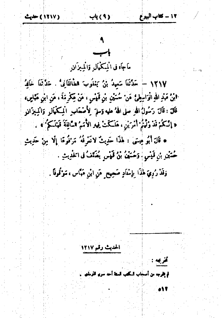 1216 - حَدَّثَنَا مُحَمَّدُ بْنُ بَشَّارٍ قَالَ: أَخْبَرَنَا عَبَّادُ بْنُ لَيْثٍ صَاحِبُ الكَرَابِيسِيِّ البَصْرِيُّ قَالَ: أَخْبَرَنَا عَبْدُ المَجِيدِ بْنُ وَهْبٍ، قَالَ: قَالَ لِي العَدَّاءُ بْنُ خَالِدِ بْنِ هَوْذَةَ: أَلَا أُقْرِئُكَ كِتَابًا كَتَبَهُ لِي رَسُولُ اللَّهِ صَلَّى اللَّهُ عَلَيْهِ وَسَلَّمَ، قَالَ: قُلْتُ: بَلَى، فَأَخْرَجَ لِي كِتَابًا: «§هَذَا مَا اشْتَرَى العَدَّاءُ بْنُ خَالِدِ بْنِ هَوْذَةَ مِنْ مُحَمَّدٍ رَسُولِ اللَّهِ صَلَّى اللَّهُ عَلَيْهِ وَسَلَّمَ، اشْتَرَى مِنْهُ عَبْدًا أَوْ أَمَةً، لَا دَاءَ وَلَا غَائِلَةَ وَلَا خِبْثَةَ، بَيْعَ المُسْلِمِ المُسْلِمَ»: «هَذَا حَدِيثٌ حَسَنٌ غَرِيبٌ، لَا نَعْرِفُهُ إِلَّا مِنْ حَدِيثِ عَبَّادِ بْنِ لَيْثٍ، وَقَدْ رَوَى عَنْهُ هَذَا الحَدِيثَ غَيْرُ وَاحِدٍ مِنْ أَهْلِ الحَدِيثِ»
