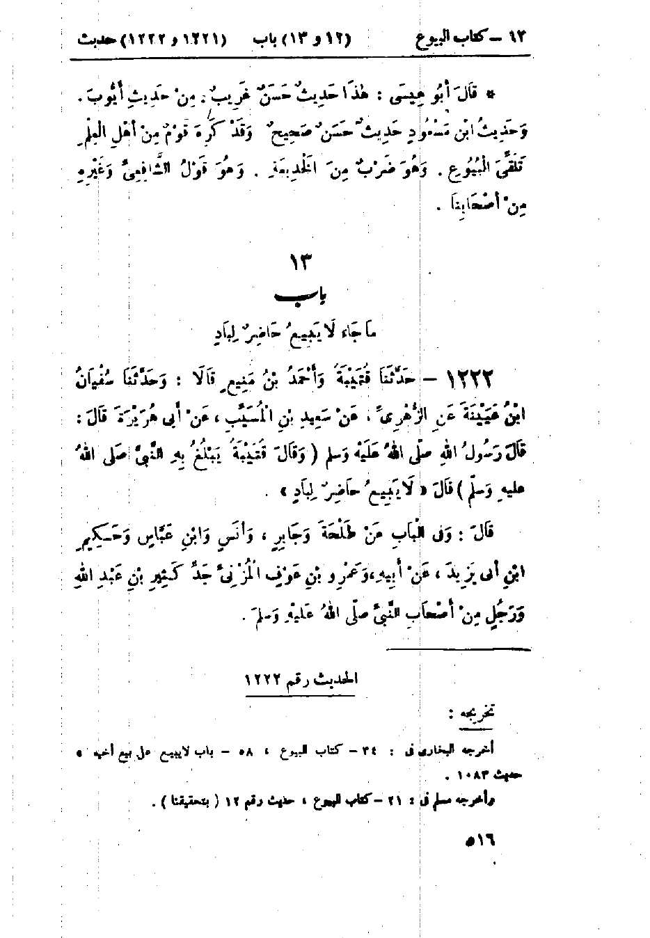 1220 - حَدَّثَنَا هَنَّادٌ قَالَ: حَدَّثَنَا ابْنُ المُبَارَكِ قَالَ: أَخْبَرَنَا سُلَيْمَانُ التَّيْمِيُّ، عَنْ أَبِي عُثْمَانَ، عَنْ ابْنِ مَسْعُودٍ، عَنِ النَّبِيِّ صَلَّى اللَّهُ عَلَيْهِ وَسَلَّمَ أَنَّهُ: «§نَهَى عَنْ تَلَقِّي البُيُوعِ» وَفِي البَاب عَنْ عَلِيٍّ، وَابْنِ عَبَّاسٍ، وَأَبِي هُرَيْرَةَ، وَأَبِي سَعِيدٍ، وَابْنِ عُمَرَ، وَرَجُلٍ مِنْ أَصْحَابِ النَّبِيِّ صَلَّى اللَّهُ عَلَيْهِ وَسَلَّمَ