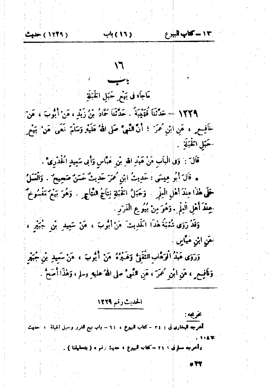 1228 - حَدَّثَنَا الحَسَنُ بْنُ عَلِيٍّ الخَلَّالُ قَالَ: حَدَّثَنَا أَبُو الوَلِيدِ، وَعَفَّانُ، وَسُلَيْمَانُ بْنُ حَرْبٍ قَالُوا: حَدَّثَنَا حَمَّادُ بْنُ سَلَمَةَ، عَنْ حُمَيْدٍ، عَنْ أَنَسٍ، «أَنَّ رَسُولَ اللَّهِ صَلَّى اللَّهُ عَلَيْهِ وَسَلَّمَ §نَهَى عَنْ بَيْعِ العِنَبِ حَتَّى يَسْوَدَّ، وَعَنْ بَيْعِ الحَبِّ حَتَّى يَشْتَدَّ»: «هَذَا حَدِيثٌ حَسَنٌ غَرِيبٌ لَا نَعْرِفُهُ مَرْفُوعًا، إِلَّا مِنْ حَدِيثِ حَمَّادِ بْنِ سَلَمَةَ»
