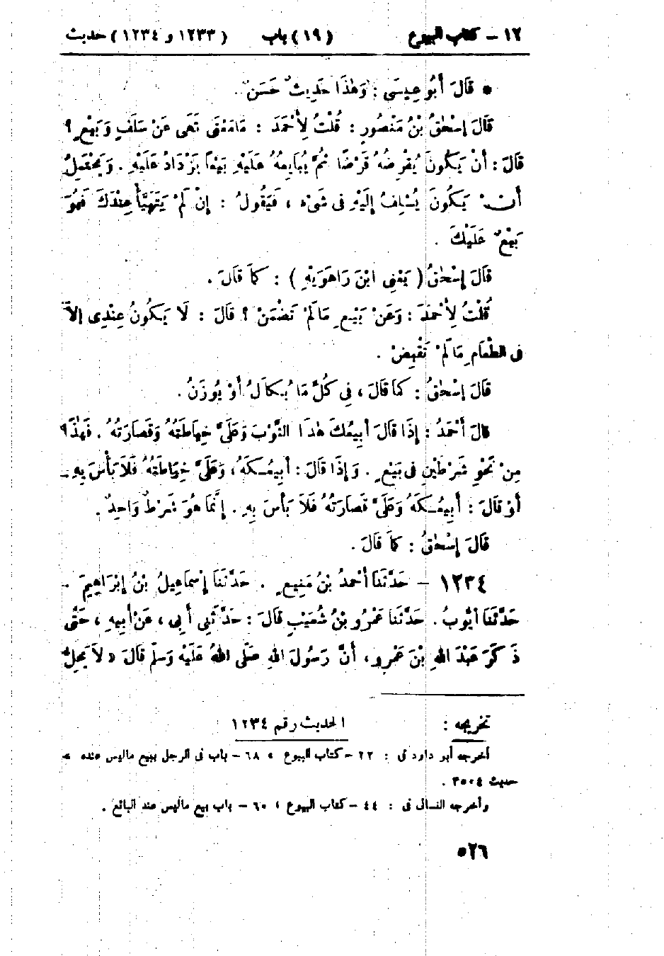 1233 - حَدَّثَنَا قُتَيْبَةُ قَالَ: حَدَّثَنَا حَمَّادُ بْنُ زَيْدٍ، عَنْ أَيُّوبَ، عَنْ يُوسُفَ بْنِ مَاهَكَ، عَنْ حَكِيمِ بْنِ حِزَامٍ قَالَ: «§نَهَانِي رَسُولُ اللَّهِ صَلَّى اللَّهُ عَلَيْهِ وَسَلَّمَ أَنْ أَبِيعَ مَا لَيْسَ عِنْدِي»: