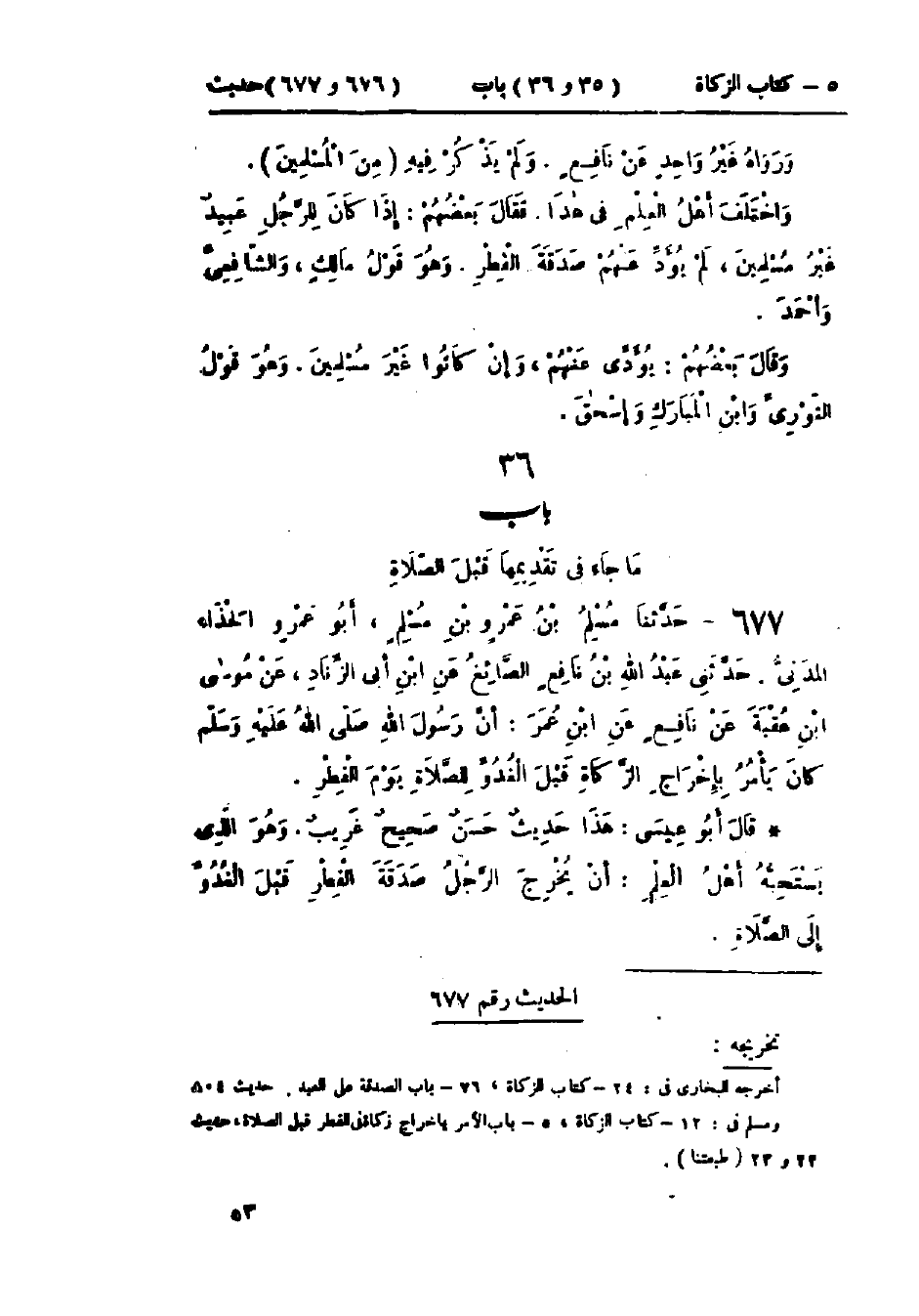 677 - حَدَّثَنَا مُسْلِمُ بْنُ عَمْرِو بْنِ مُسْلِمٍ أَبُو عَمْرٍو الْحَذَّاءُ الْمَدِينِيُّ قَالَ: حَدَّثَنِي عَبْدُ اللَّهِ بْنُ نَافِعٍ، عَنْ ابْنِ أَبِي الزِّنَادِ، عَنْ مُوسَى بْنِ عُقْبَةَ، عَنْ نَافِعٍ، عَنْ ابْنِ عُمَرَ، «أَنَّ رَسُولَ اللَّهِ صَلَّى اللَّهُ عَلَيْهِ وَسَلَّمَ كَانَ §يَأْمُرُ بِإِخْرَاجِ الزَّكَاةِ قَبْلَ الغُدُوِّ لِلصَّلَاةِ يَوْمَ الفِطْرِ»: «هَذَا حَدِيثٌ حَسَنٌ صَحِيحٌ غَرِيبٌ»، وَهُوَ الَّذِي يَسْتَحِبُّهُ أَهْلُ العِلْمِ: أَنْ يُخْرِجَ الرَّجُلُ صَدَقَةَ الفِطْرِ قَبْلَ الغُدُوِّ إِلَى الصَّلَاةِ "