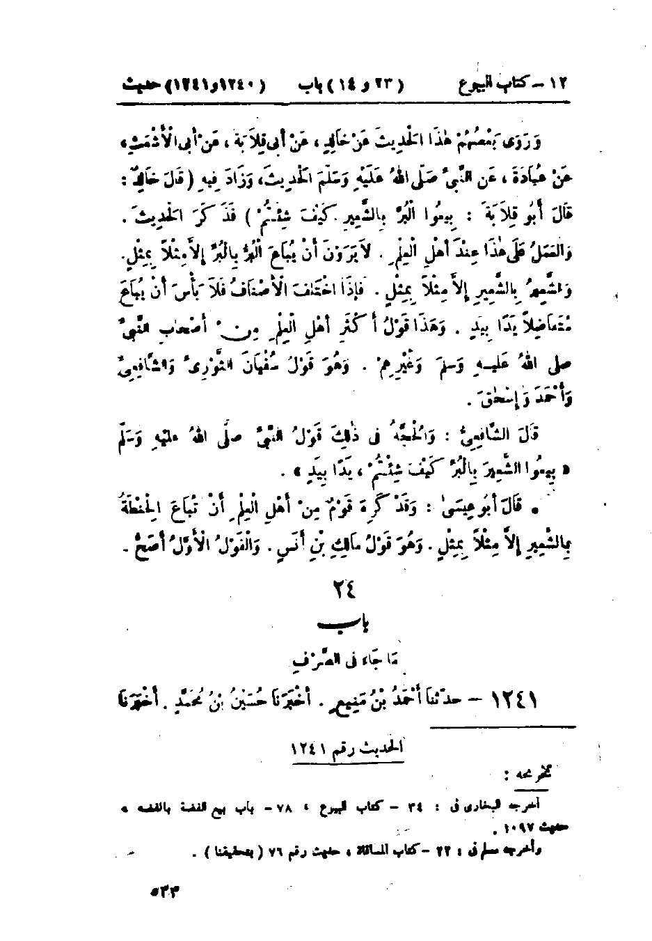 1240 - حَدَّثَنَا سُوَيْدُ بْنُ نَصْرٍ قَالَ: حَدَّثَنَا عَبْدُ اللَّهِ بْنُ المُبَارَكِ قَالَ: أَخْبَرَنَا سُفْيَانُ، عَنْ خَالِدٍ الحَذَّاءِ، عَنْ أَبِي قِلَابَةَ، عَنْ أَبِي الأَشْعَثِ، عَنْ عُبَادَةَ بْنِ الصَّامِتِ، عَنِ النَّبِيِّ صَلَّى اللَّهُ عَلَيْهِ وَسَلَّمَ قَالَ: «§الذَّهَبُ بِالذَّهَبِ مِثْلًا بِمِثْلٍ، وَالفِضَّةُ بِالفِضَّةِ مِثْلًا بِمِثْلٍ، وَالتَّمْرُ بِالتَّمْرِ مِثْلًا بِمِثْلٍ، وَالبُرُّ بِالبُرِّ مِثْلًا بِمِثْلٍ، وَالمِلْحُ بِالمِلْحِ مِثْلًا بِمِثْلٍ، وَالشَّعِيرُ بِالشَّعِيرِ مِثْلًا بِمِثْلٍ، فَمَنْ زَادَ أَوْ ازْدَادَ فَقَدْ أَرْبَى، بِيعُوا الذَّهَبَ بِالفِضَّةِ كَيْفَ شِئْتُمْ يَدًا بِيَدٍ، وَبِيعُوا البُرَّ بِالتَّمْرِ كَيْفَ شِئْتُمْ يَدًا بِيَدٍ، وَبِيعُوا الشَّعِيرَ بِالتَّمْرِ كَيْفَ شِئْتُمْ يَدًا بِيَدٍ» وَفِي البَابِ عَنْ أَبِي سَعِيدٍ، وَأَبِي هُرَيْرَةَ، وَبِلَالٍ، وَأَنَسٍ: حَدِيثُ عُبَادَةَ حَدِيثٌ حَسَنٌ صَحِيحٌ وَقَدْ رَوَى بَعْضُهُمْ هَذَا الحَدِيثَ، عَنْ خَالِدٍ بِهَذَا الإِسْنَادِ، وَقَالَ: «بِيعُوا البُرُّ بِالشَّعِيرِ كَيْفَ شِئْتُمْ يَدًا بِيَدٍ»، -[534]- وَرَوَى بَعْضُهُمْ هَذَا الحَدِيثَ، عَنْ خَالِدٍ، عَنْ أَبِي قِلَابَةَ، عَنْ أَبِي الأَشْعَثِ، عَنْ عُبَادَةَ، عَنِ النَّبِيِّ صَلَّى اللَّهُ عَلَيْهِ وَسَلَّمَ الحَدِيثَ وَزَادَ فِيهِ، قَالَ خَالِدٌ: قَالَ أَبُو قِلَابَةَ: «بِيعُوا البُرَّ بِالشَّعِيرِ كَيْفَ شِئْتُمْ»، فَذَكَرَ الحَدِيثَ، وَالعَمَلُ عَلَى هَذَا عِنْدَ أَهْلِ العِلْمِ: لَا يَرَوْنَ أَنْ يُبَاعَ البُرُّ بِالبُرِّ إِلَّا مِثْلًا بِمِثْلٍ، وَالشَّعِيرُ بِالشَّعِيرِ إِلَّا مِثْلًا بِمِثْلٍ، فَإِذَا اخْتَلَفَتِ الْأَصْنَافُ فَلَا بَأْسَ أَنْ يُبَاعَ مُتَفَاضِلًا إِذَا كَانَ يَدًا بِيَدٍ، وَهَذَا قَوْلُ أَكْثَرِ أَهْلِ العِلْمِ مِنْ أَصْحَابِ النَّبِيِّ صَلَّى اللَّهُ عَلَيْهِ وَسَلَّمَ وَغَيْرِهِمْ، وَهُوَ قَوْلُ سُفْيَانَ الثَّوْرِيِّ، وَالشَّافِعِيِّ، وَأَحْمَدَ، وَإِسْحَاقَ قَالَ الشَّافِعِيُّ: وَالحُجَّةُ فِي ذَلِكَ قَوْلُ النَّبِيِّ صَلَّى اللَّهُ عَلَيْهِ وَسَلَّمَ: «بِيعُوا الشَّعِيرَ بِالبُرِّ كَيْفَ شِئْتُمْ يَدًا بِيَدٍ»: " وَقَدْ كَرِهَ قَوْمٌ مِنْ أَهْلِ العِلْمِ: أَنْ تُبَاعَ الحِنْطَةُ بِالشَّعِيرِ إِلَّا مِثْلًا بِمِثْلٍ، وَهُوَ قَوْلُ مَالِكِ بْنِ أَنَسٍ، وَالقَوْلُ الأَوَّلُ أَصَحُّ "