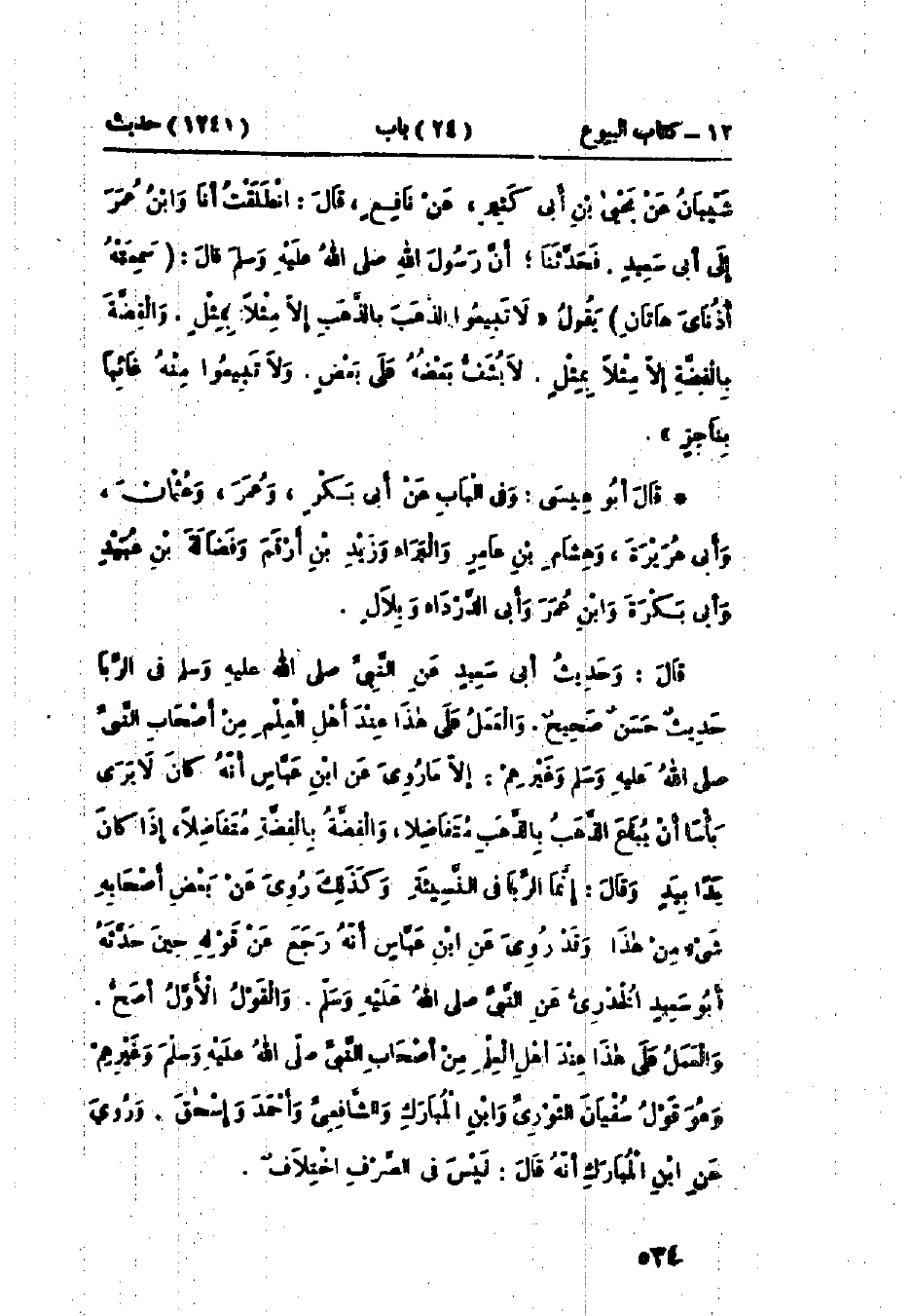 1241 - حَدَّثَنَا أَحْمَدُ بْنُ مَنِيعٍ قَالَ: أَخْبَرَنَا حُسَيْنُ بْنُ مُحَمَّدٍ قَالَ: أَخْبَرَنَا -[535]- شَيبَانُ، عَنْ يَحْيَى بْنِ أَبِي كَثِيرٍ، عَنْ نَافِعٍ، قَالَ: انْطَلَقْتُ أَنَا وَابْنُ عُمَرَ إِلَى أَبِي سَعِيدٍ فَحَدَّثَنَا، أَنَّ رَسُولَ اللَّهِ صَلَّى اللَّهُ عَلَيْهِ وَسَلَّمَ قَالَ: سَمِعَتْهُ أُذُنَايَ هَاتَانِ يَقُولُ: «§لَا تَبِيعُوا الذَّهَبَ بِالذَّهَبِ إِلَّا مِثْلًا بِمِثْلٍ، وَالفِضَّةَ بِالفِضَّةِ إِلَّا مِثْلًا بِمِثْلٍ، لَا يُشَفُّ بَعْضُهُ عَلَى بَعْضٍ، وَلَا تَبِيعُوا مِنْهُ غَائِبًا بِنَاجِزٍ»: وَفِي البَابِ عَنْ أَبِي بَكْرٍ، وَعُمَرَ، وَعُثْمَانَ، وَأَبِي هُرَيْرَةَ، وَهِشَامِ بْنِ عَامِرٍ، وَالبَرَاءِ، وَزَيْدِ بْنِ أَرْقَمَ، وَفَضَالَةَ بْنِ عُبَيْدٍ، وَأَبِي بَكْرَةَ، وَابْنِ عُمَرَ، وَأَبِي الدَّرْدَاءِ، وَبِلَالٍ وَحَدِيثُ أَبِي سَعِيدٍ عَنِ النَّبِيِّ صَلَّى اللَّهُ عَلَيْهِ وَسَلَّمَ فِي الرِّبَا حَدِيثٌ حَسَنٌ صَحِيحٌ، وَالعَمَلُ عَلَى هَذَا عِنْدَ أَهْلِ العِلْمِ مِنْ أَصْحَابِ النَّبِيِّ صَلَّى اللَّهُ عَلَيْهِ وَسَلَّمَ وَغَيْرِهِمْ إِلَّا مَا رُوِيَ عَنْ ابْنِ عَبَّاسٍ، أَنَّهُ كَانَ لَا يَرَى بَأْسًا أَنْ يُبَاعَ الذَّهَبُ بِالذَّهَبِ مُتَفَاضِلًا، وَالفِضَّةُ بِالفِضَّةِ مُتَفَاضِلًا، إِذَا كَانَ يَدًا بِيَدٍ، وقَالَ: " إِنَّمَا الرِّبَا فِي النَّسِيئَةِ، وَكَذَلِكَ رُوِيَ عَنْ بَعْضِ أَصْحَابِهِ شَيْءٌ مِنْ هَذَا، وَقَدْ رُوِيَ عَنْ ابْنِ عَبَّاسٍ أَنَّهُ رَجَعَ عَنْ قَوْلِهِ حِينَ حَدَّثَهُ أَبُو سَعِيدٍ الخُدْرِيُّ عَنِ النَّبِيِّ صَلَّى اللَّهُ عَلَيْهِ وَسَلَّمَ، وَالقَوْلُ الأَوَّلُ أَصَحُّ وَالعَمَلُ عَلَى هَذَا عِنْدَ أَهْلِ العِلْمِ مِنْ أَصْحَابِ النَّبِيِّ صَلَّى اللَّهُ عَلَيْهِ وَسَلَّمَ وَغَيْرِهِمْ، وَهُوَ قَوْلُ سُفْيَانَ الثَّوْرِيِّ، وَابْنِ المُبَارَكِ، وَالشَّافِعِيِّ، وَأَحْمَدَ، وَإِسْحَاقَ وَرُوِيَ عَنْ ابْنِ المُبَارَكِ أَنَّهُ قَالَ: «لَيْسَ فِي الصَّرْفِ اخْتِلَافٌ»