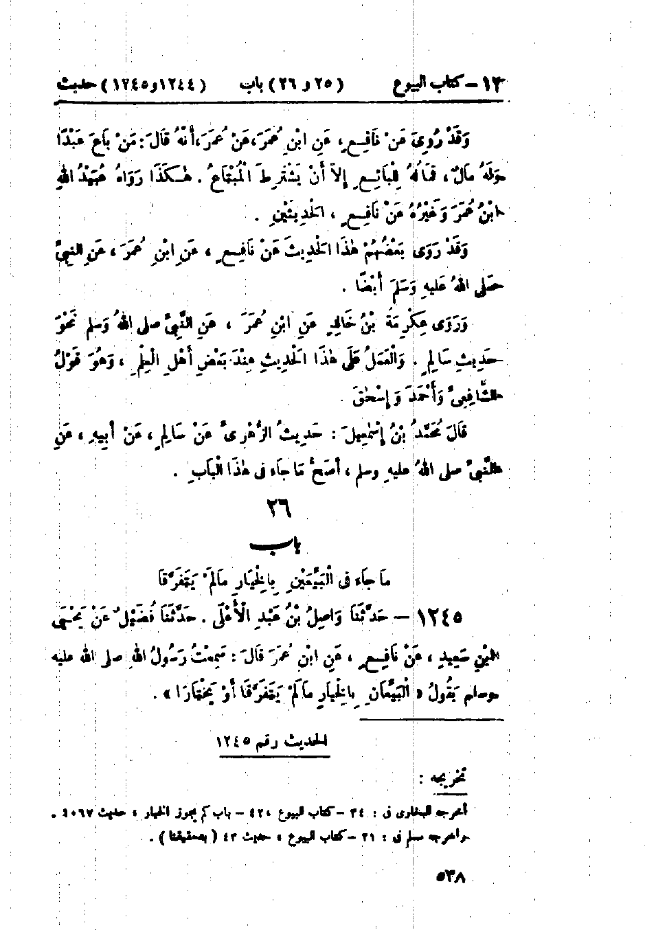 1244 - حَدَّثَنَا قُتَيْبَةُ قَالَ: حَدَّثَنَا اللَّيْثُ، عَنْ ابْنِ شِهَابٍ، عَنْ سَالِمٍ، عَنْ أَبِيهِ قَالَ: سَمِعْتُ رَسُولَ اللَّهِ صَلَّى اللَّهُ عَلَيْهِ وَسَلَّمَ يَقُولُ: «§مَنْ ابْتَاعَ نَخْلًا بَعْدَ أَنْ تُؤَبَّرَ فَثَمَرَتُهَا لِلَّذِي بَاعَهَا إِلَّا أَنْ يَشْتَرِطَ المُبْتَاعُ، وَمَنْ ابْتَاعَ عَبْدًا وَلَهُ مَالٌ فَمَالُهُ لِلَّذِي بَاعَهُ إِلَّا أَنْ يَشْتَرِطَ المُبْتَاعُ» وَفِي البَابِ عَنْ جَابِرٍ وَحَدِيثُ ابْنِ عُمَرَ حَدِيثٌ حَسَنٌ صَحِيحٌ، هَكَذَا رُوِيَ مِنْ غَيْرِ وَجْهٍ عَنِ الزُّهْرِيِّ، عَنْ سَالِمٍ، عَنْ ابْنِ عُمَرَ، عَنِ النَّبِيِّ صَلَّى اللَّهُ عَلَيْهِ وَسَلَّمَ أَنَّهُ قَالَ: «مَنْ ابْتَاعَ نَخْلًا بَعْدَ أَنْ تُؤَبَّرَ، فَثَمَرَتُهَا لِلْبَائِعِ إِلَّا أَنْ يَشْتَرِطَ المُبْتَاعُ، وَمَنْ بَاعَ عَبْدًا وَلَهُ مَالٌ فَمَالُهُ لِلَّذِي بَاعَهُ إِلَّا أَنْ يَشْتَرِطَ المُبْتَاعُ» وَقَدْ رُوِيَ، عَنْ نَافِعٍ، عَنْ ابْنِ عُمَرَ، عَنِ النَّبِيِّ صَلَّى اللَّهُ عَلَيْهِ وَسَلَّمَ قَالَ: «مَنْ ابْتَاعَ نَخْلًا قَدْ أُبِّرَتْ فَثَمَرَتُهَا لِلْبَائِعِ إِلَّا أَنْ يَشْتَرِطَ المُبْتَاعُ» -[539]- وَقَدْ رُوِيَ، عَنْ نَافِعٍ، عَنْ ابْنِ عُمَرَ، عَنْ عُمَرَ أَنَّهُ قَالَ: «مَنْ بَاعَ عَبْدًا وَلَهُ مَالٌ فَمَالُهُ لِلْبَائِعِ إِلَّا أَنْ يَشْتَرِطَ المُبْتَاعُ»، هَكَذَا رَوَاهُ عُبَيْدُ اللَّهِ بْنُ عُمَرَ، وَغَيْرُهُ، عَنْ نَافِعٍ الحَدِيثَيْنِ، وَقَدْ رَوَى بَعْضُهُمْ هَذَا الحَدِيثَ، عَنْ نَافِعٍ، عَنْ ابْنِ عُمَرَ، عَنِ النَّبِيِّ صَلَّى اللَّهُ عَلَيْهِ وَسَلَّمَ أَيْضًا، وَرَوَى عِكْرِمَةُ بْنُ خَالِدٍ، عَنْ ابْنِ عُمَرَ، عَنِ النَّبِيِّ صَلَّى اللَّهُ عَلَيْهِ وَسَلَّمَ نَحْوَ حَدِيثِ سَالِمٍ وَالعَمَلُ عَلَى هَذَا الحَدِيثِ عِنْدَ بَعْضِ أَهْلِ العِلْمِ، وَهُوَ قَوْلُ الشَّافِعِيِّ، وَأَحْمَدَ، وَإِسْحَاقَ قَالَ مُحَمَّدُ بْنُ إِسْمَاعِيلَ: حَدِيثُ الزُّهْرِيِّ، عَنْ سَالِمٍ، عَنْ أَبِيهِ، عَنِ النَّبِيِّ صَلَّى اللَّهُ عَلَيْهِ وَسَلَّمَ أَصَحُّ مَا جَاءَ فِي هَذَا البَابِ