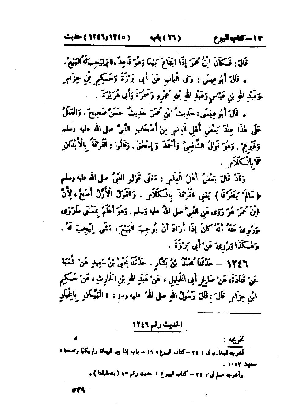 1245 - حَدَّثَنَا وَاصِلُ بْنُ عَبْدِ الأَعْلَى قَالَ: حَدَّثَنَا مُحَمَّدُ بْنُ فُضَيْلٍ، عَنْ يَحْيَى بْنِ سَعِيدٍ، عَنْ نَافِعٍ، عَنْ ابْنِ عُمَرَ قَالَ: سَمِعْتُ رَسُولَ اللَّهِ صَلَّى اللَّهُ عَلَيْهِ وَسَلَّمَ يَقُولُ: «§البَيِّعَانِ بِالخِيَارِ مَا لَمْ يَتَفَرَّقَا أَوْ يَخْتَارَا» -[540]- قَالَ: «فَكَانَ ابْنُ عُمَرَ إِذَا ابْتَاعَ بَيْعًا وَهُوَ قَاعِدٌ قَامَ لِيَجِبَ لَهُ البَيْعُ»: وَفِي البَابِ عَنْ أَبِي بَرْزَةَ، وَحَكِيمِ بْنِ حِزَامٍ، وَعَبْدِ اللَّهِ بْنِ عَبَّاسٍ، وَعَبْدِ اللَّهِ بْنِ عَمْرٍو، وَسَمُرَةَ، وَأَبِي هُرَيْرَةَ: «حَدِيثُ ابْنِ عُمَرَ حَدِيثٌ حَسَنٌ صَحِيحٌ» وَالعَمَلُ عَلَى هَذَا عِنْدَ بَعْضِ أَهْلِ العِلْمِ مِنْ أَصْحَابِ النَّبِيِّ صَلَّى اللَّهُ عَلَيْهِ وَسَلَّمَ وَغَيْرِهِمْ، وَهُوَ قَوْلُ الشَّافِعِيِّ، وَأَحْمَدَ، وَإِسْحَاقَ، وَقَالُوا: «الفُرْقَةُ بِالأَبْدَانِ لَا بِالكَلَامِ» وَقَدْ قَالَ بَعْضُ أَهْلِ العِلْمِ: مَعْنَى قَوْلِ النَّبِيِّ صَلَّى اللَّهُ عَلَيْهِ وَسَلَّمَ «مَا لَمْ يَتَفَرَّقَا»، يَعْنِي: الفُرْقَةَ بِالكَلَامِ، وَالقَوْلُ الأَوَّلُ أَصَحُّ لِأَنَّ ابْنَ عُمَرَ هُوَ رَوَى عَنِ النَّبِيِّ صَلَّى اللَّهُ عَلَيْهِ وَسَلَّمَ وَهُوَ أَعْلَمُ بِمَعْنَى مَا رَوَى وَرُوِيَ عَنْهُ أَنَّهُ كَانَ إِذَا أَرَادَ أَنْ يُوجِبَ البَيْعَ مَشَى لِيَجِبَ لَهُ، وَهَكَذَا رُوِيَ عَنْ أَبِي بَرْزَةَ