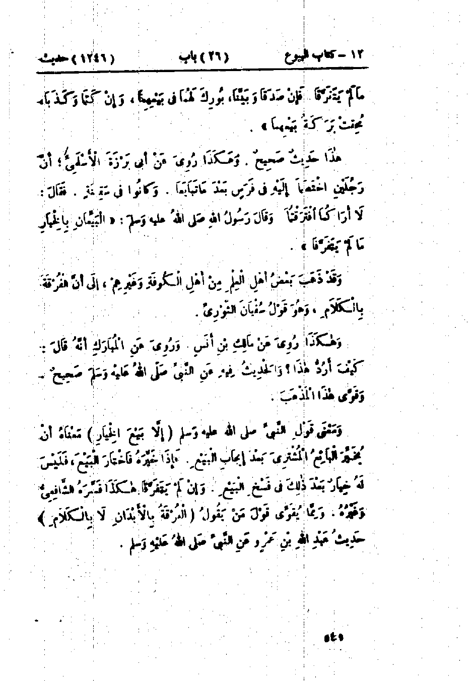 1246 - حَدَّثَنَا مُحَمَّدُ بْنُ بَشَّارٍ قَالَ: حَدَّثَنَا يَحْيَى بْنُ سَعِيدٍ، عَنْ شُعْبَةَ، عَنْ قَتَادَةَ، عَنْ صَالِحٍ أَبِي الخَلِيلِ، عَنْ عَبْدِ اللَّهِ بْنِ الحَارِثِ، عَنْ حَكِيمِ بْنِ حِزَامٍ، قَالَ: قَالَ رَسُولُ اللَّهِ صَلَّى اللَّهُ عَلَيْهِ وَسَلَّمَ: «§البَيِّعَانِ بِالخِيَارِ -[541]- مَا لَمْ يَتَفَرَّقَا، فَإِنْ صَدَقَا وَبَيَّنَا بُورِكَ لَهُمَا فِي بَيْعِهِمَا، وَإِنْ كَتَمَا وَكَذَبَا مُحِقَتْ بَرَكَةُ بَيْعِهِمَا» هَذَا حَدِيثٌ صَحِيحٌ
