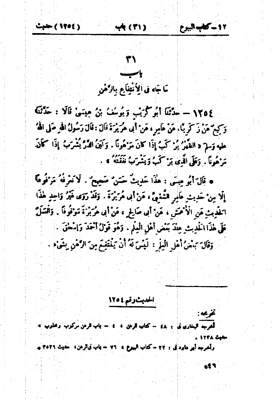 1253 - حَدَّثَنَا ابْنُ أَبِي عُمَرَ قَالَ: حَدَّثَنَا وَكِيعٌ، عَنْ زَكَرِيَّا، عَنْ الشَّعْبِيِّ، عَنْ جَابِرِ بْنِ عَبْدِ اللَّهِ أَنَّهُ «§بَاعَ مِنَ النَّبِيِّ صَلَّى اللَّهُ عَلَيْهِ وَسَلَّمَ بَعِيرًا وَاشْتَرَطَ ظَهْرَهُ إِلَى أَهْلِهِ»: هَذَا حَدِيثٌ حَسَنٌ صَحِيحٌ، وَقَدْ رُوِيَ مِنْ غَيْرِ وَجْهٍ عَنْ جَابِرٍ وَالعَمَلُ عَلَى هَذَا عِنْدَ بَعْضِ أَهْلِ العِلْمِ مِنْ أَصْحَابِ النَّبِيِّ صَلَّى اللَّهُ عَلَيْهِ وَسَلَّمَ وَغَيْرِهِمْ: يَرَوْنَ الشَّرْطَ فِي البَيْعِ جَائِزًا إِذَا كَانَ شَرْطًا وَاحِدًا، وَهُوَ قَوْلُ أَحْمَدَ، وَإِسْحَاقَ وقَالَ بَعْضُ أَهْلِ العِلْمِ: لَا يَجُوزُ الشَّرْطُ فِي البَيْعِ، وَلَا يَتِمُّ البَيْعُ إِذَا كَانَ فِيهِ شَرْطٌ