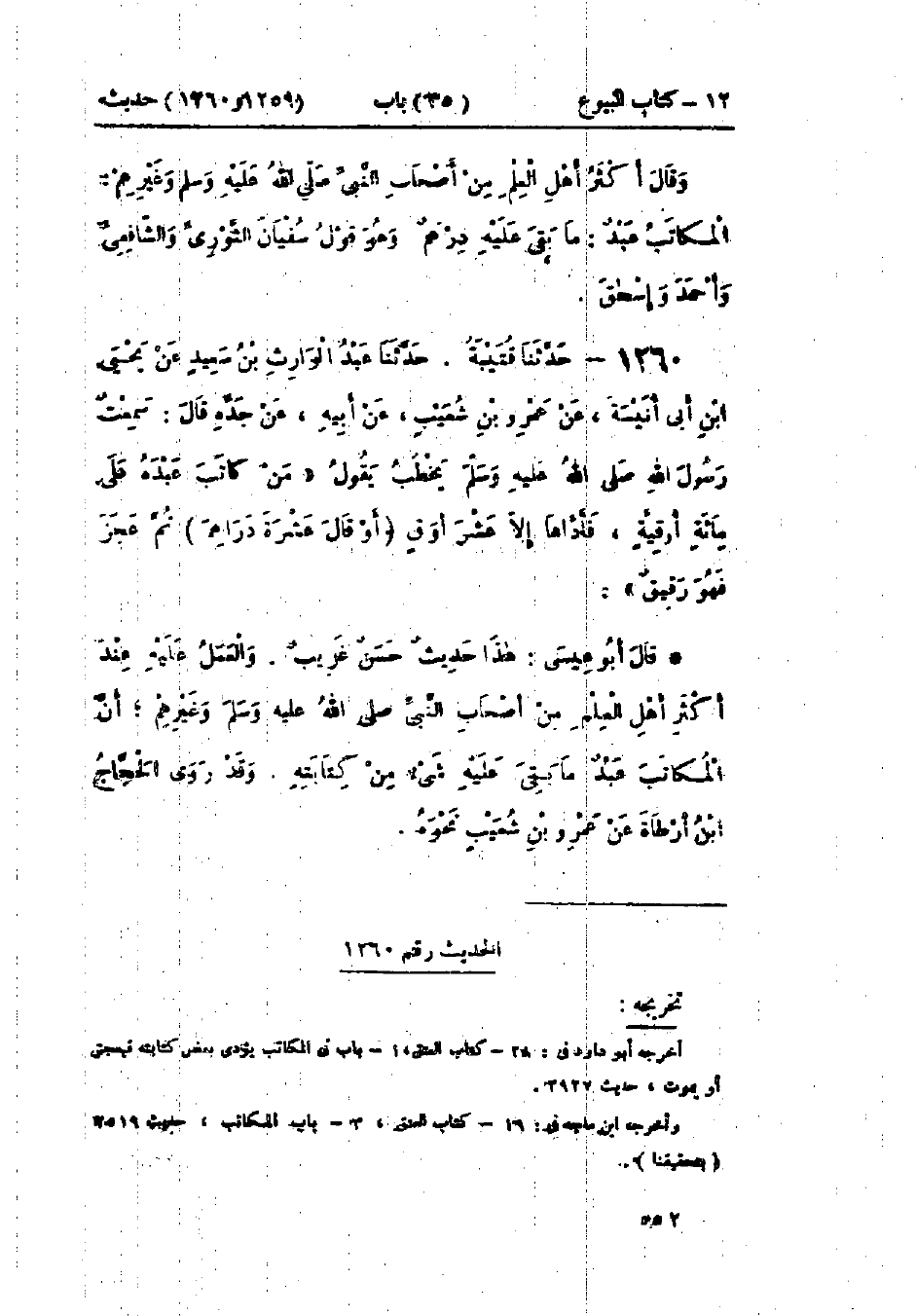 1259 - حَدَّثَنَا هَارُونُ بْنُ عَبْدِ اللَّهِ البَزَّارُ قَالَ: حَدَّثَنَا يَزِيدُ بْنُ هَارُونَ قَالَ: أَخْبَرَنَا حَمَّادُ بْنُ سَلَمَةَ، عَنْ أَيُّوبَ، عَنْ عِكْرِمَةَ، عَنْ ابْنِ عَبَّاسٍ، عَنِ النَّبِيِّ صَلَّى اللَّهُ عَلَيْهِ وَسَلَّمَ قَالَ: «§إِذَا أَصَابَ المُكَاتَبُ حَدًّا أَوْ مِيرَاثًا وَرِثَ بِحِسَابِ مَا عَتَقَ مِنْهُ» وقَالَ النَّبِيُّ صَلَّى اللَّهُ عَلَيْهِ وَسَلَّمَ: «يُؤَدِّي المُكَاتَبُ بِحِصَّةِ مَا أَدَّى دِيَةَ حُرٍّ، وَمَا بَقِيَ دِيَةَ عَبْدٍ» وَفِي البَابِ عَنْ أُمِّ سَلَمَةَ: حَدِيثُ ابْنِ عَبَّاسٍ حَدِيثٌ حَسَنٌ وَهَكَذَا رَوَى يَحْيَى بْنُ أَبِي كَثِيرٍ، عَنْ عِكْرِمَةَ، عَنْ ابْنِ عَبَّاسٍ، عَنِ النَّبِيِّ صَلَّى اللَّهُ عَلَيْهِ وَسَلَّمَ، وَرَوَى خَالِدٌ الحَذَّاءُ، عَنْ عِكْرِمَةَ، عَنْ عَلِيٍّ قَوْلَهُ وَالعَمَلُ عَلَى هَذَا الحَدِيثِ عِنْدَ بَعْضِ أَهْلِ العِلْمِ مِنْ أَصْحَابِ النَّبِيِّ صَلَّى اللَّهُ عَلَيْهِ وَسَلَّمَ وَغَيْرِهِمْ، -[553]- وقَالَ أَكْثَرُ أَهْلِ العِلْمِ مِنْ أَصْحَابِ النَّبِيِّ صَلَّى اللَّهُ عَلَيْهِ وَسَلَّمَ وَغَيْرِهِمْ: المُكَاتَبُ عَبْدٌ مَا بَقِيَ عَلَيْهِ دِرْهَمٌ، وَهُوَ قَوْلُ سُفْيَانَ الثَّوْرِيِّ، وَالشَّافِعِيِّ، وَأَحْمَدَ، وَإِسْحَاقَ