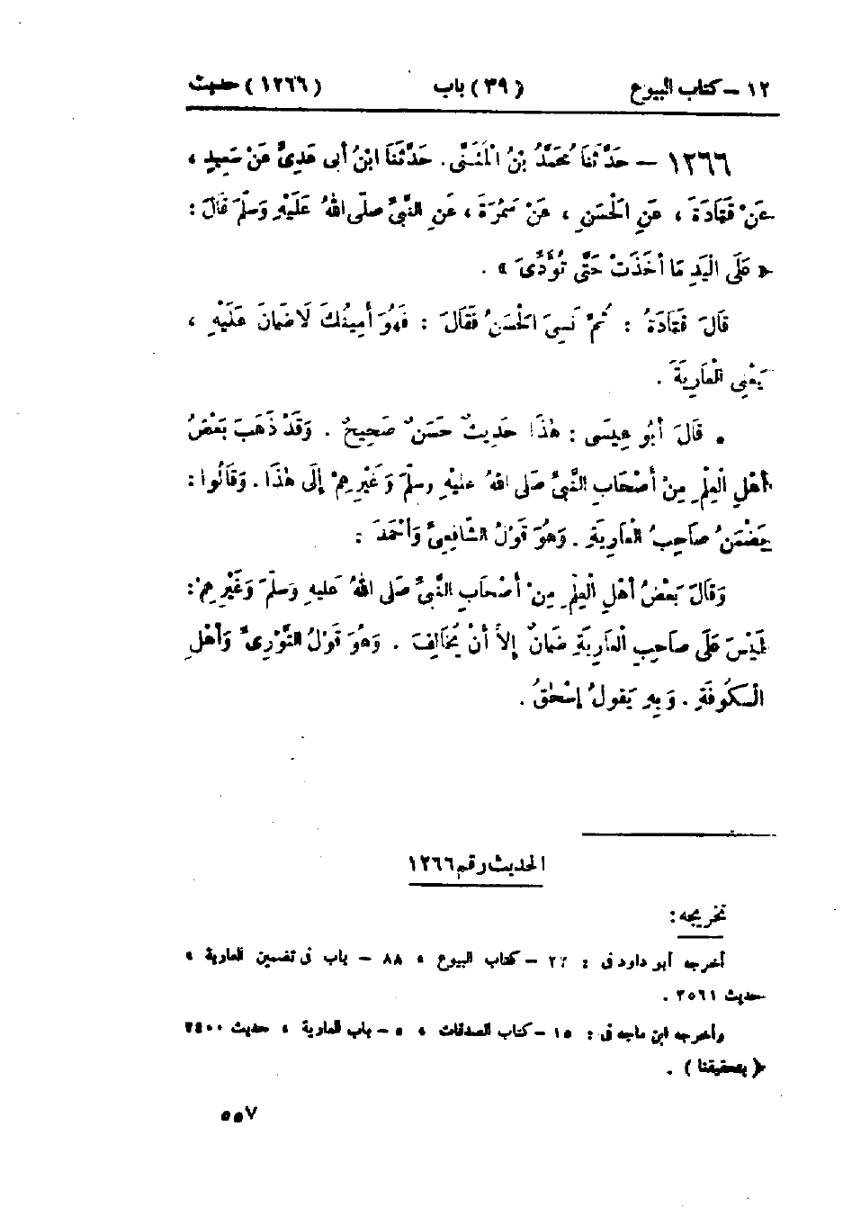 1265 - حَدَّثَنَا هَنَّادٌ، وَعَلِيُّ بْنُ حُجْرٍ، قَالَا: حَدَّثَنَا إِسْمَاعِيلُ بْنُ عَيَّاشٍ، عَنْ شُرَحْبِيلَ بْنِ مُسْلِمٍ الخَوْلَانِيِّ، عَنْ أَبِي أُمَامَةَ قَالَ: سَمِعْتُ النَّبِيَّ صَلَّى اللَّهُ عَلَيْهِ وَسَلَّمَ يَقُولُ فِي الخُطْبَةِ عَامَ حَجَّةِ الوَدَاعِ: «§العَارِيَةُ مُؤَدَّاةٌ، وَالزَّعِيمُ غَارِمٌ، وَالدَّيْنُ مَقْضِيٌّ»: وَفِي البَابِ عَنْ سَمُرَةَ، وَصَفْوَانَ بْنِ أُمَيَّةَ، وَأَنَسٍ وَحَدِيثُ أَبِي أُمَامَةَ حَدِيثٌ حَسَنٌ، وَقَدْ رُوِيَ عَنْ أَبِي أُمَامَةَ، عَنِ النَّبِيِّ صَلَّى اللَّهُ عَلَيْهِ وَسَلَّمَ أَيْضًا مِنْ غَيْرِ هَذَا الوَجْهِ