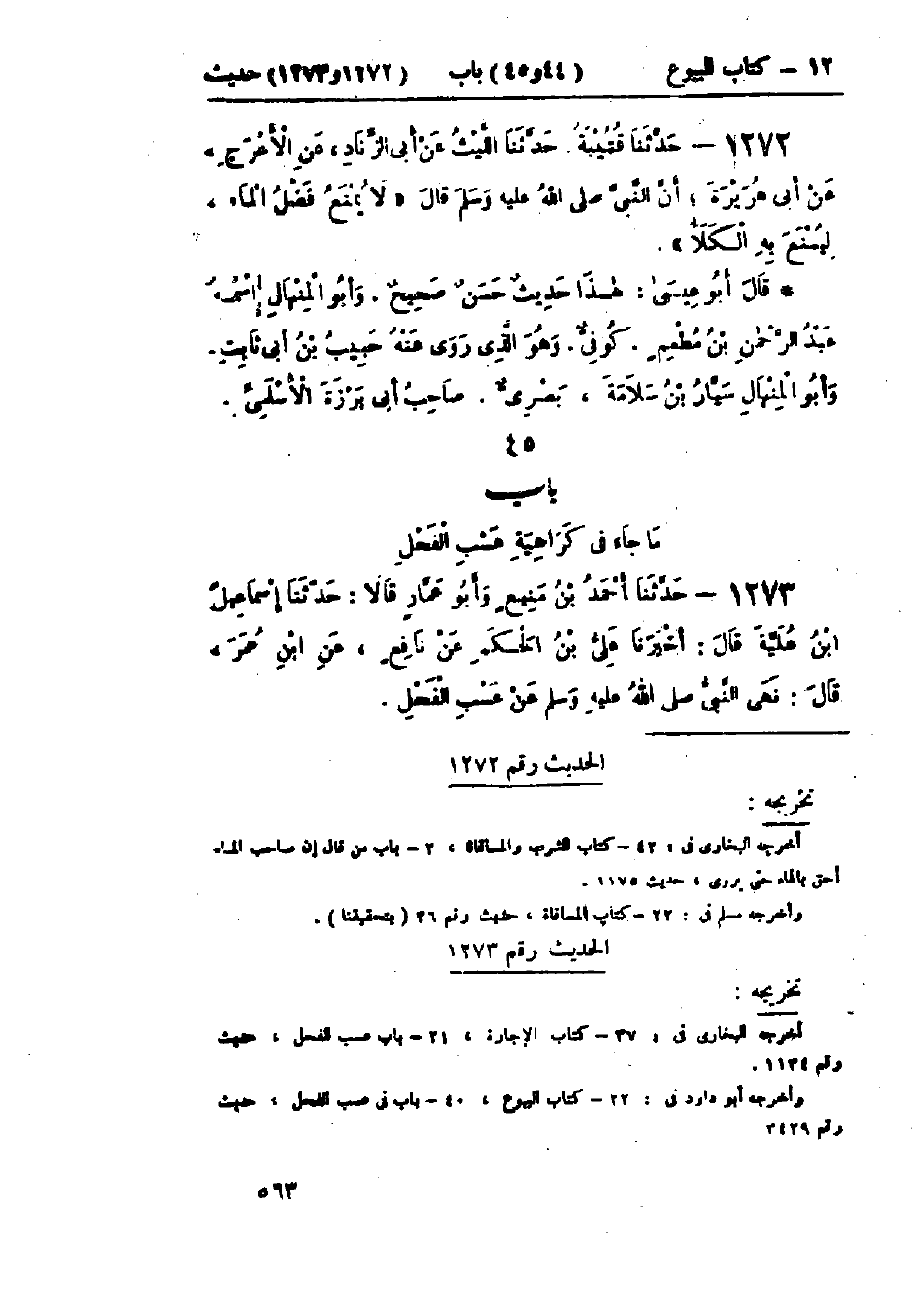 1271 - حَدَّثَنَا قُتَيْبَةُ قَالَ: حَدَّثَنَا دَاوُدُ بْنُ عَبْدِ الرَّحْمَنِ العَطَّارُ، عَنْ عَمْرِو بْنِ دِينَارٍ، عَنْ أَبِي المِنْهَالِ، عَنْ إِيَاسِ بْنِ عَبْدٍ المُزَنِيِّ قَالَ: «§نَهَى النَّبِيُّ صَلَّى اللَّهُ عَلَيْهِ وَسَلَّمَ عَنْ بَيْعِ المَاءِ» وَفِي البَابِ عَنْ جَابِرٍ، وَبُهَيْسَةَ، عَنْ أَبِيهَا، وَأَبِي هُرَيْرَةَ، وَعَائِشَةَ، وَأَنَسٍ، وَعَبْدِ اللَّهِ بْنِ عَمْرٍو: حَدِيثُ إِيَاسٍ حَدِيثٌ حَسَنٌ صَحِيحٌ وَالعَمَلُ عَلَى هَذَا عِنْدَ أَكْثَرِ أَهْلِ العِلْمِ أَنَّهُمْ كَرِهُوا بَيْعَ المَاءِ، وَهُوَ قَوْلُ ابْنِ المُبَارَكِ، وَالشَّافِعِيِّ، وَأَحْمَدَ، وَإِسْحَاقَ، وَقَدْ رَخَّصَ بَعْضُ أَهْلِ العِلْمِ فِي بَيْعِ المَاءِ مِنْهُمْ: الحَسَنُ البَصْرِيُّ